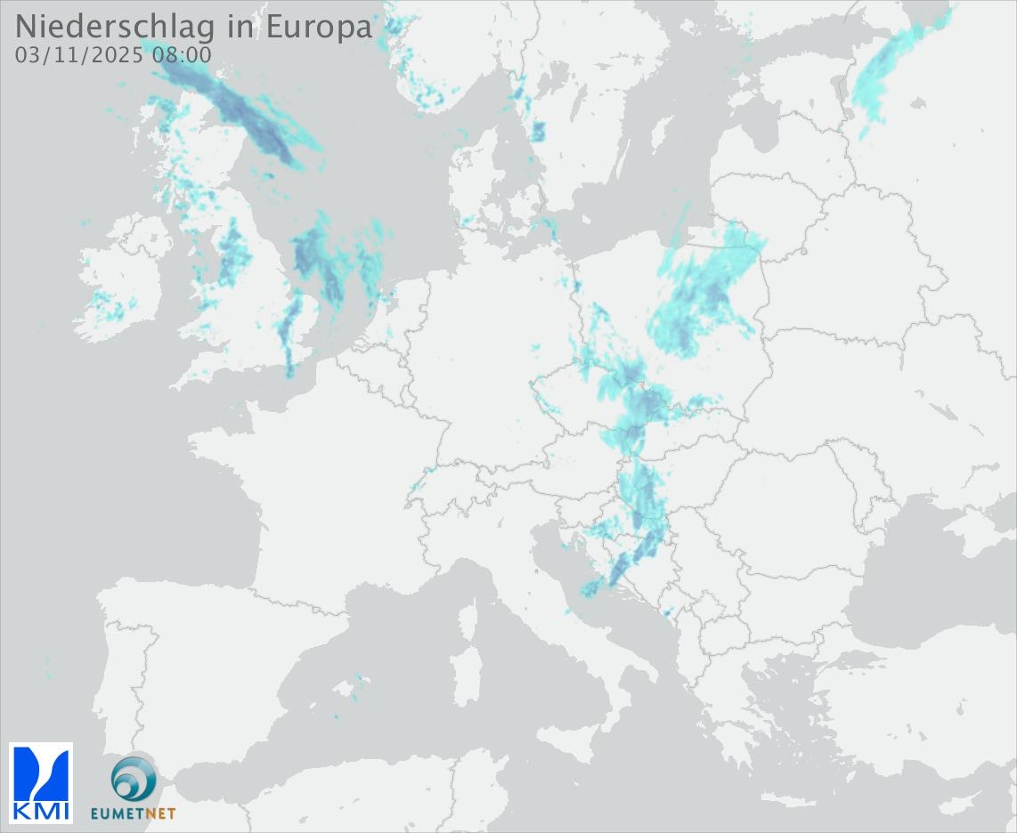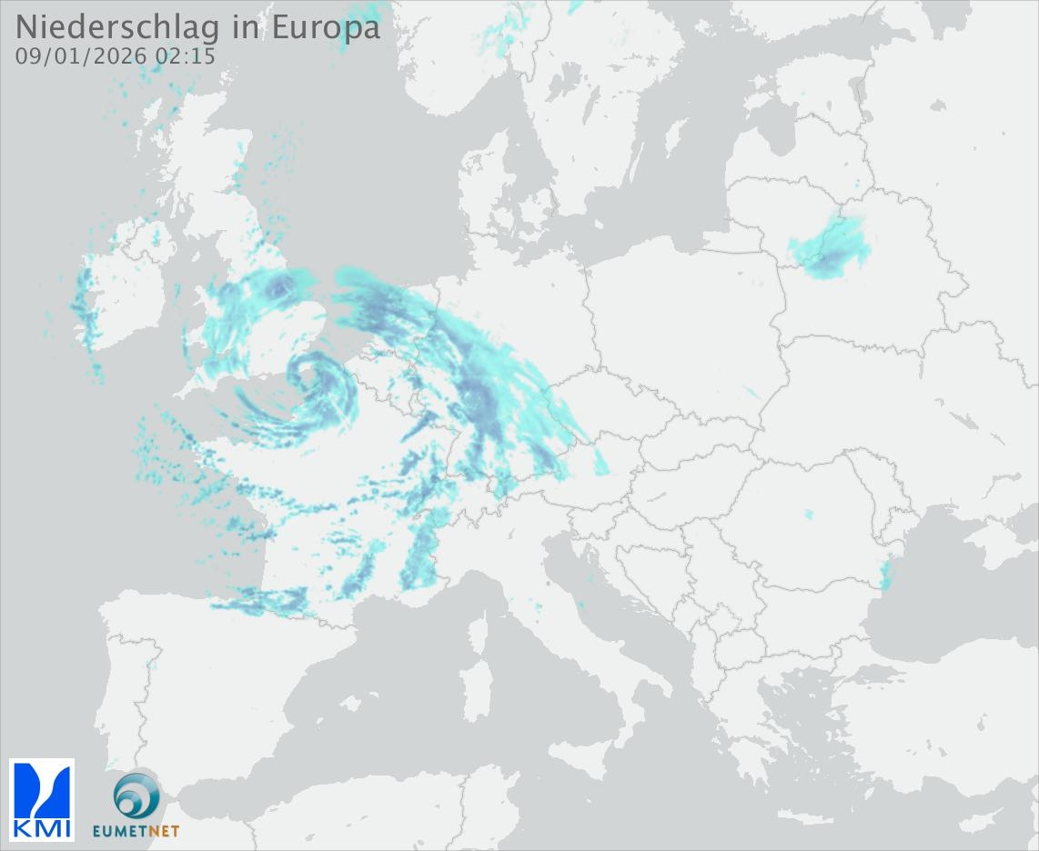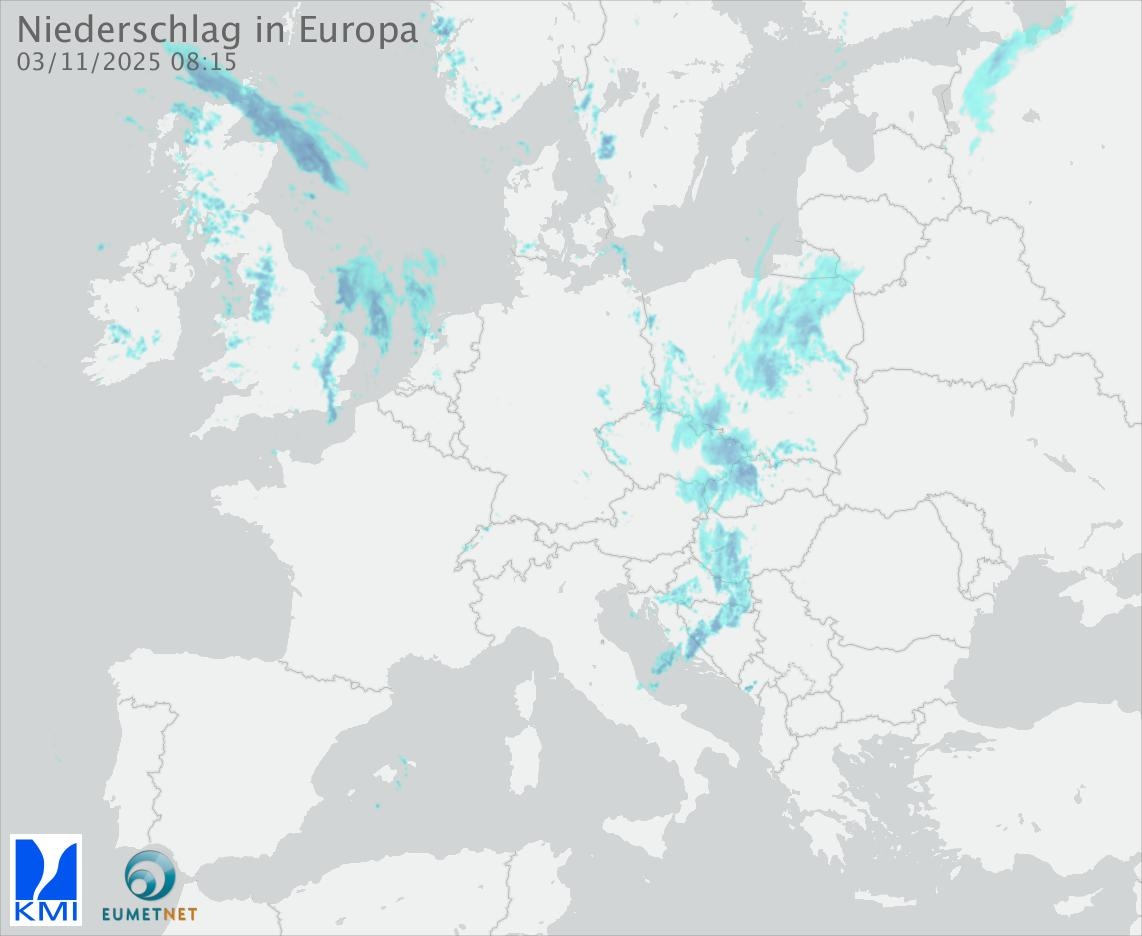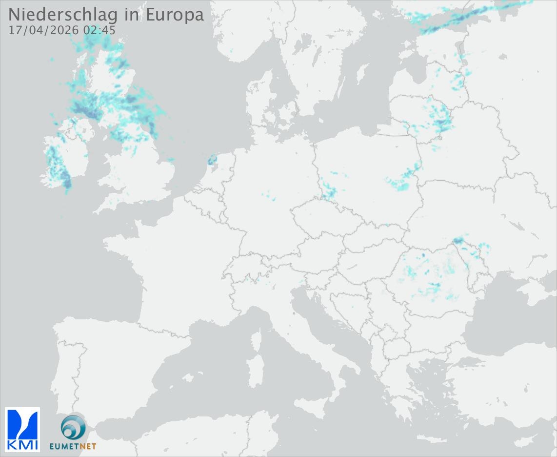 Diese Animation zeigt den gefallenen Niederschlag, gemessen durch die Regenradargeräte der europäischen Teilnehmer des Eumetnet-Programms OPERA (in 15-Minuten-Intervallen).