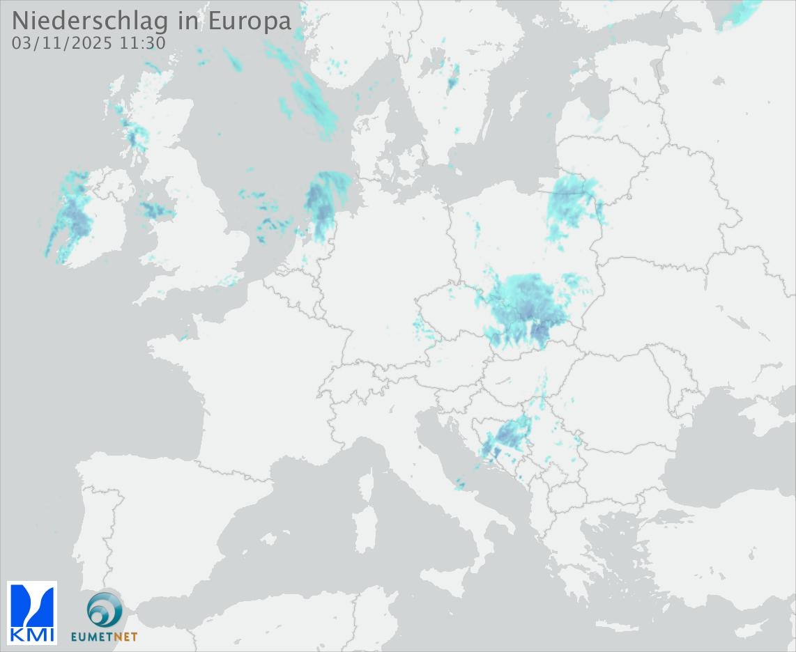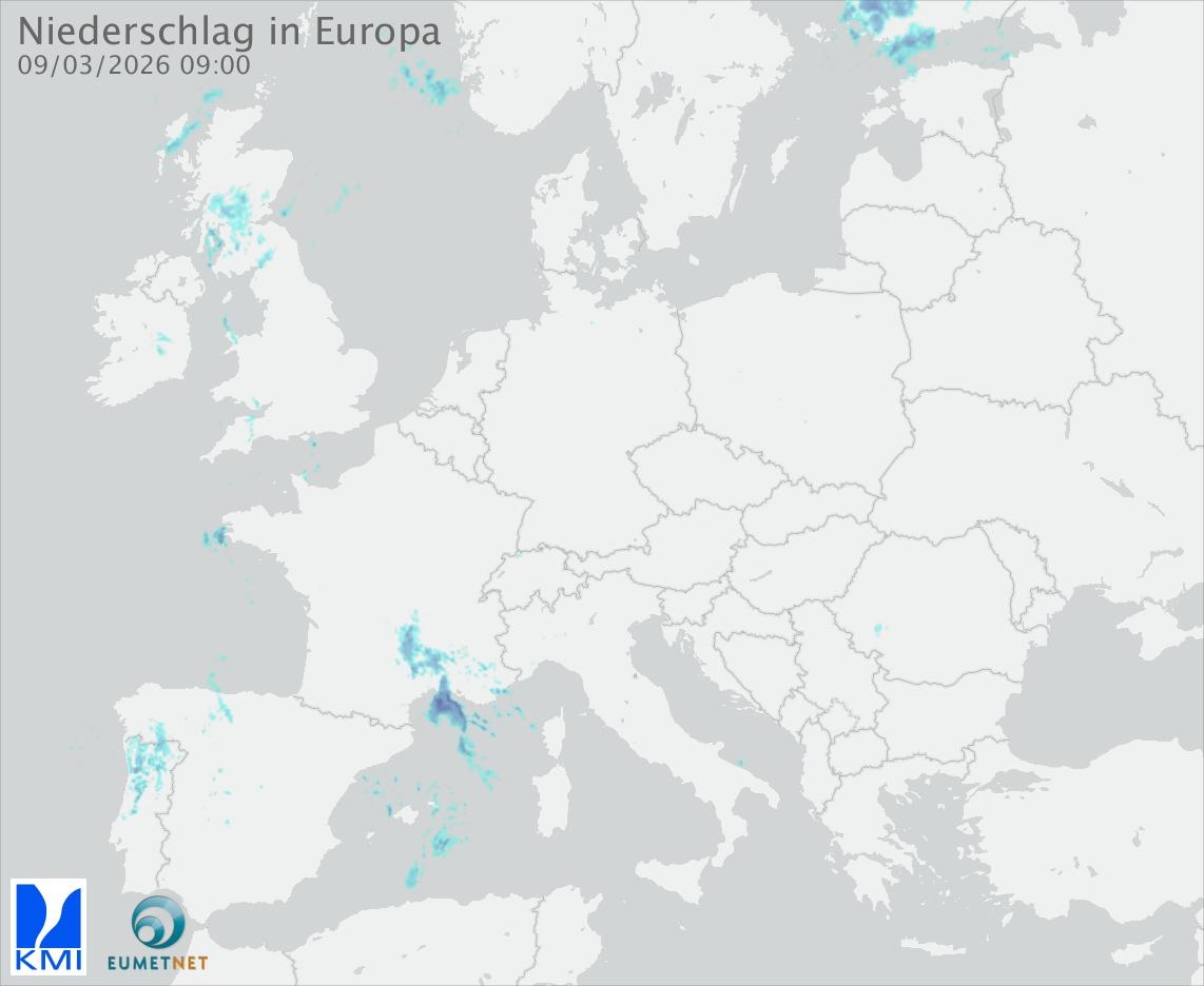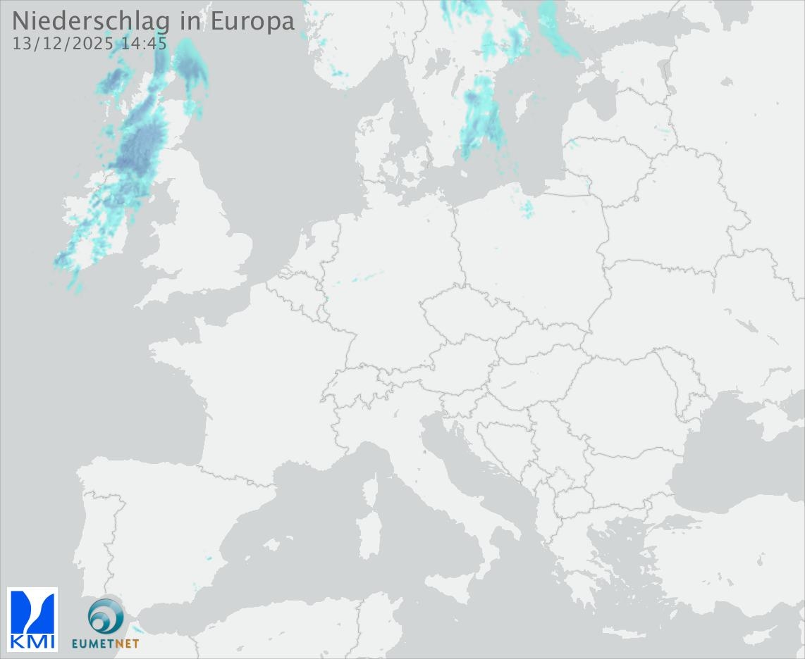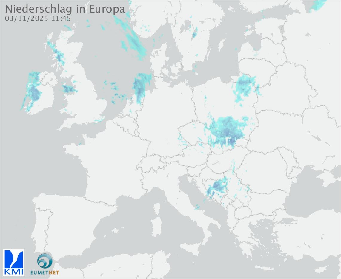 Diese Animation zeigt den gefallenen Niederschlag, gemessen durch die Regenradargeräte der europäischen Teilnehmer des Eumetnet-Programms OPERA (in 15-Minuten-Intervallen).