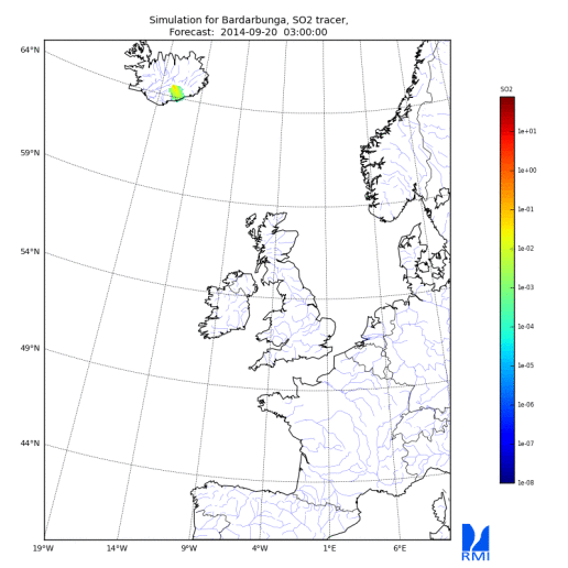 Example of a dispersion simulation for the Bardarbunga volcano (20/09/2014)