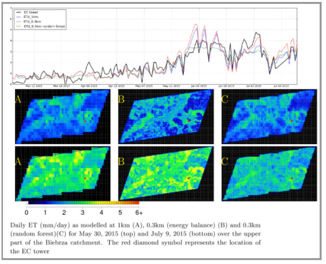 Estimates of daily ET have been derived at 1 km and 0.3 km spatial resolutions, i.e. over the grids of Proba-V 1 km and 0.3 km imagery. The ET estimates resulted from performing a pixel-based energy balance forced by satellite and meteorological data in addition to parameters related to the land cover classes. Furthermore, the 1 km estimates were statistically downscaled through Random Forest modelling. The seasonal patterns of vegetation were obtained from Proba-V observations and were key for achieving the target spatial resolutions. The study was performed in the upper basin of the Biebrza river, in Poland. The following Figure shows the modelled ET time series as contrasted with validation data obtained from an eddy covariance station as well as ET maps for two dates.