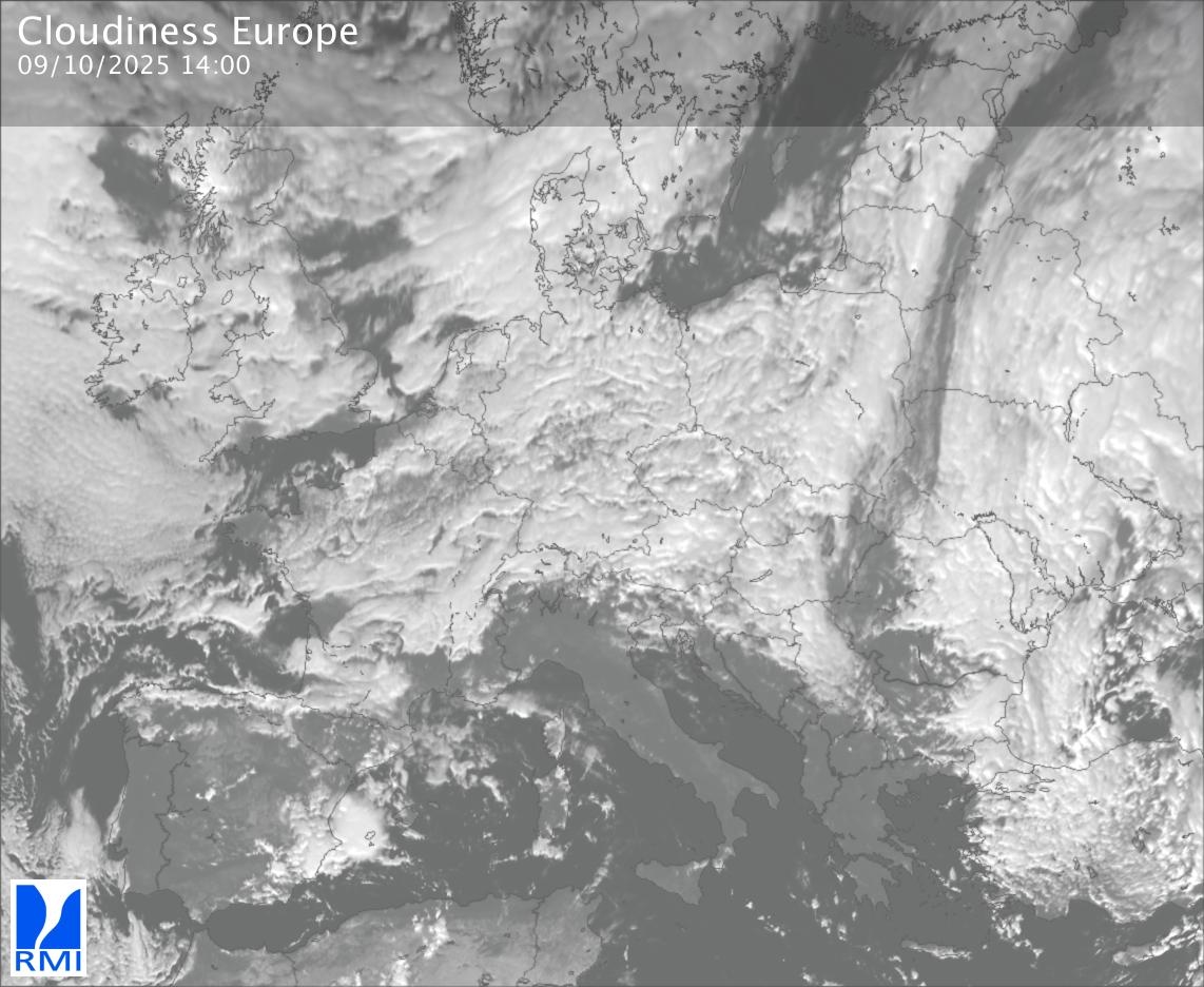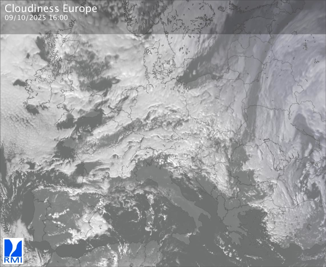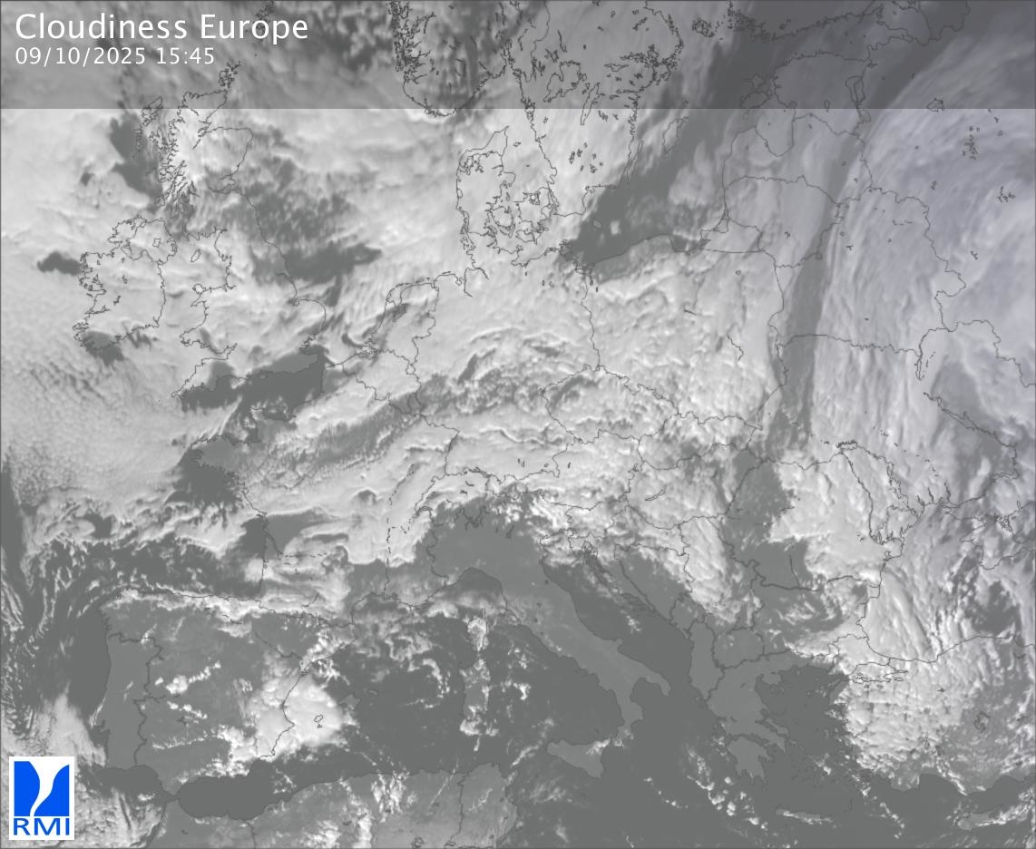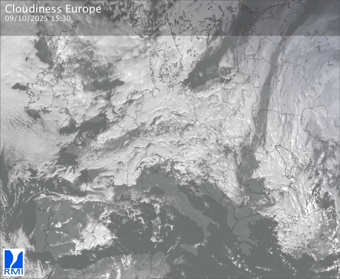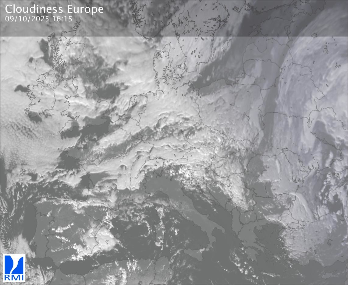 The satellite image of Europe is composed by using both the infrared and the visible light channel from the satellite. Because there are no usable visible light images during the night this composition of channels gives us an image that can be used to observe the clouds by day and by night. The pixelated artifacts are due to the lower resolution of the infrared channel.