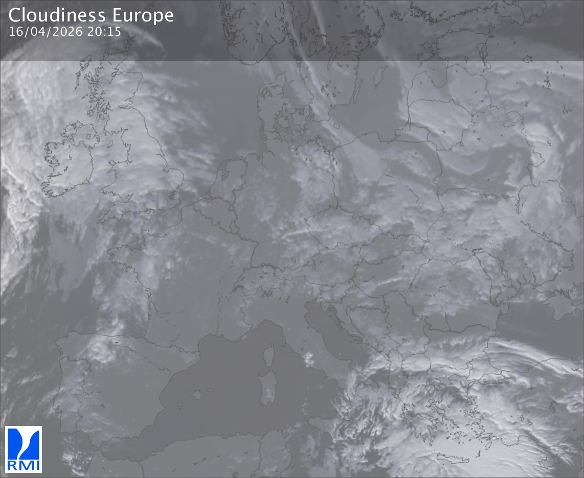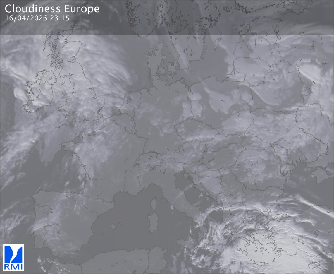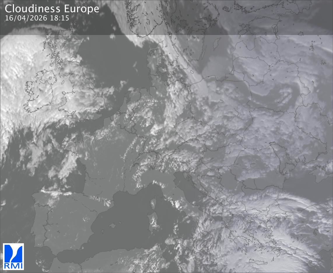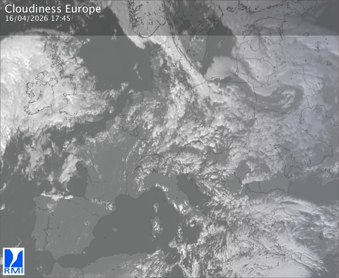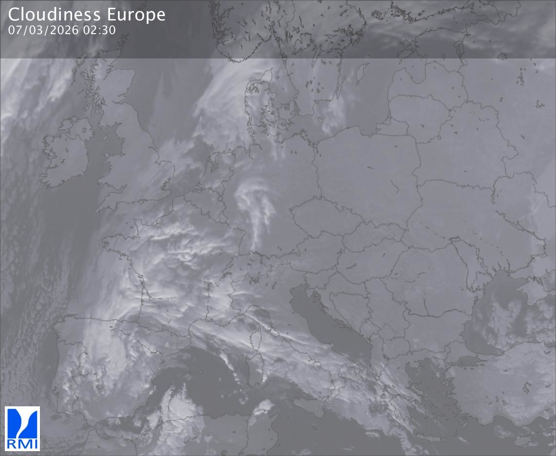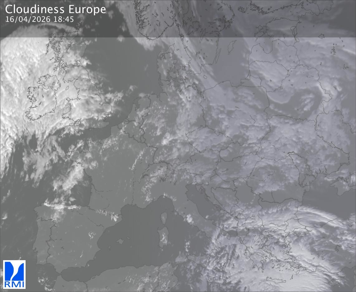 The satellite image of Europe is composed by using both the infrared and the visible light channel from the satellite. Because there are no usable visible light images during the night this composition of channels gives us an image that can be used to observe the clouds by day and by night. The pixelated artifacts are due to the lower resolution of the infrared channel.
