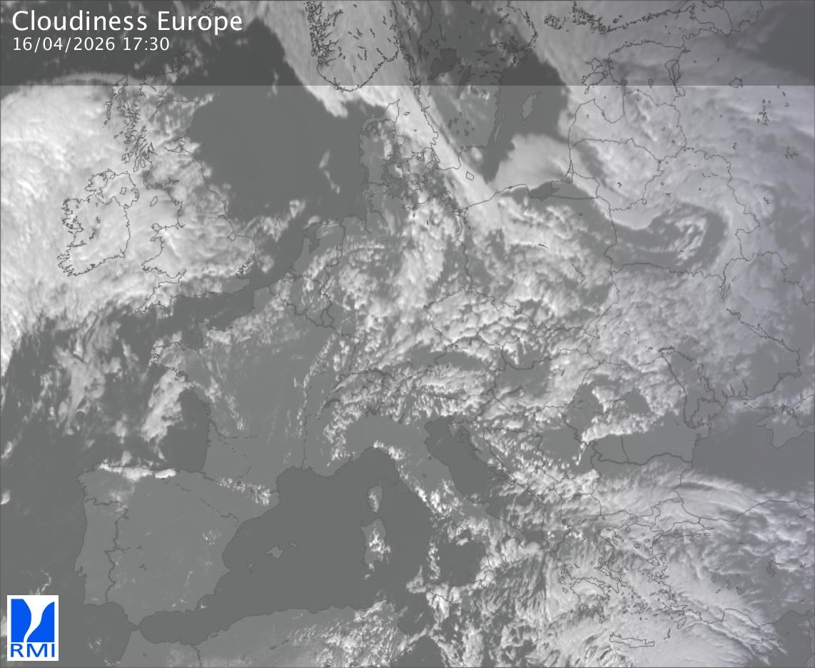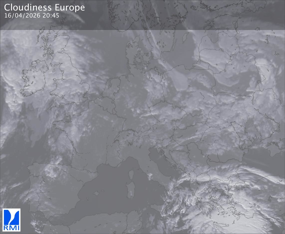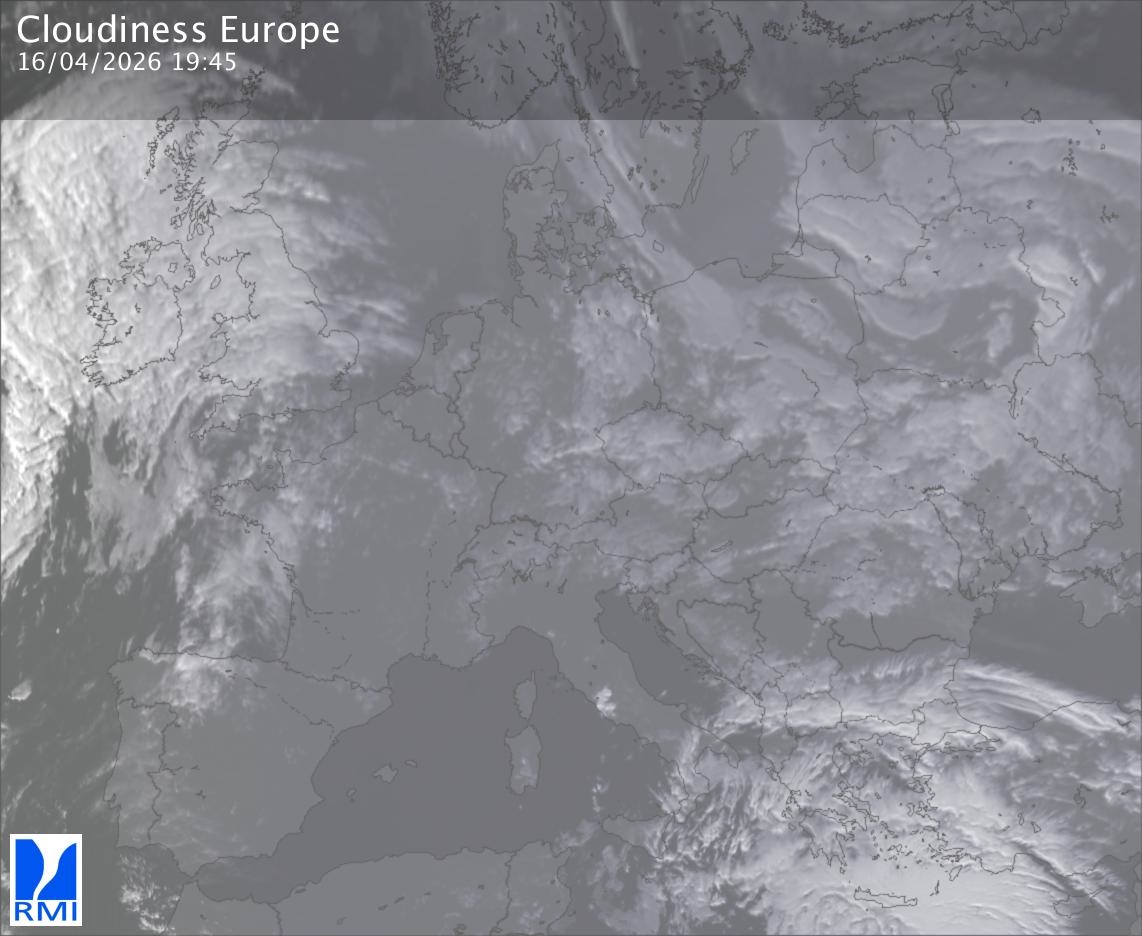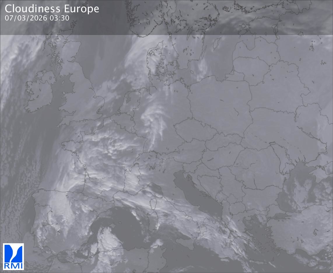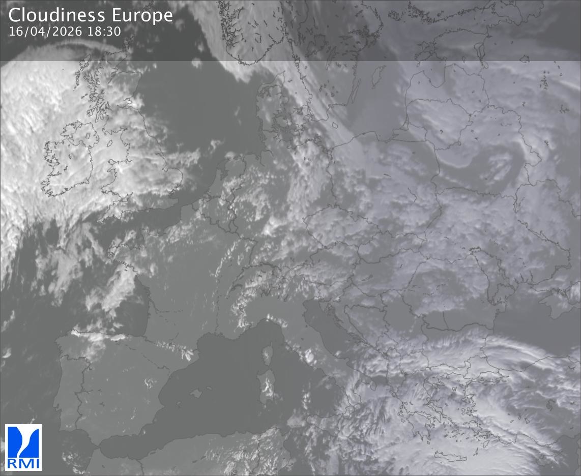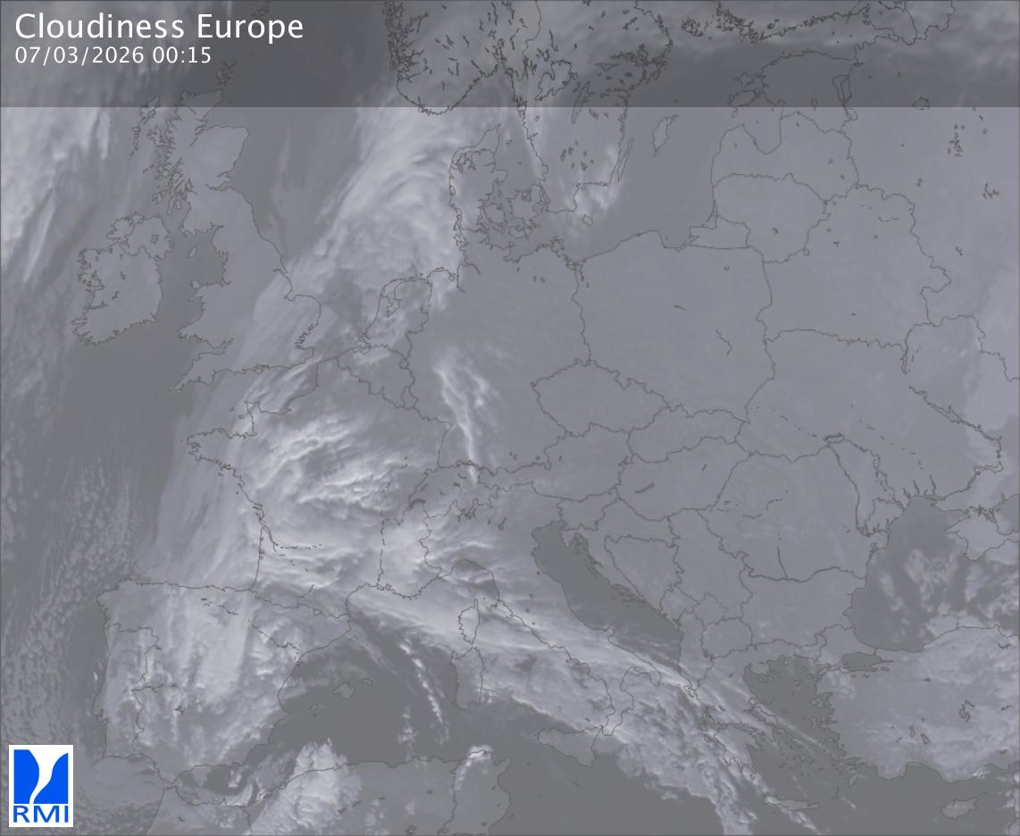 The satellite image of Europe is composed by using both the infrared and the visible light channel from the satellite. Because there are no usable visible light images during the night this composition of channels gives us an image that can be used to observe the clouds by day and by night. The pixelated artifacts are due to the lower resolution of the infrared channel.