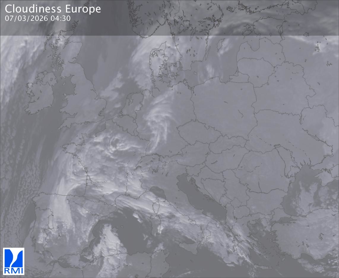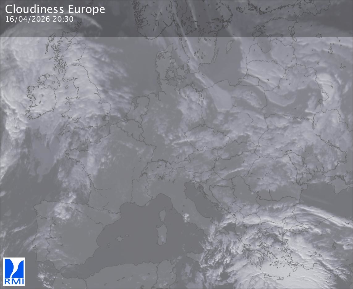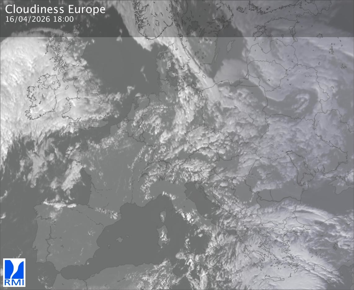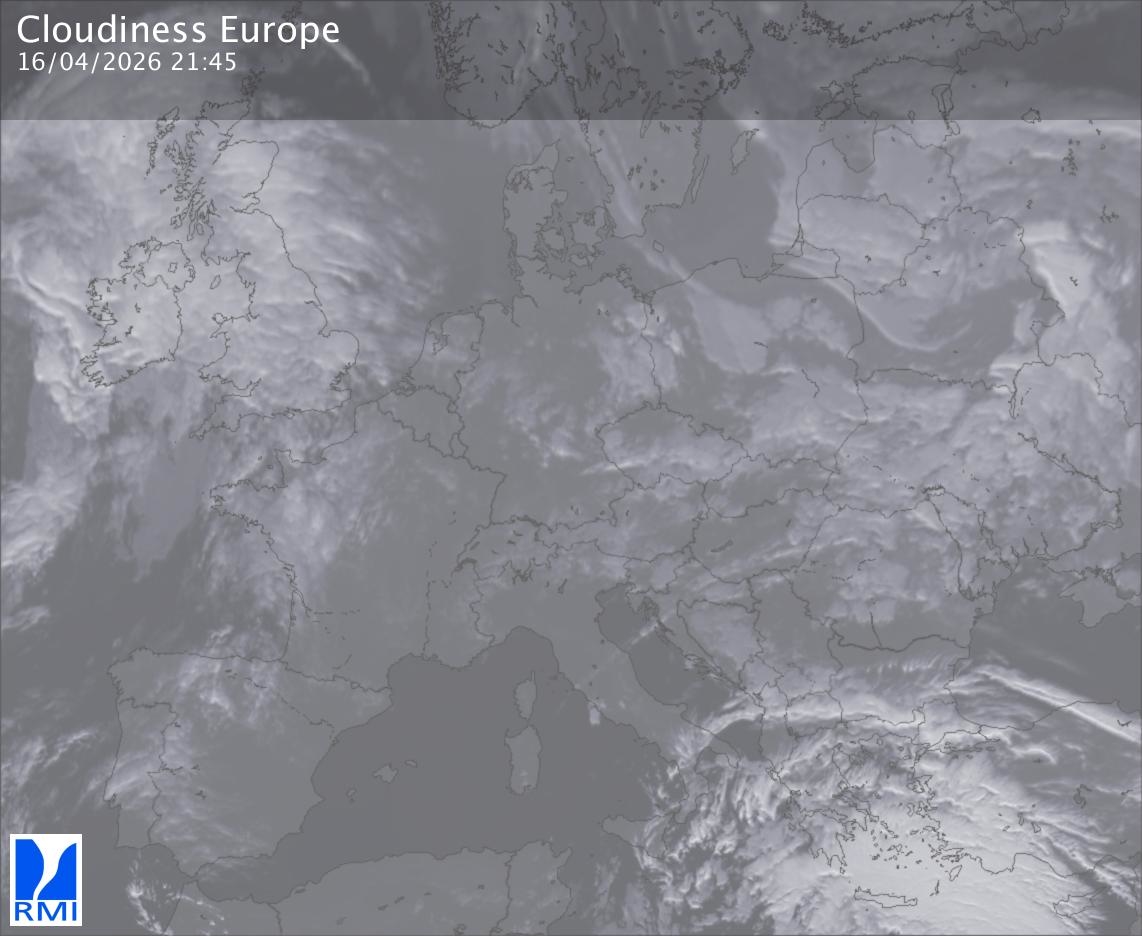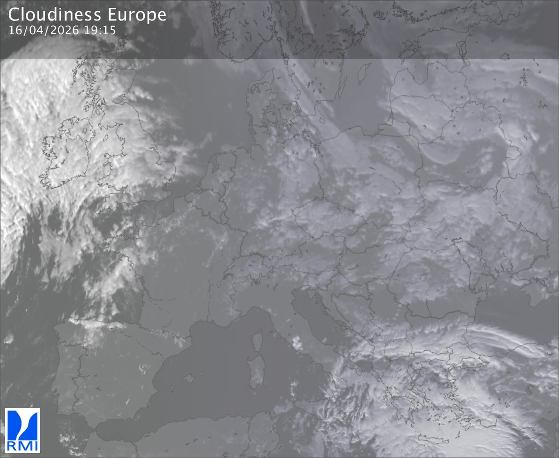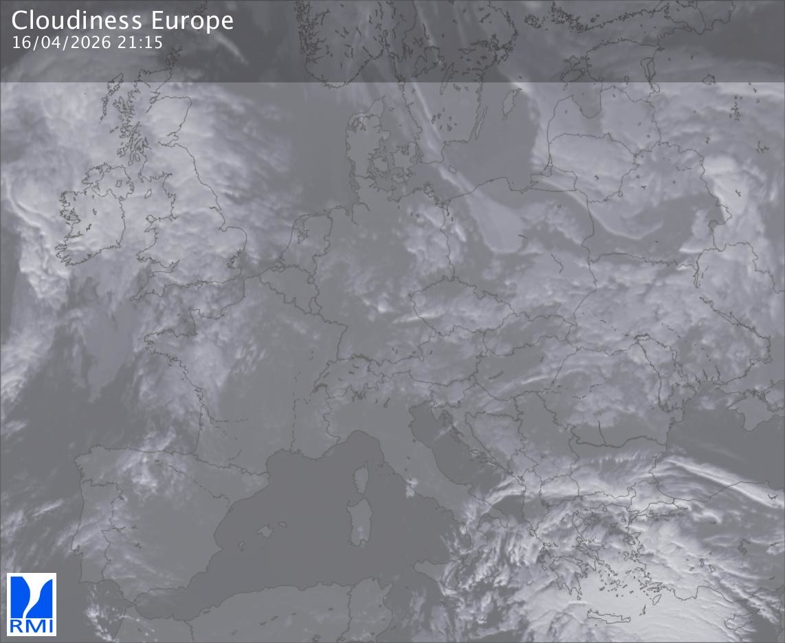 The satellite image of Europe is composed by using both the infrared and the visible light channel from the satellite. Because there are no usable visible light images during the night this composition of channels gives us an image that can be used to observe the clouds by day and by night. The pixelated artifacts are due to the lower resolution of the infrared channel.