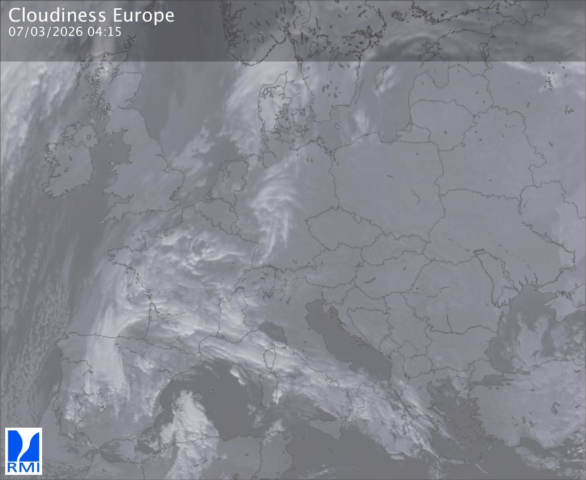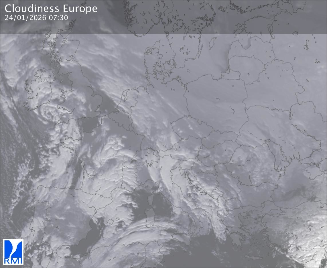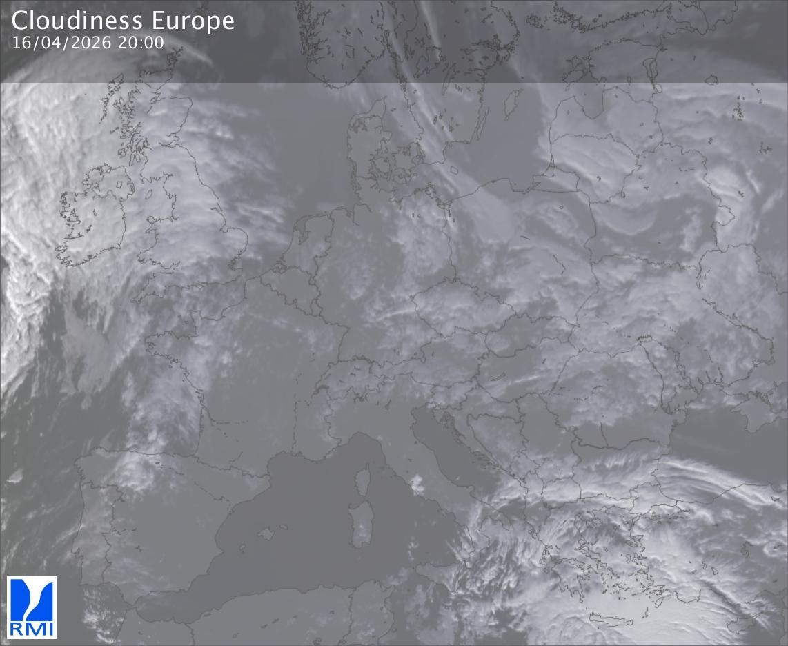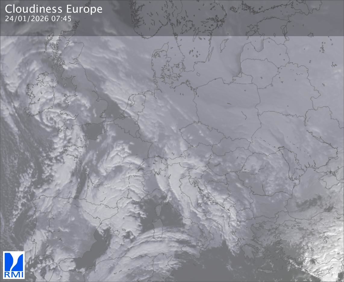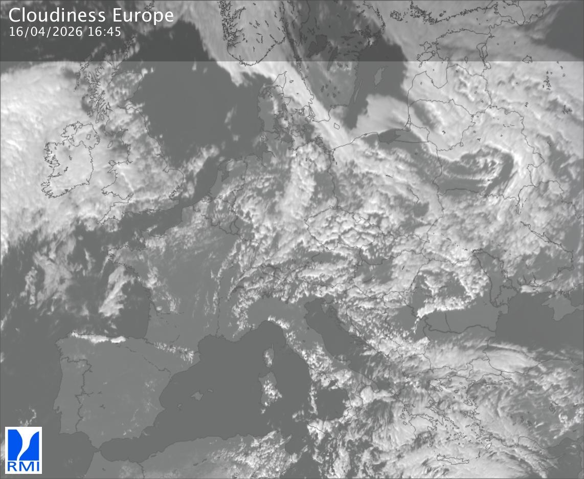 The satellite image of Europe is composed by using both the infrared and the visible light channel from the satellite. Because there are no usable visible light images during the night this composition of channels gives us an image that can be used to observe the clouds by day and by night. The pixelated artifacts are due to the lower resolution of the infrared channel.