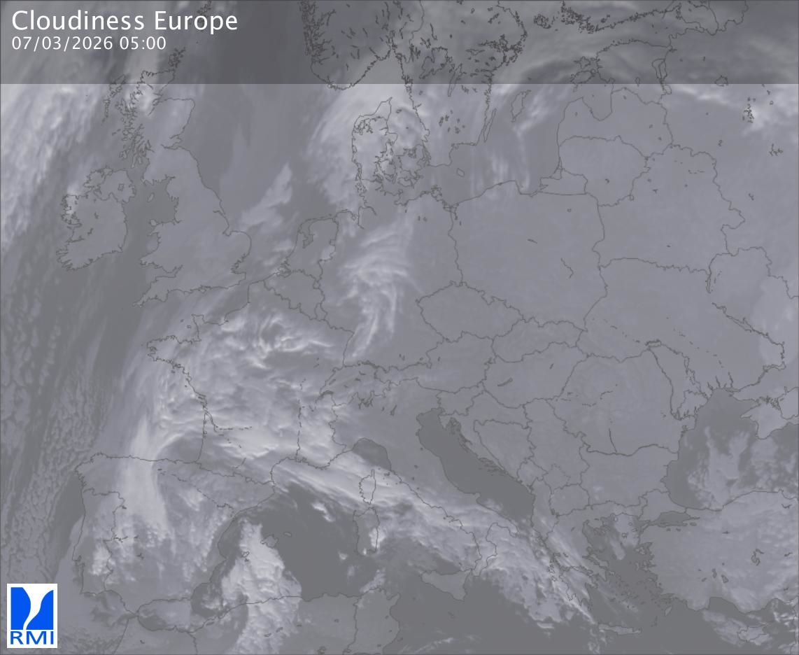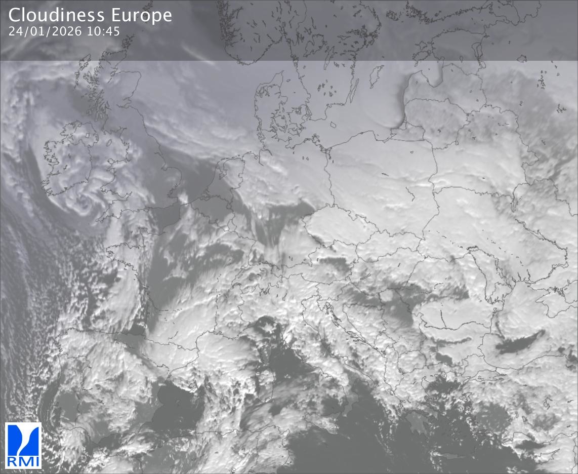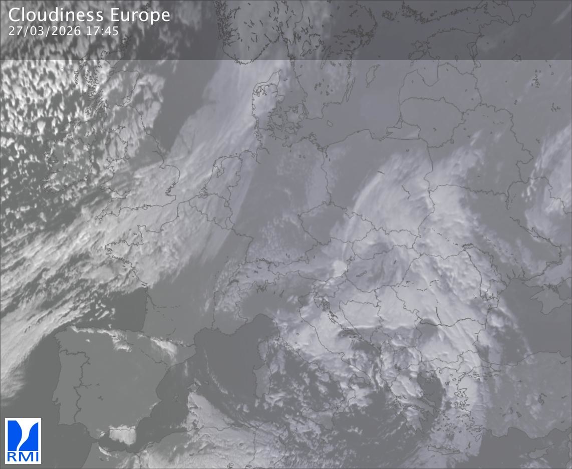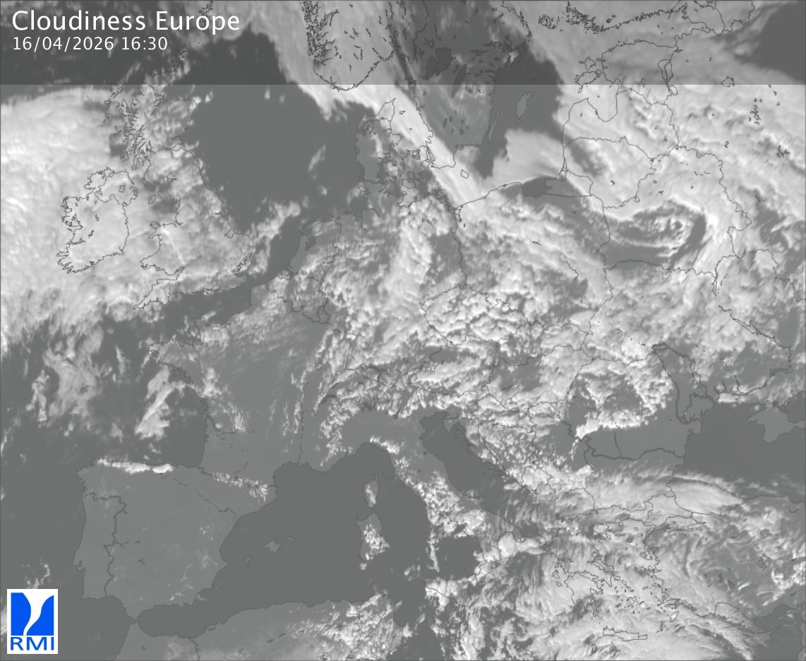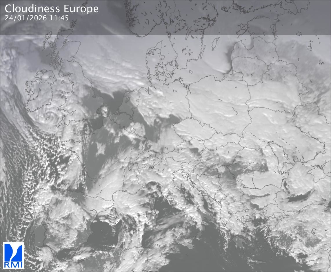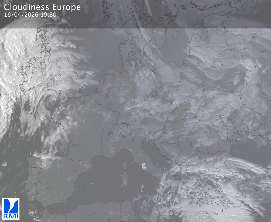 The satellite image of Europe is composed by using both the infrared and the visible light channel from the satellite. Because there are no usable visible light images during the night this composition of channels gives us an image that can be used to observe the clouds by day and by night. The pixelated artifacts are due to the lower resolution of the infrared channel.
