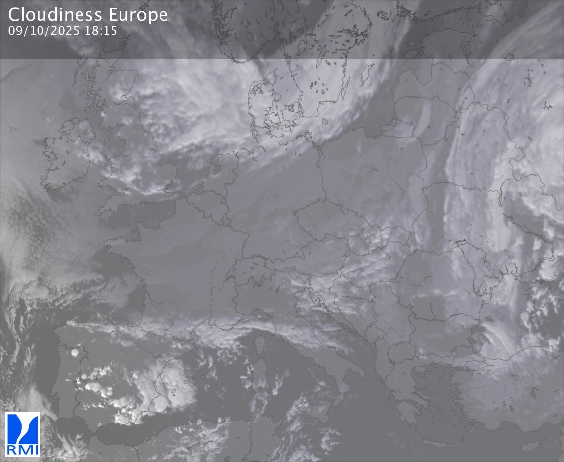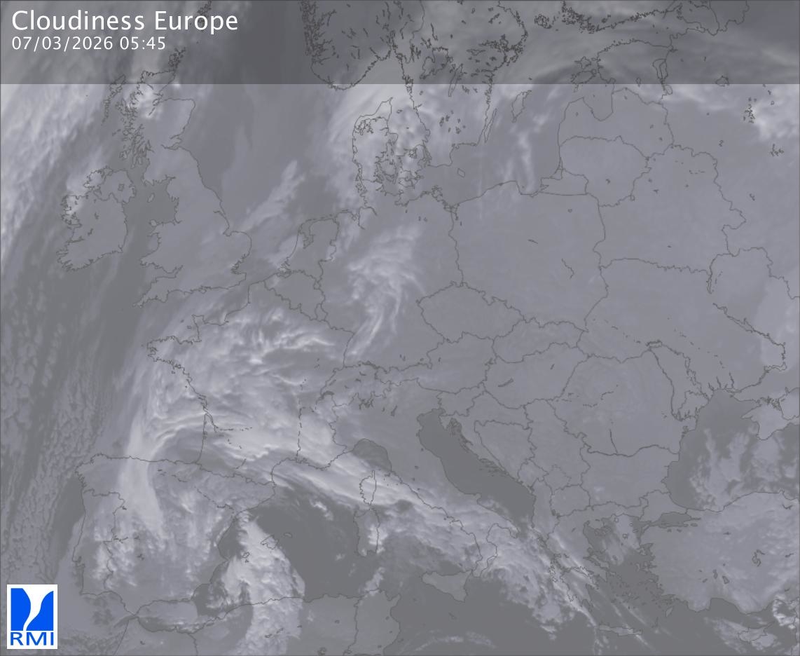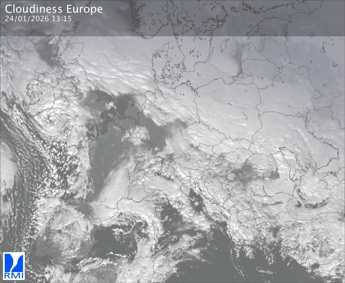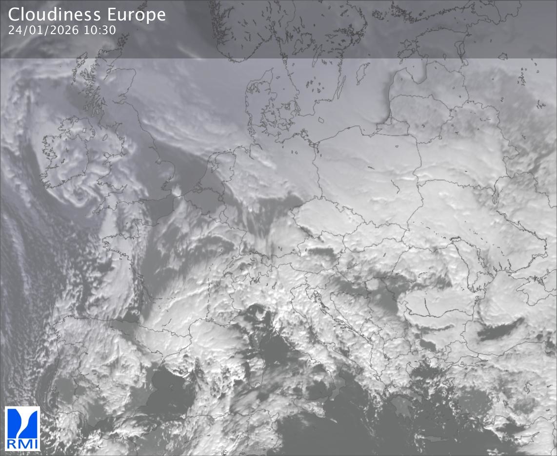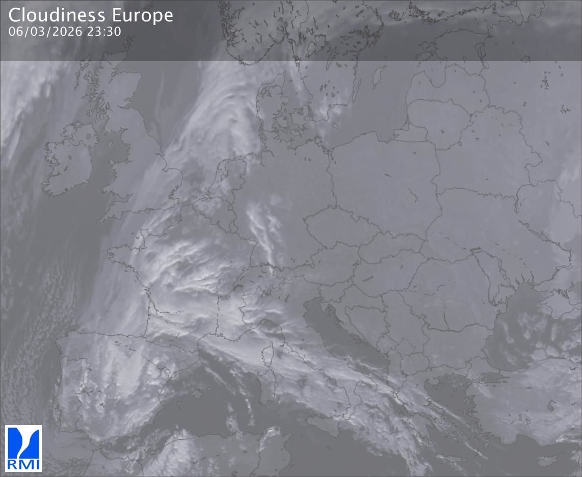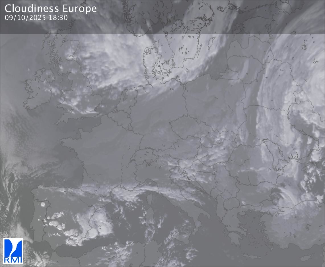 The satellite image of Europe is composed by using both the infrared and the visible light channel from the satellite. Because there are no usable visible light images during the night this composition of channels gives us an image that can be used to observe the clouds by day and by night. The pixelated artifacts are due to the lower resolution of the infrared channel.
