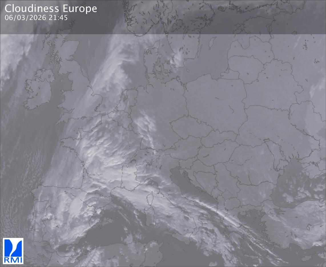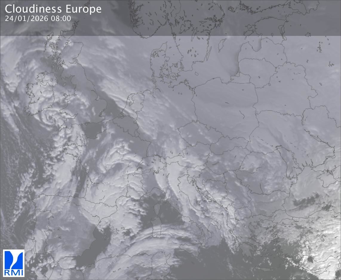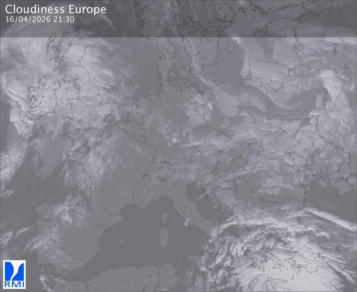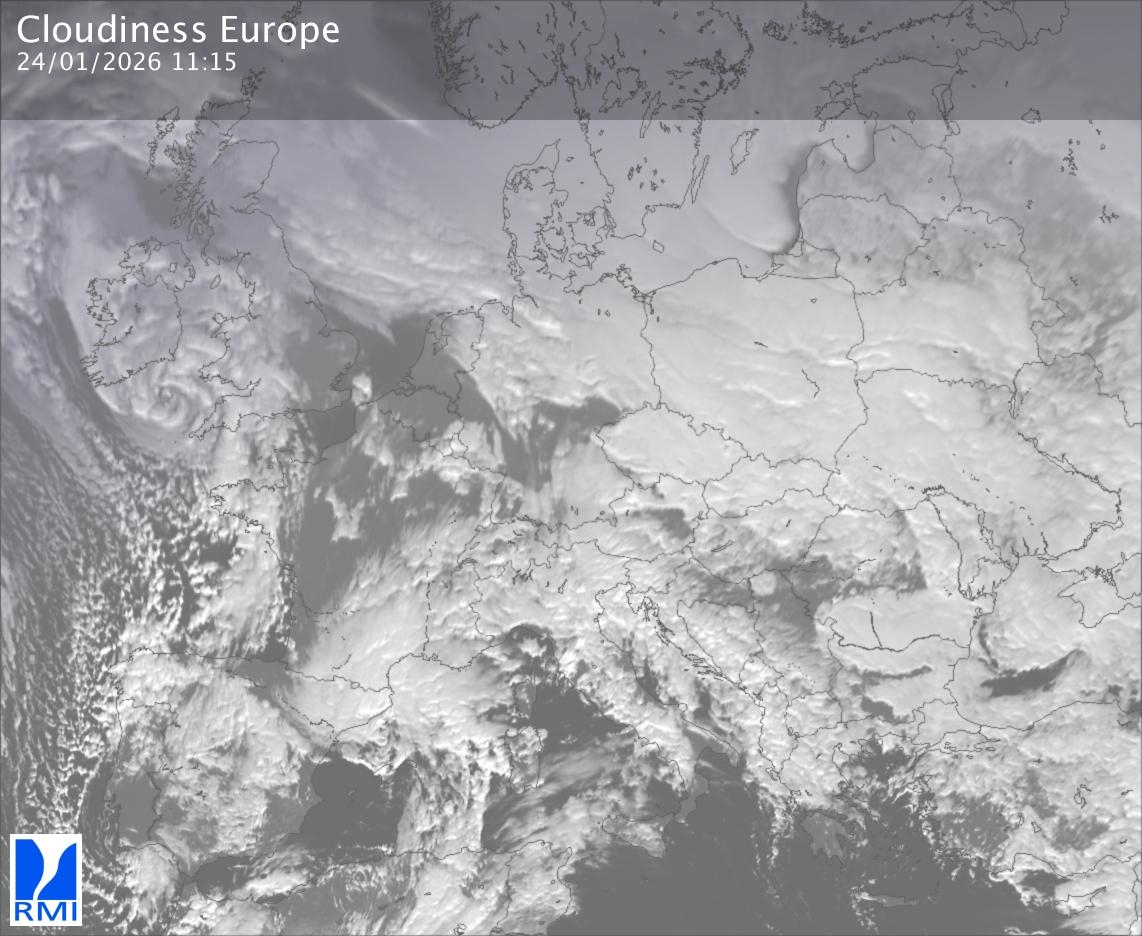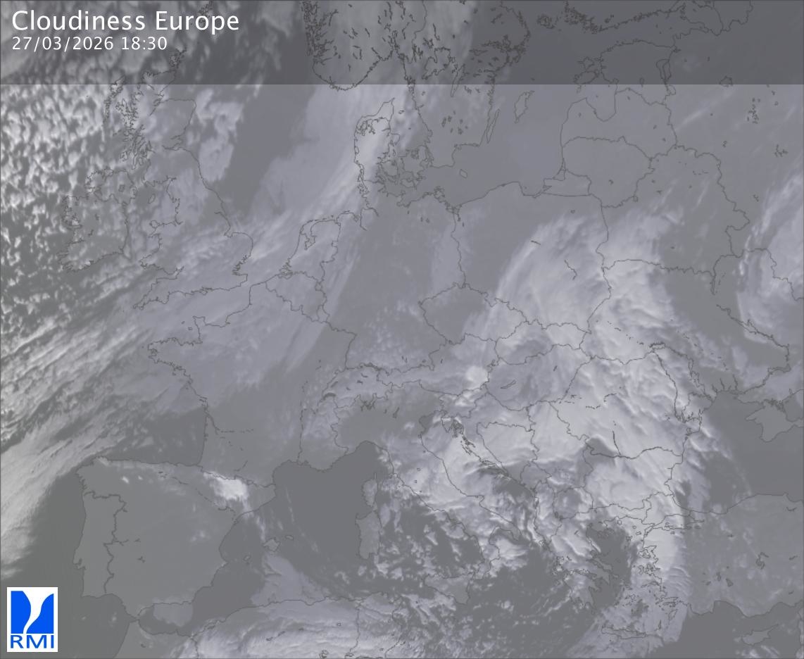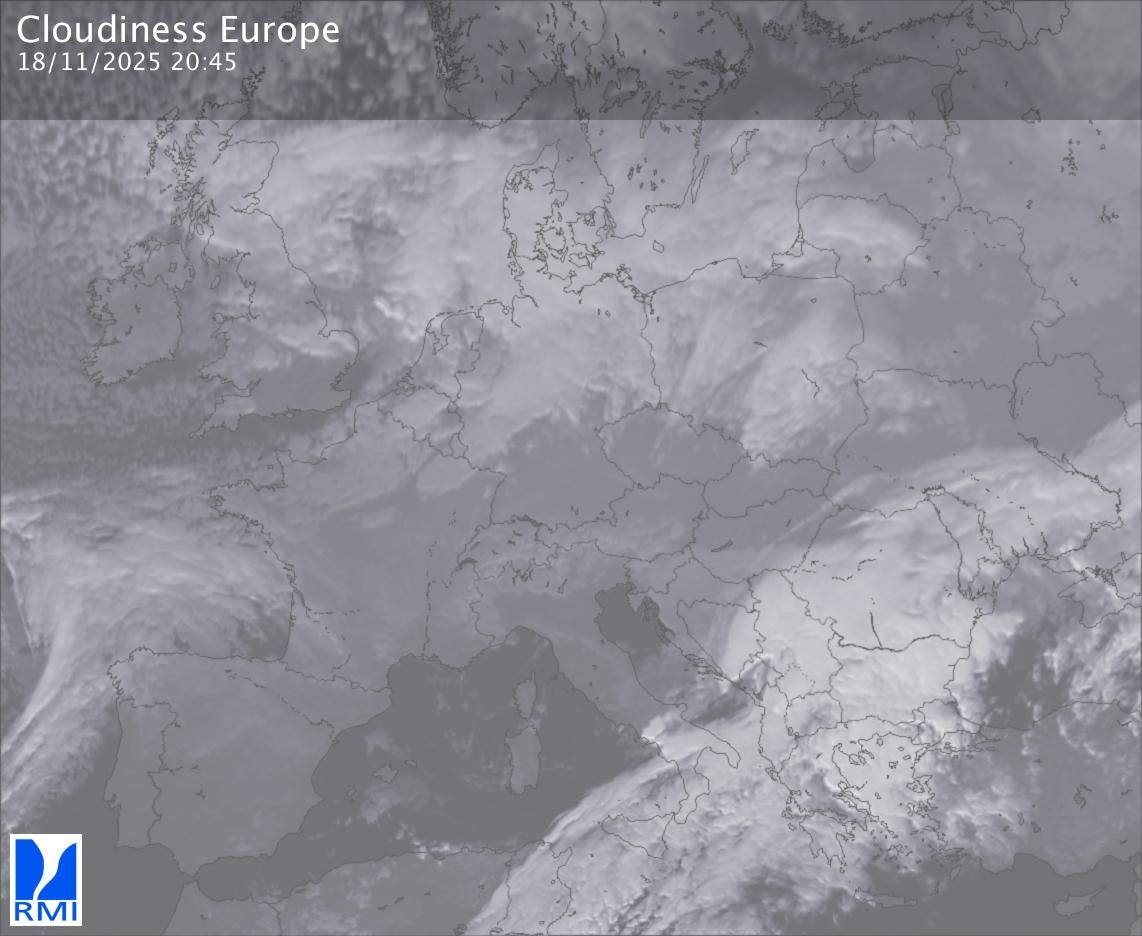 The satellite image of Europe is composed by using both the infrared and the visible light channel from the satellite. Because there are no usable visible light images during the night this composition of channels gives us an image that can be used to observe the clouds by day and by night. The pixelated artifacts are due to the lower resolution of the infrared channel.