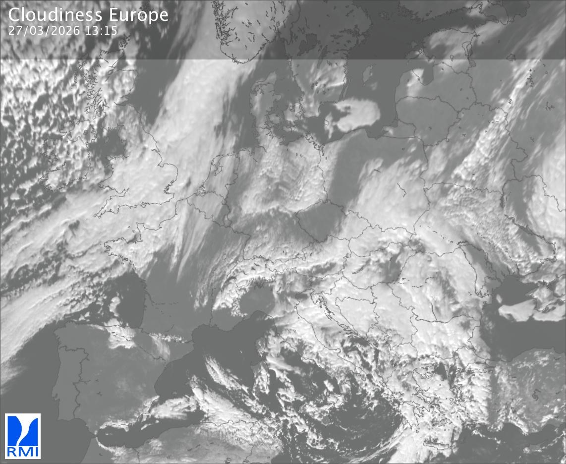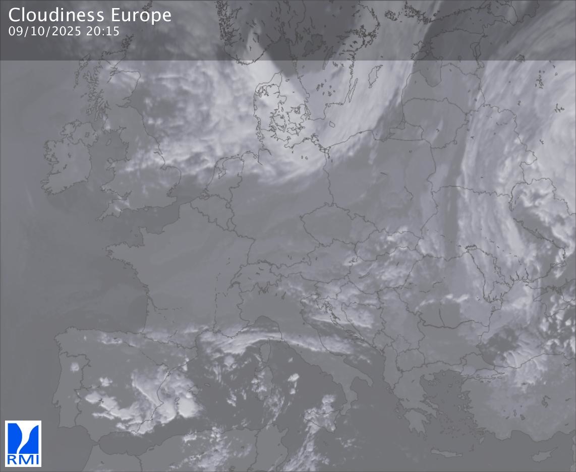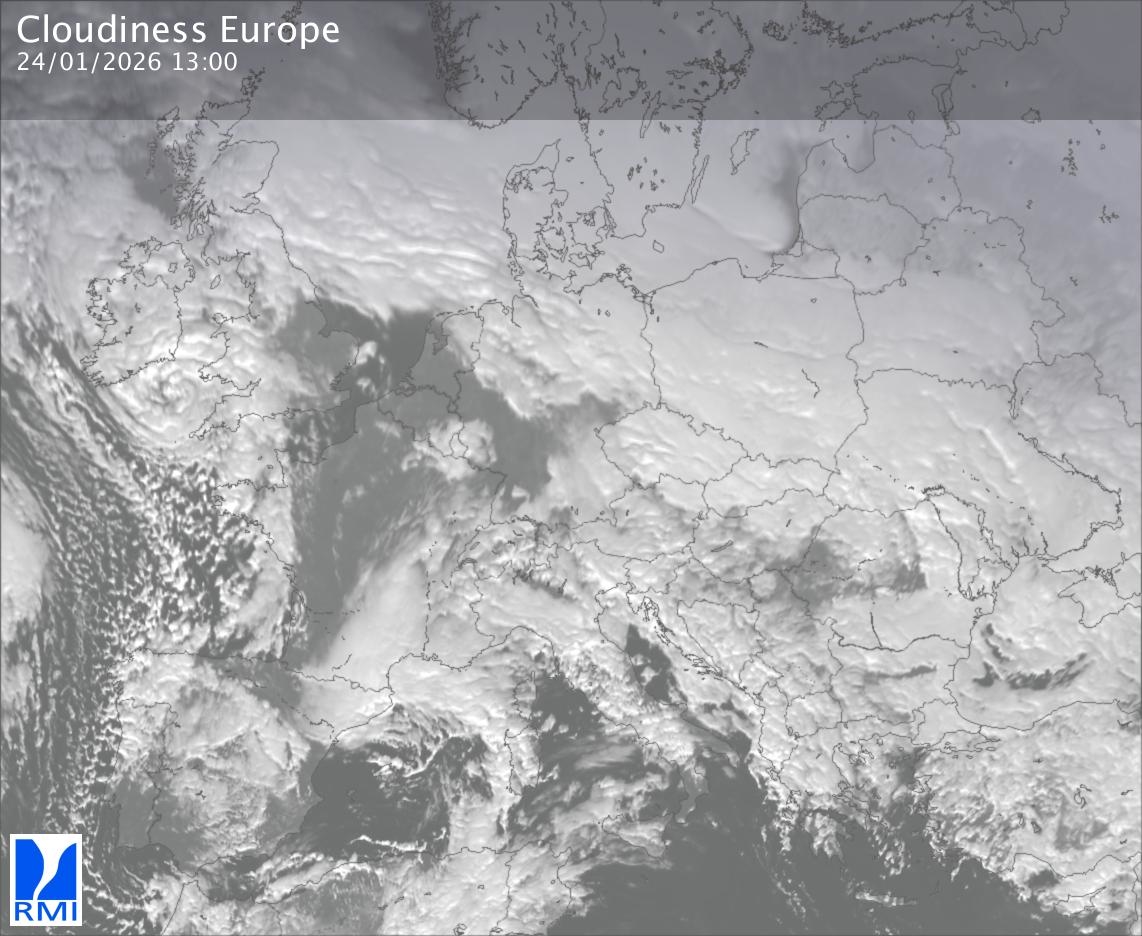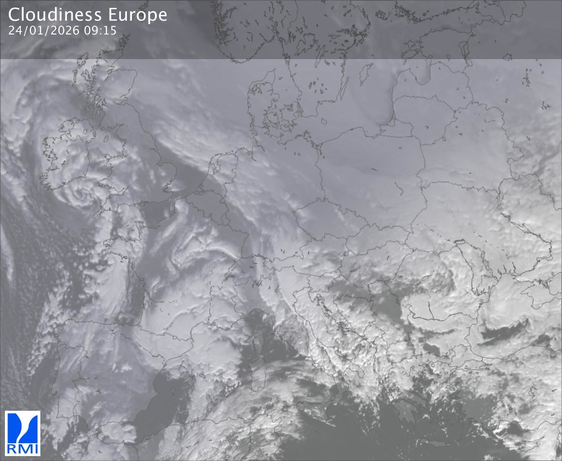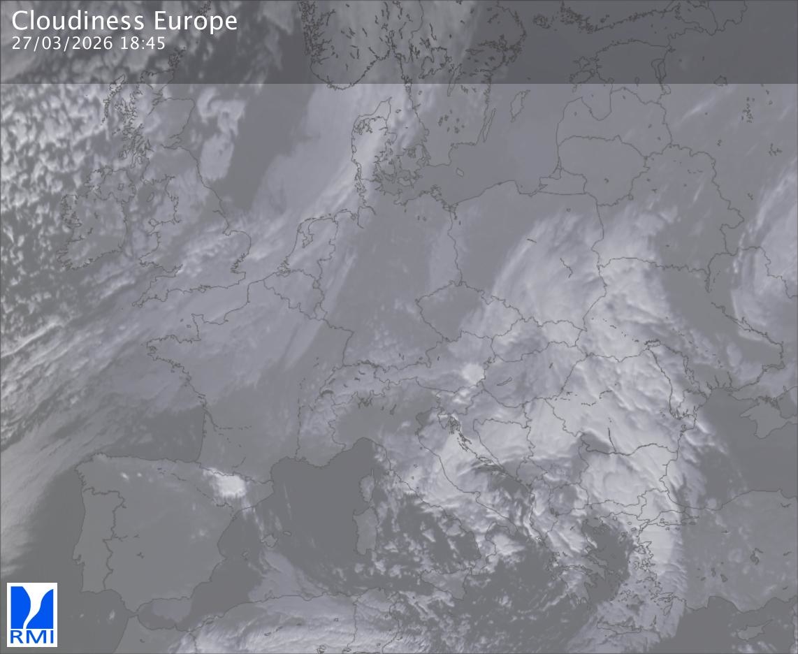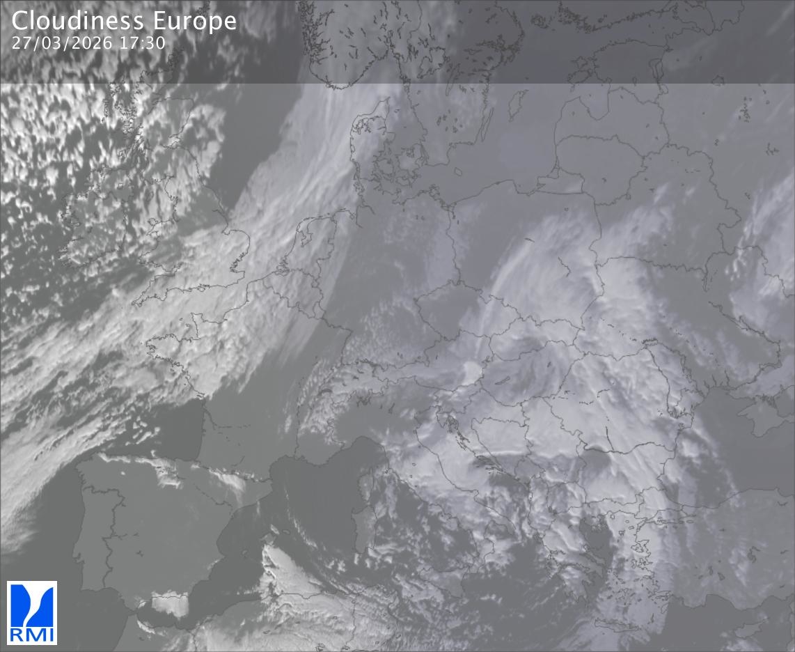 The satellite image of Europe is composed by using both the infrared and the visible light channel from the satellite. Because there are no usable visible light images during the night this composition of channels gives us an image that can be used to observe the clouds by day and by night. The pixelated artifacts are due to the lower resolution of the infrared channel.