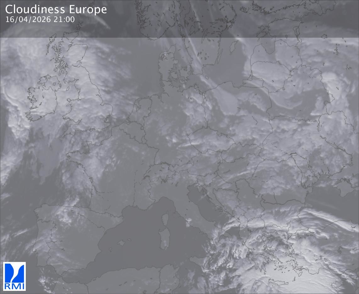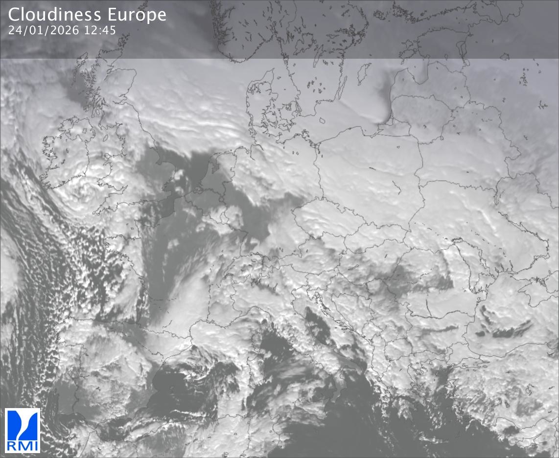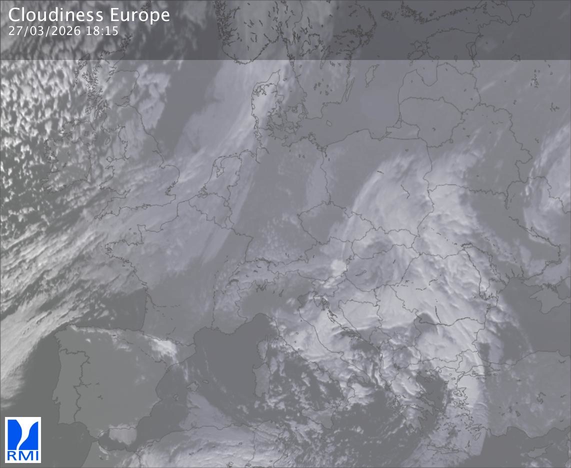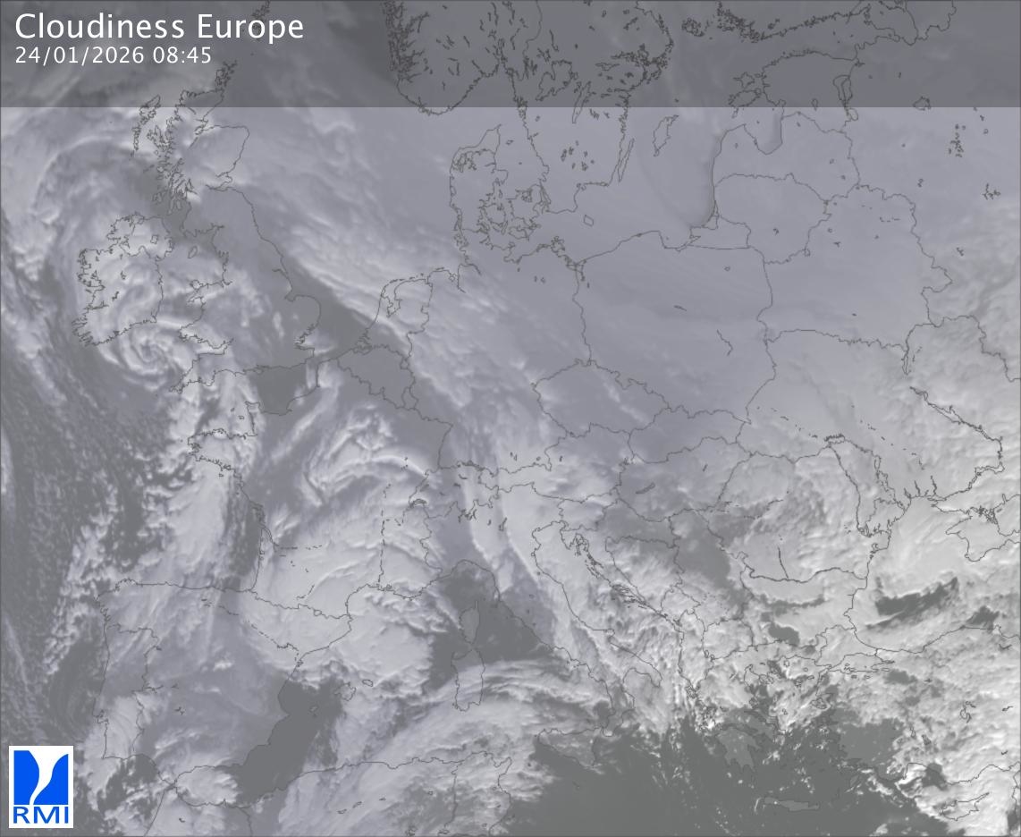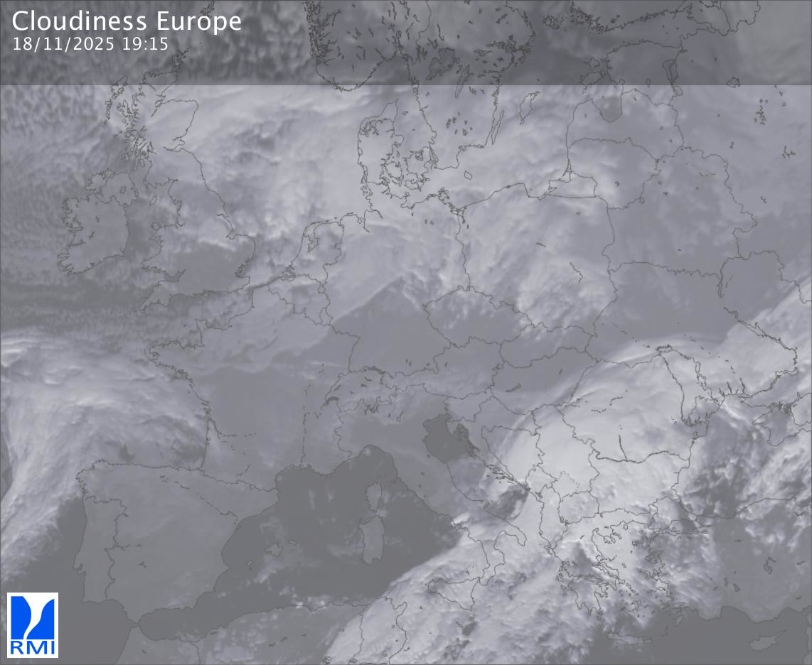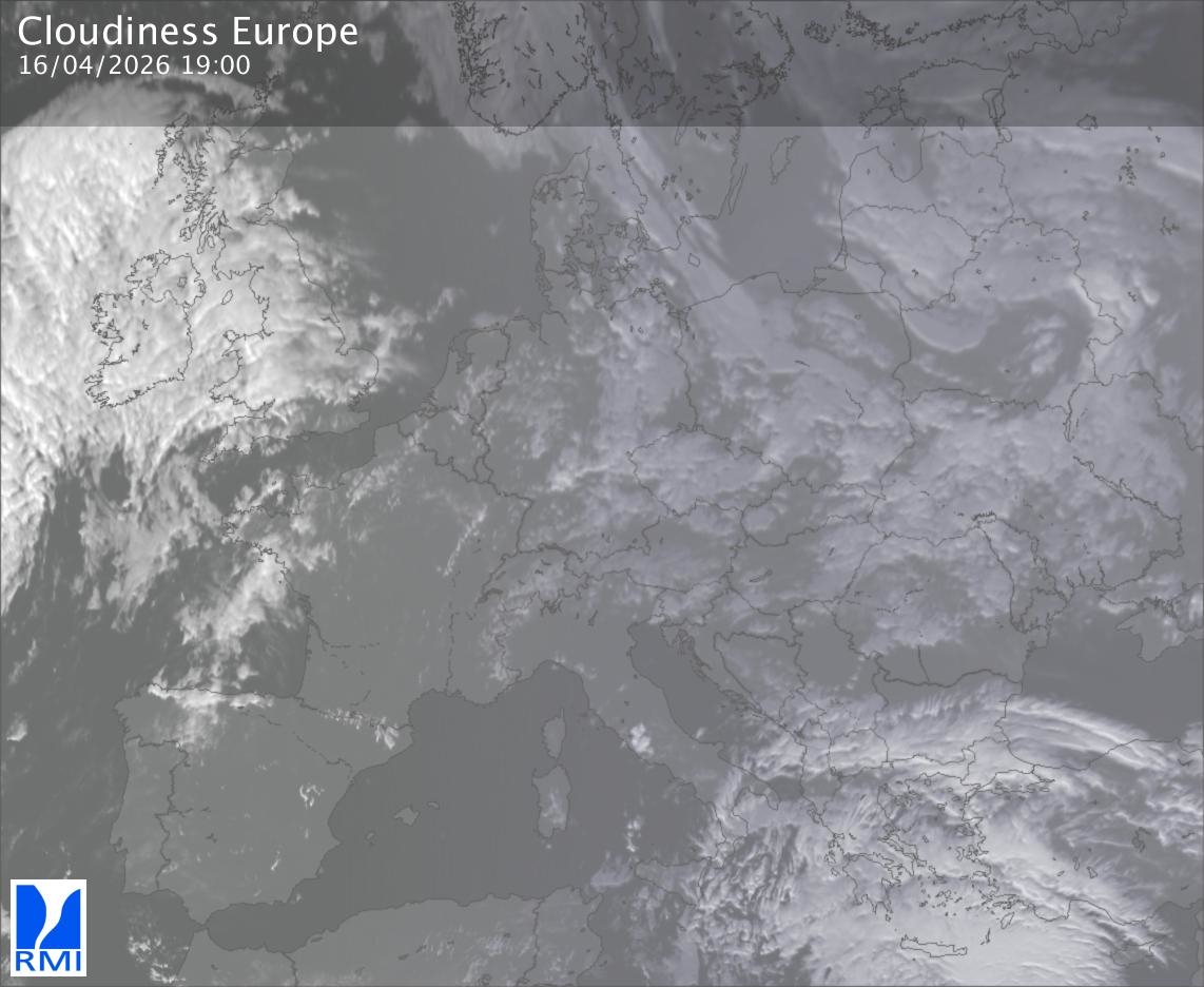 The satellite image of Europe is composed by using both the infrared and the visible light channel from the satellite. Because there are no usable visible light images during the night this composition of channels gives us an image that can be used to observe the clouds by day and by night. The pixelated artifacts are due to the lower resolution of the infrared channel.