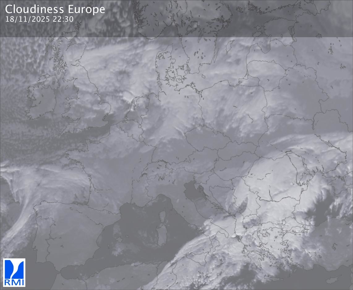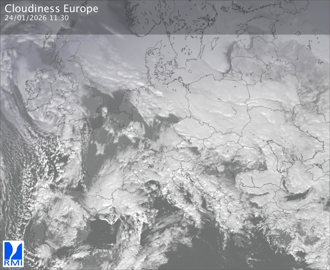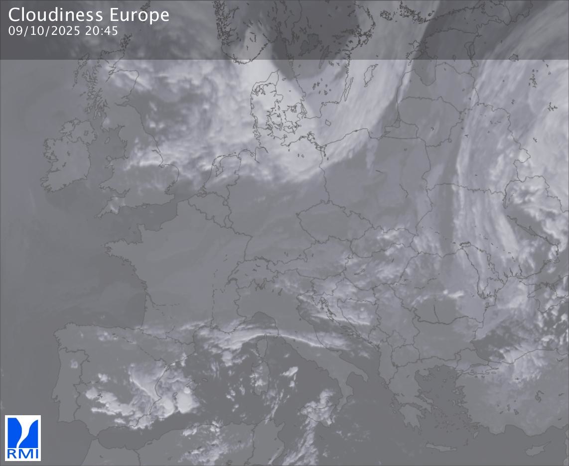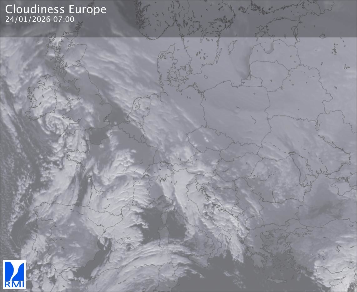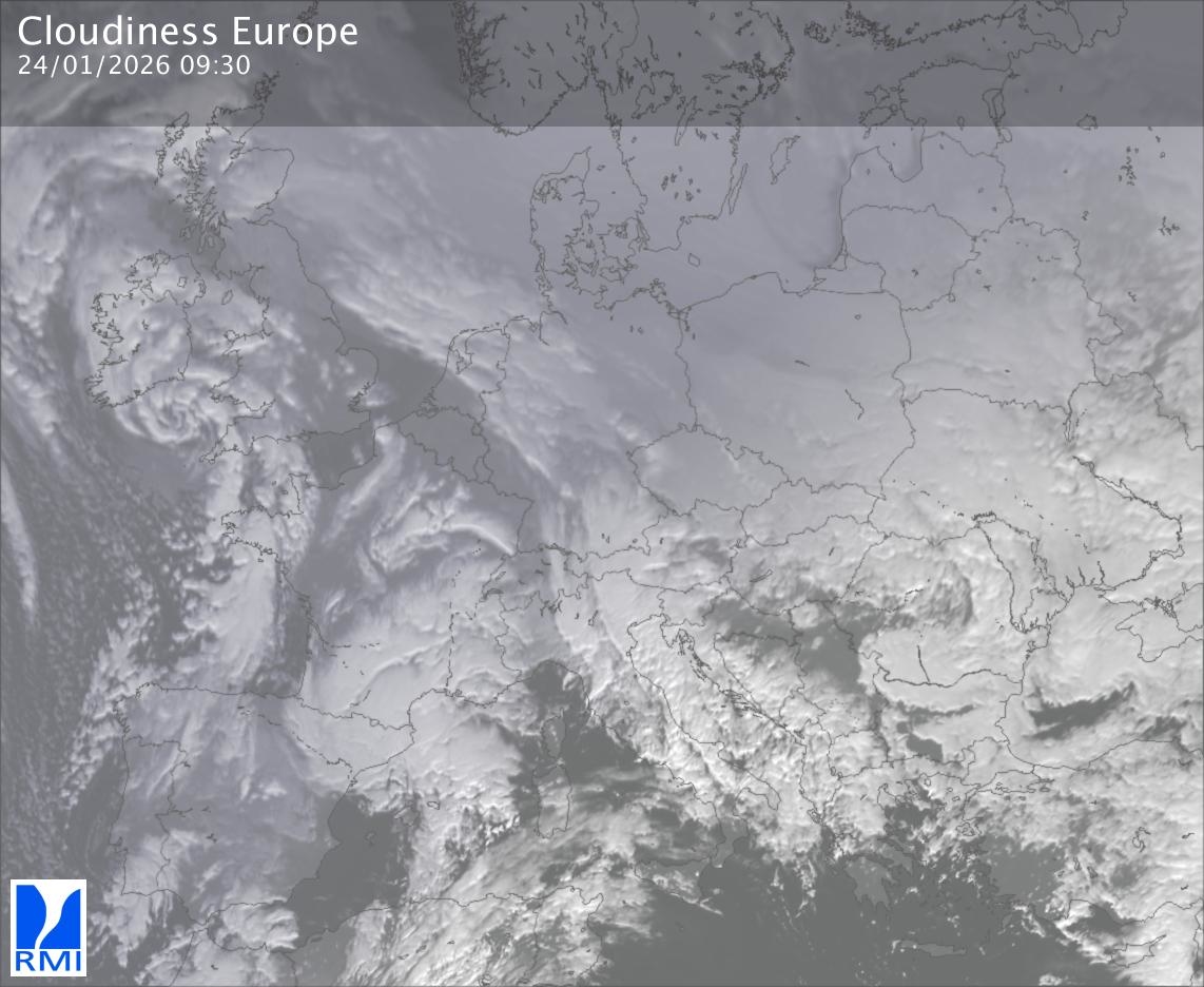 The satellite image of Europe is composed by using both the infrared and the visible light channel from the satellite. Because there are no usable visible light images during the night this composition of channels gives us an image that can be used to observe the clouds by day and by night. The pixelated artifacts are due to the lower resolution of the infrared channel.