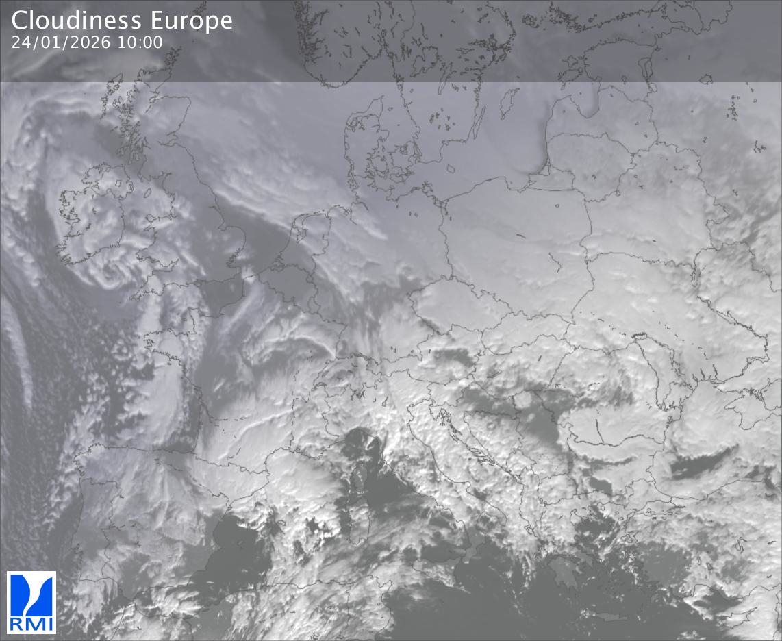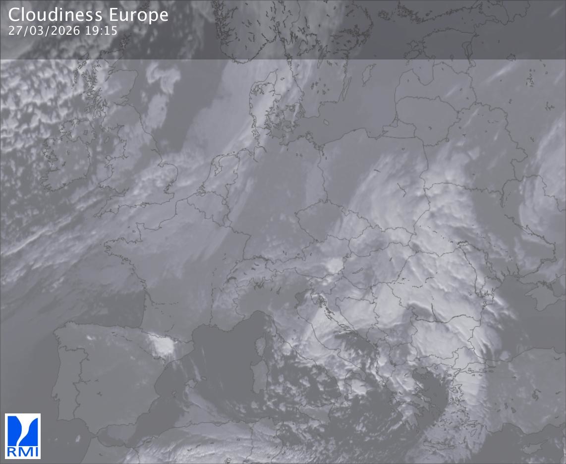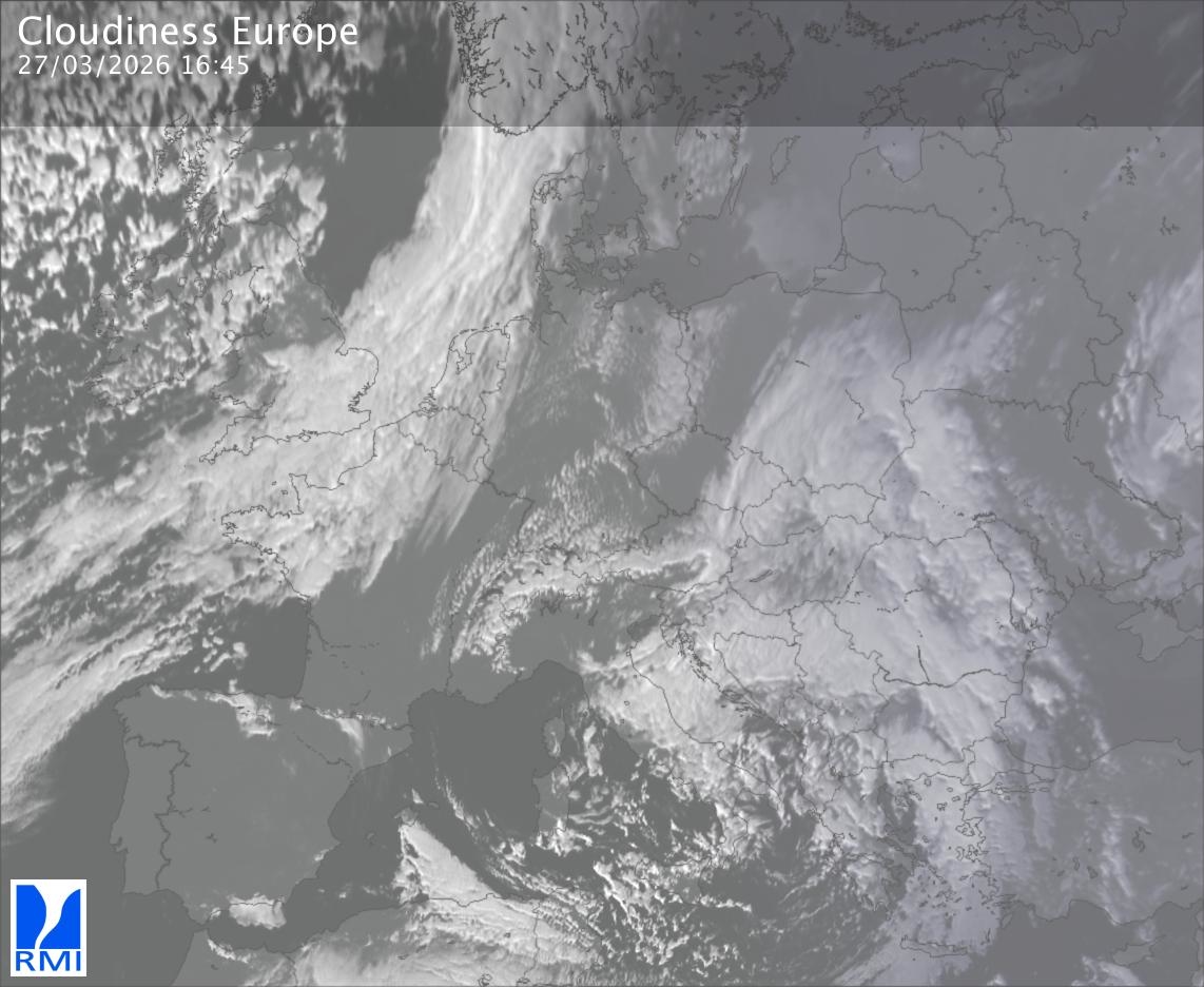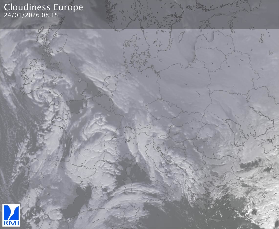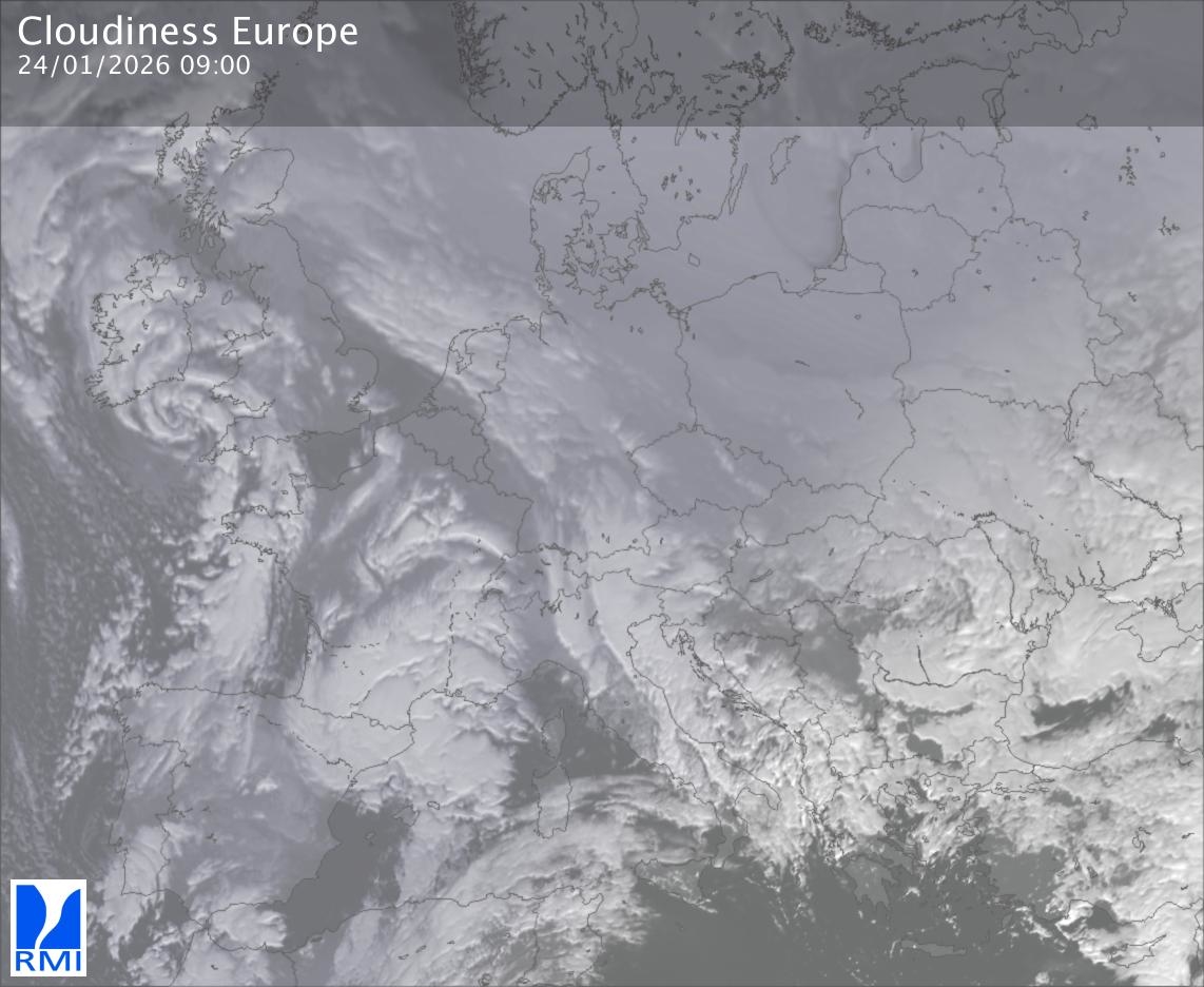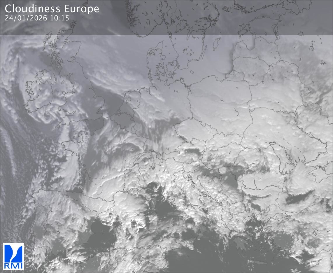 The satellite image of Europe is composed by using both the infrared and the visible light channel from the satellite. Because there are no usable visible light images during the night this composition of channels gives us an image that can be used to observe the clouds by day and by night. The pixelated artifacts are due to the lower resolution of the infrared channel.