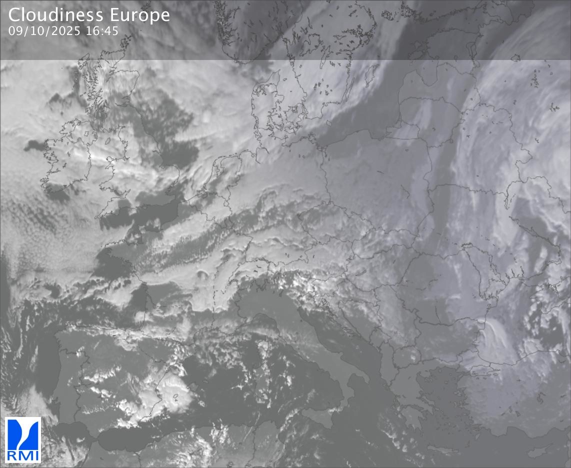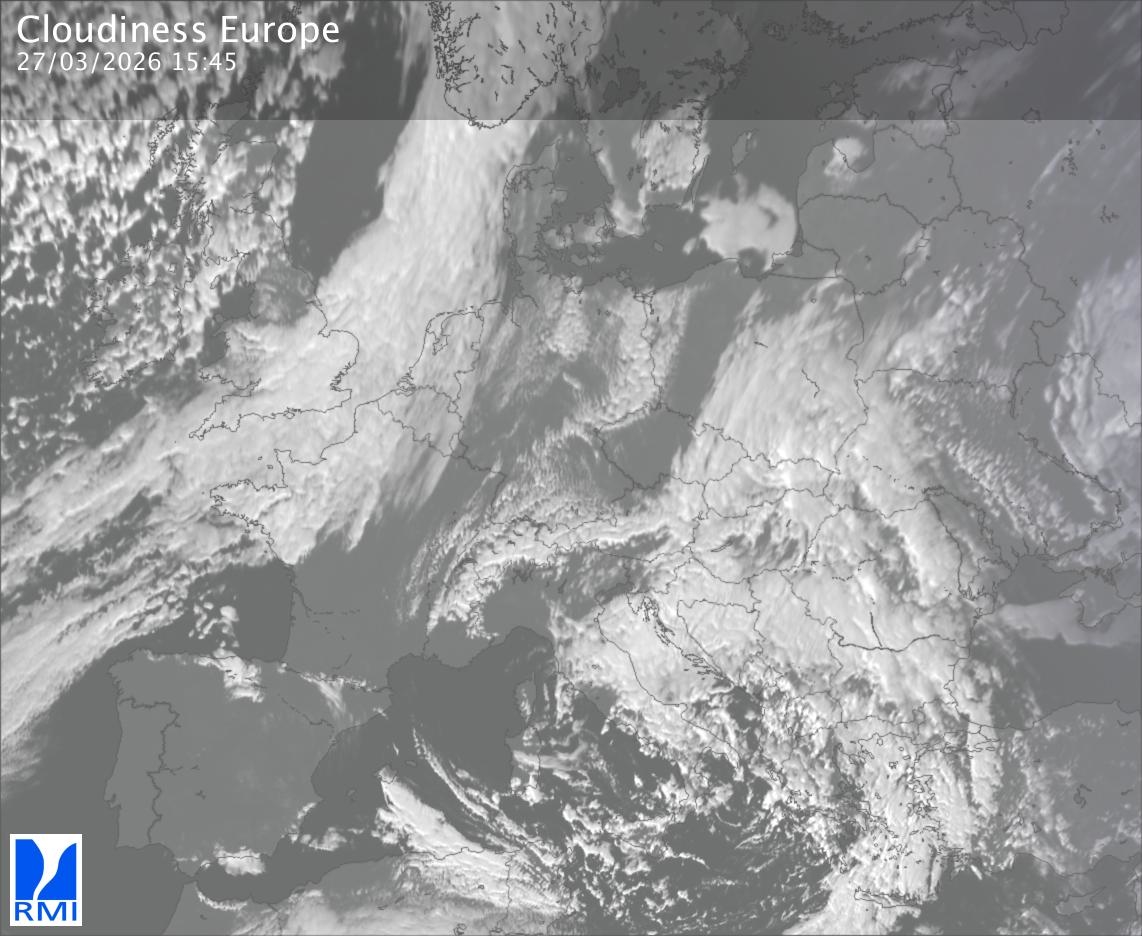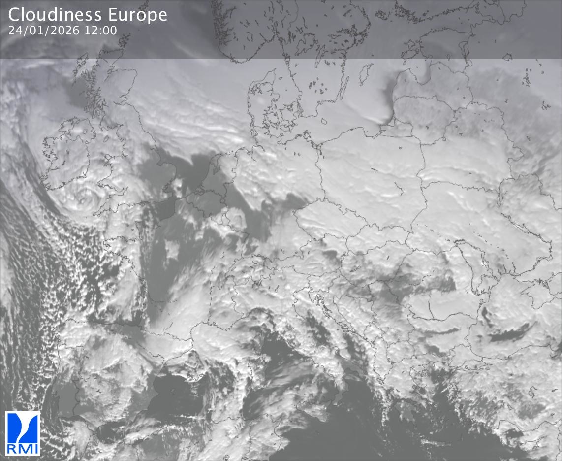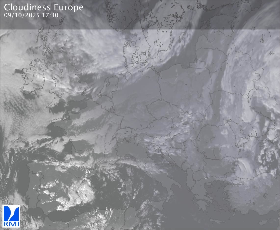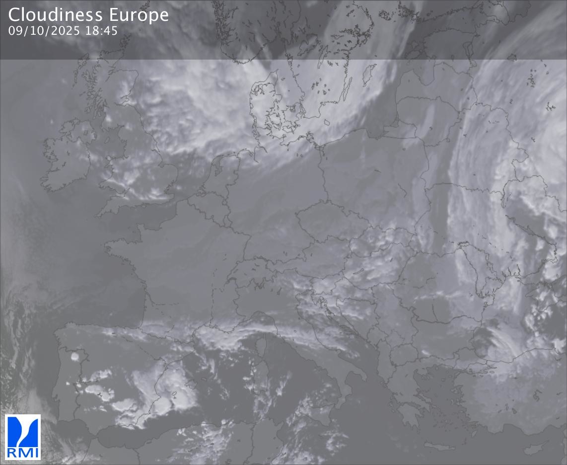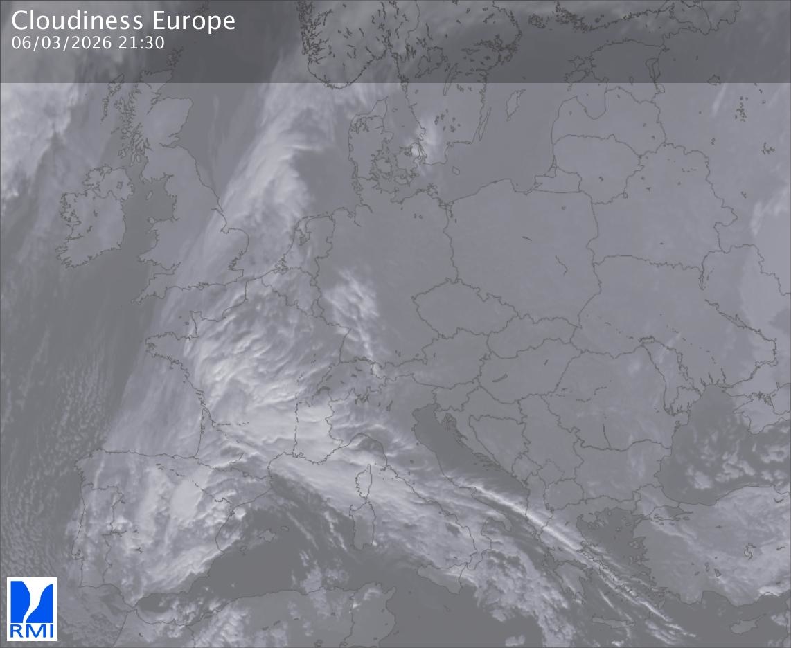 The satellite image of Europe is composed by using both the infrared and the visible light channel from the satellite. Because there are no usable visible light images during the night this composition of channels gives us an image that can be used to observe the clouds by day and by night. The pixelated artifacts are due to the lower resolution of the infrared channel.