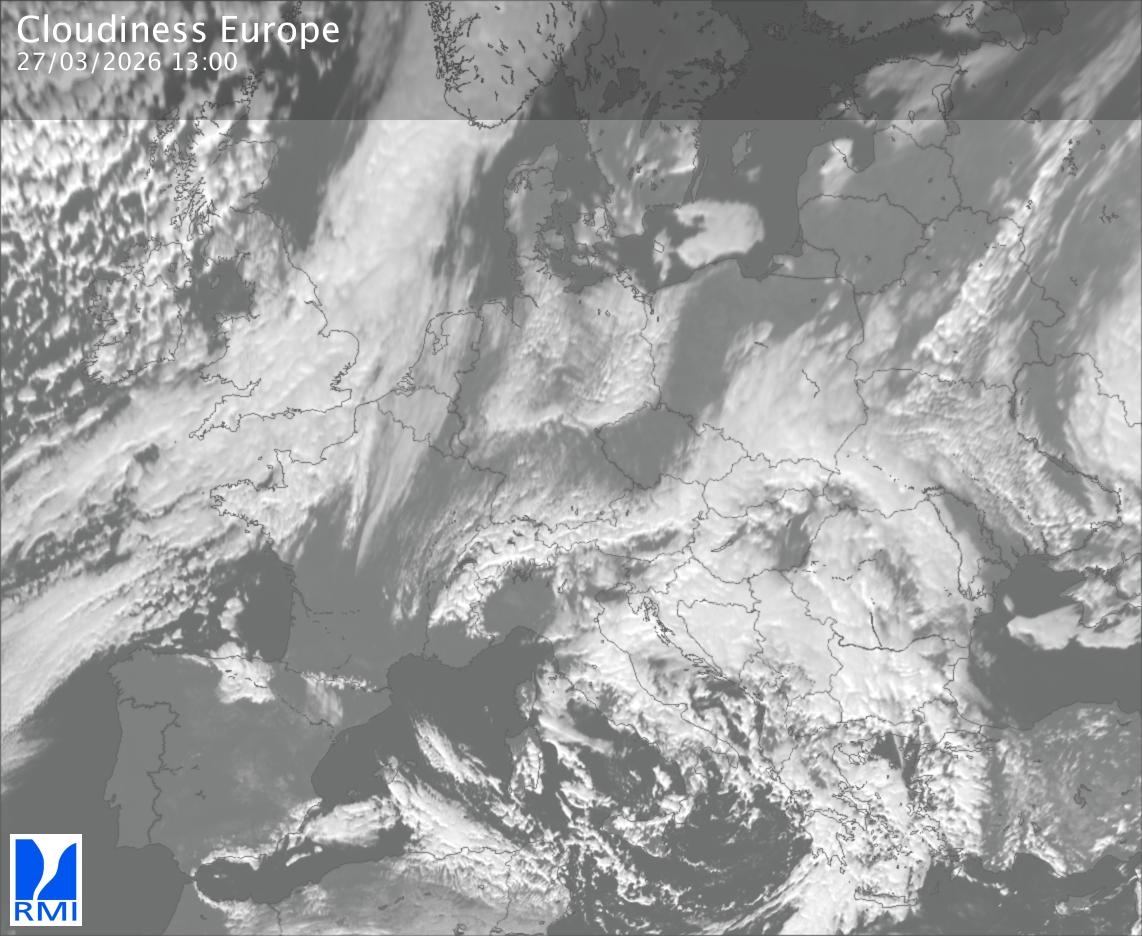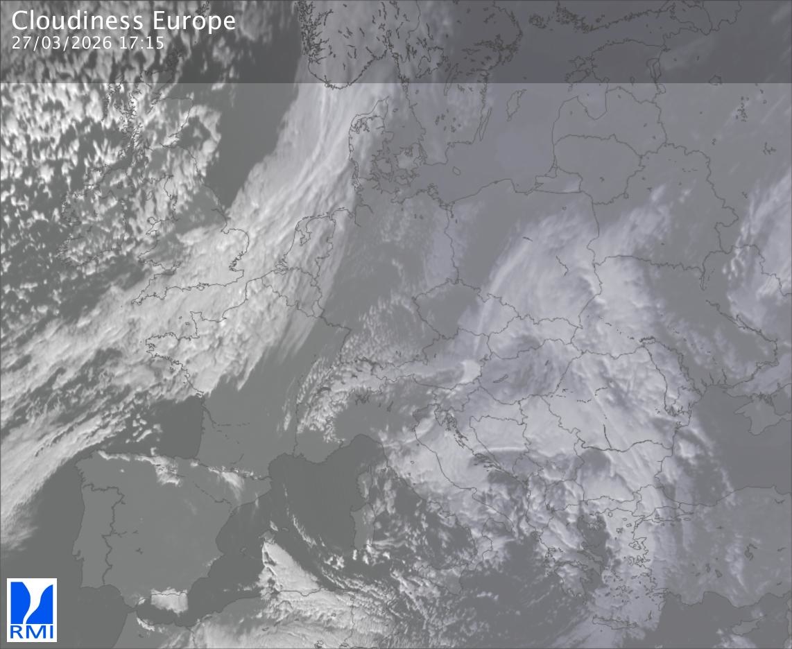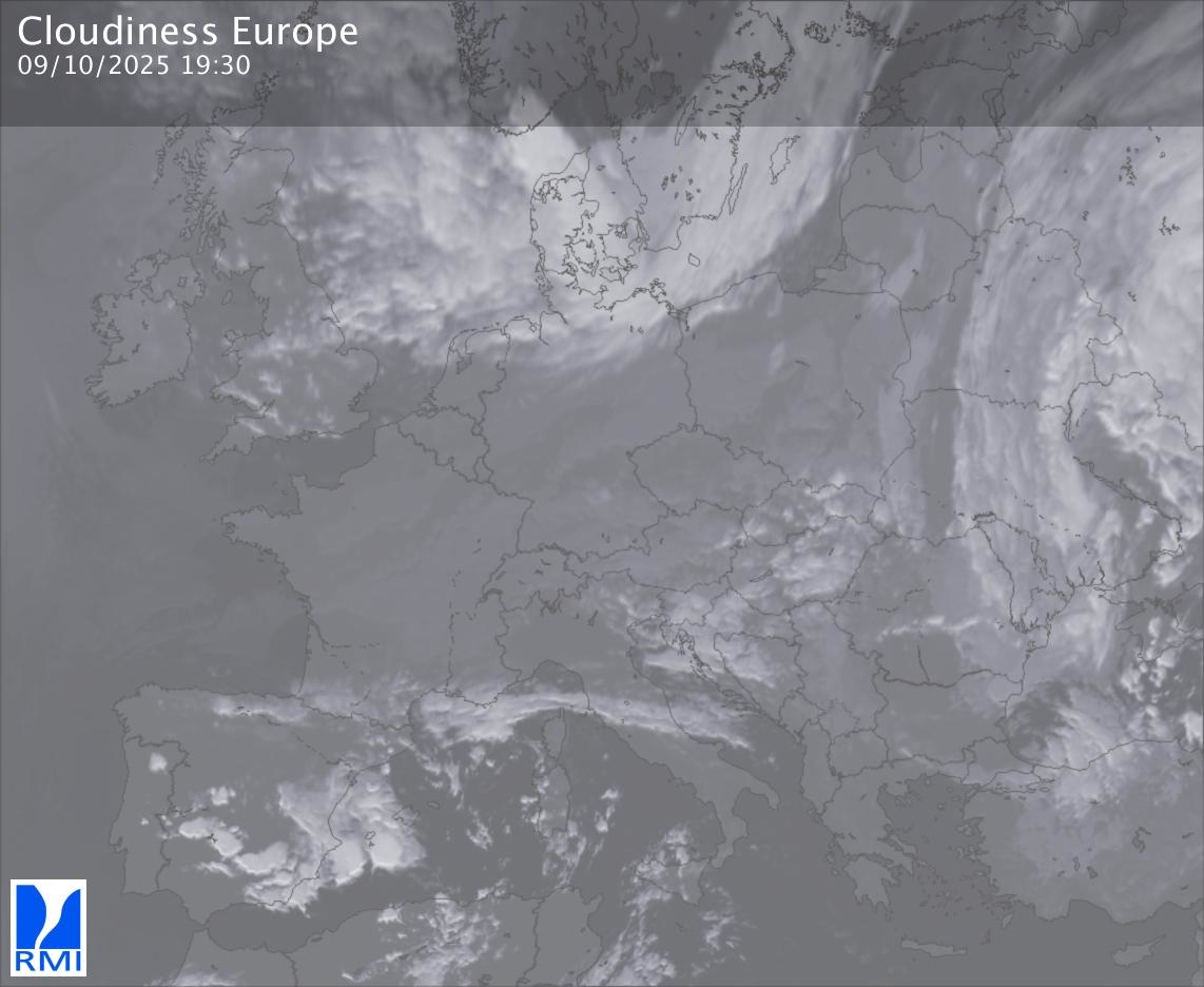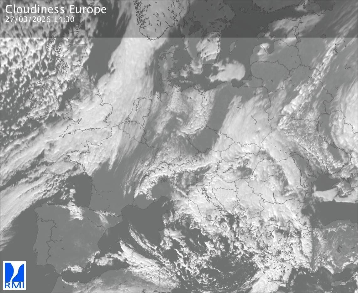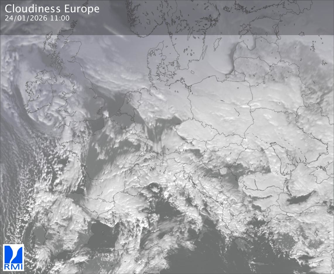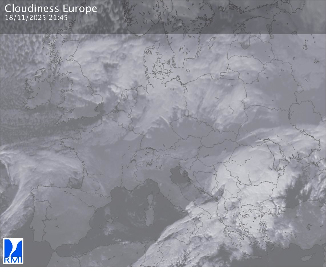 The satellite image of Europe is composed by using both the infrared and the visible light channel from the satellite. Because there are no usable visible light images during the night this composition of channels gives us an image that can be used to observe the clouds by day and by night. The pixelated artifacts are due to the lower resolution of the infrared channel.