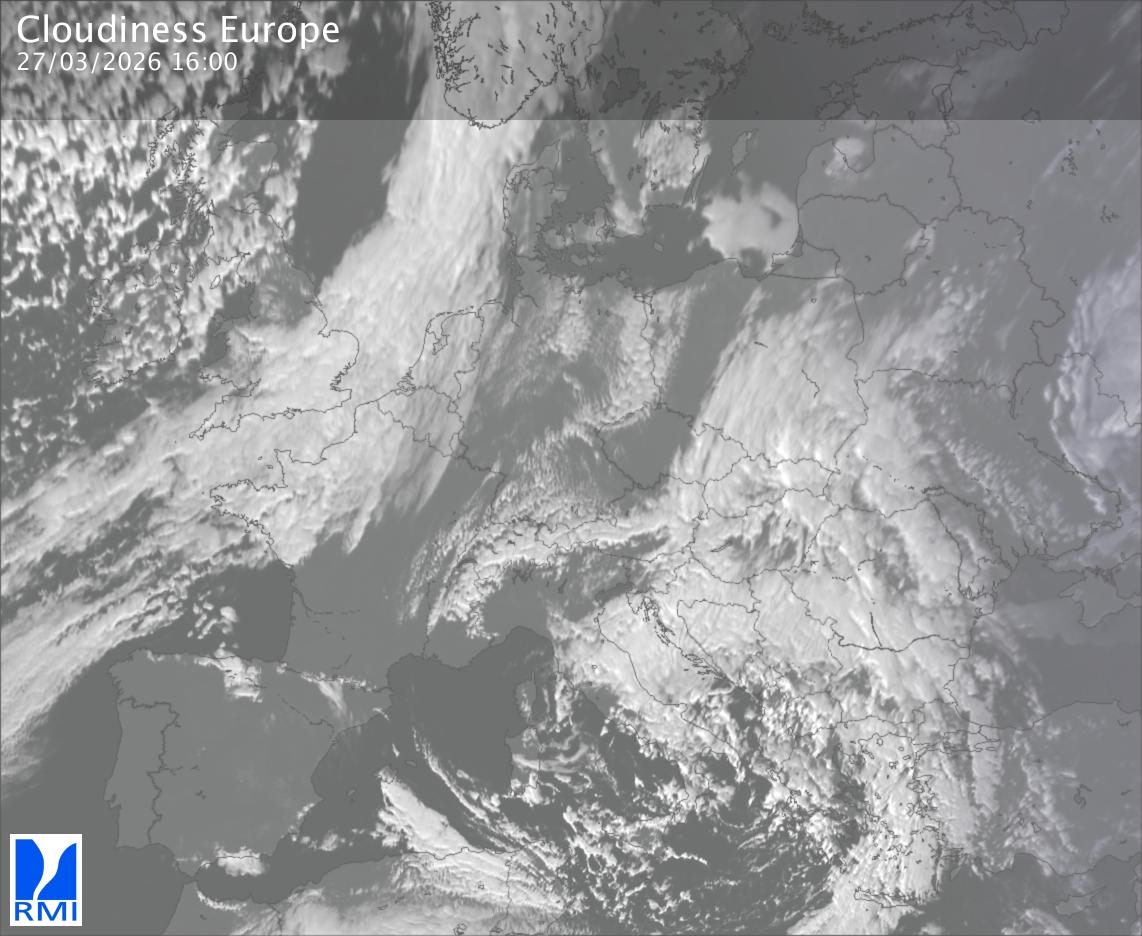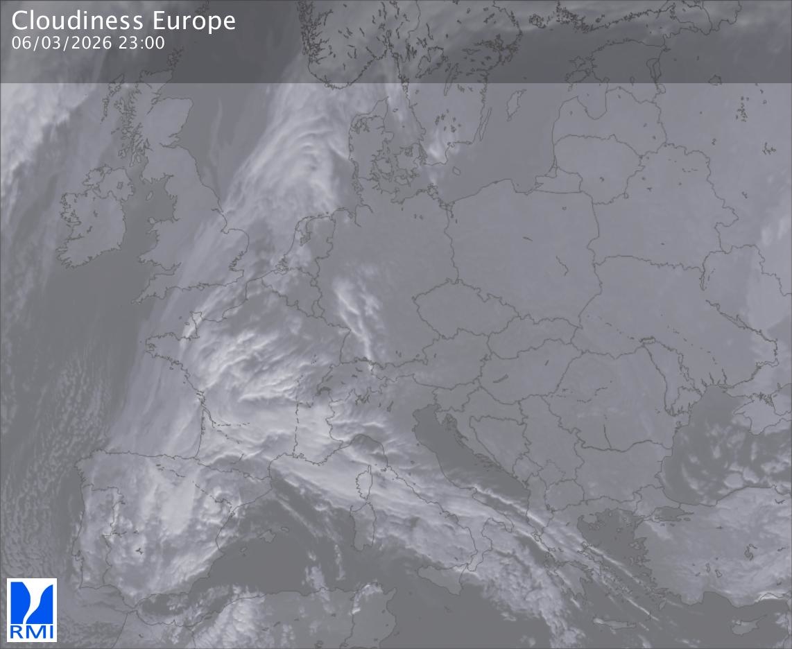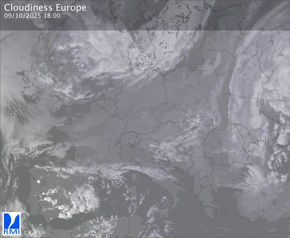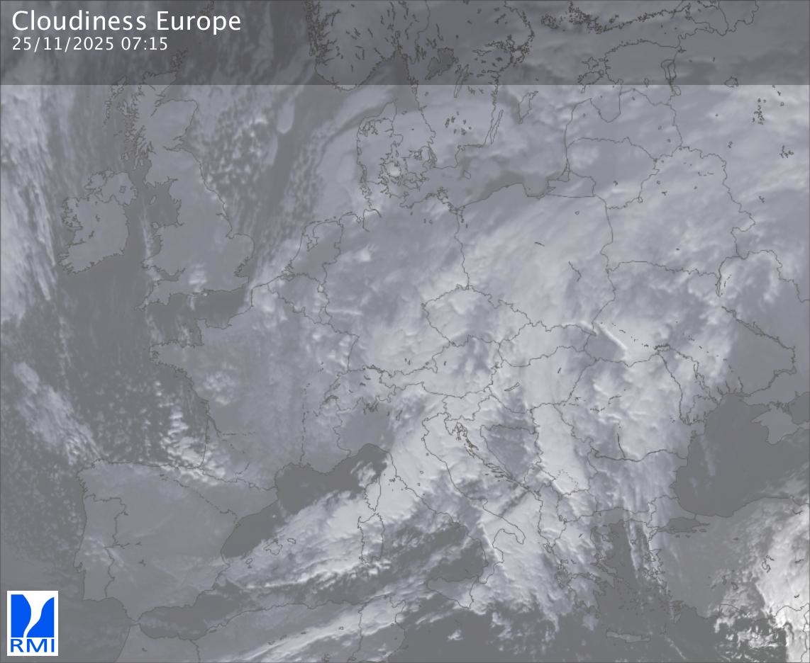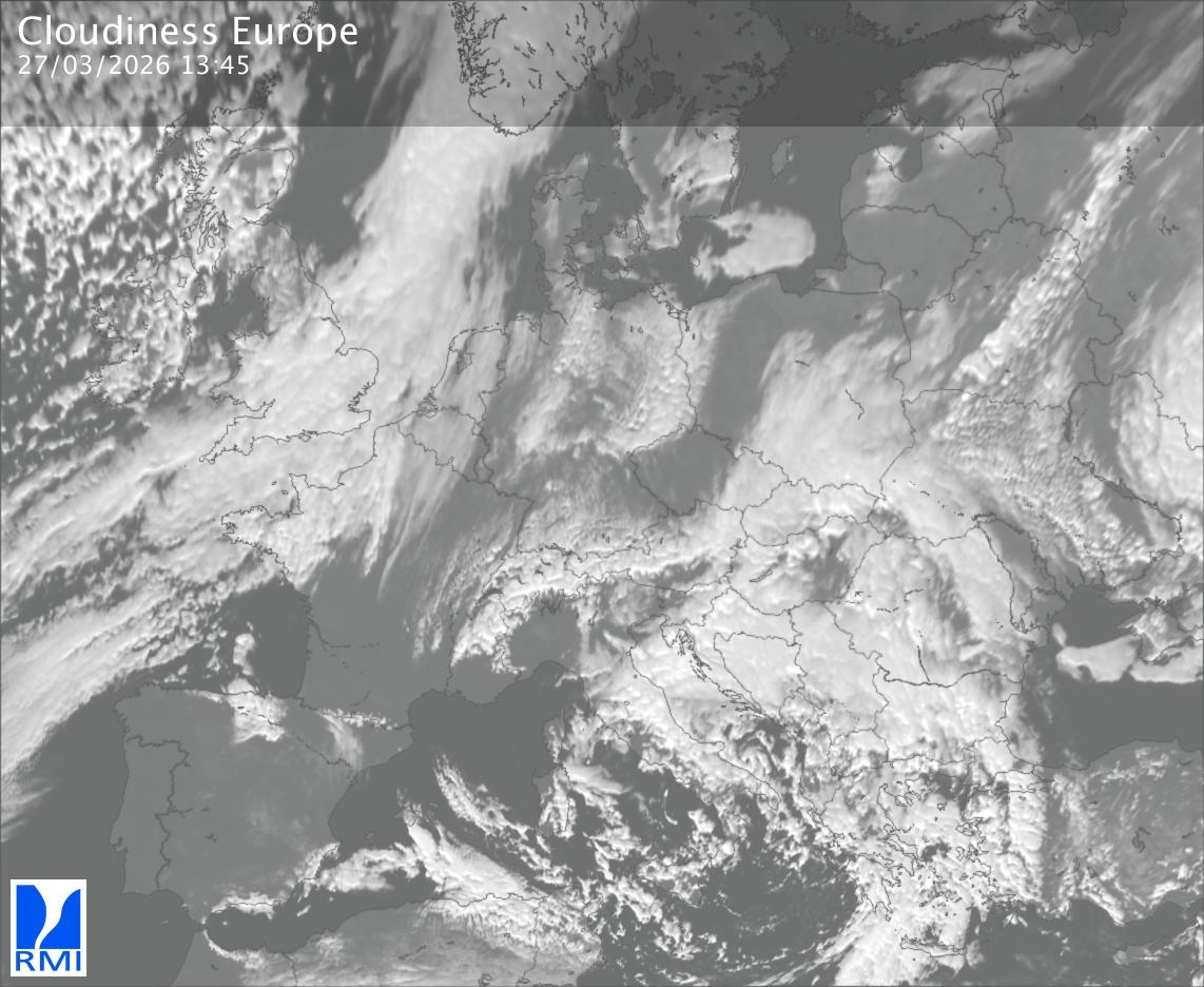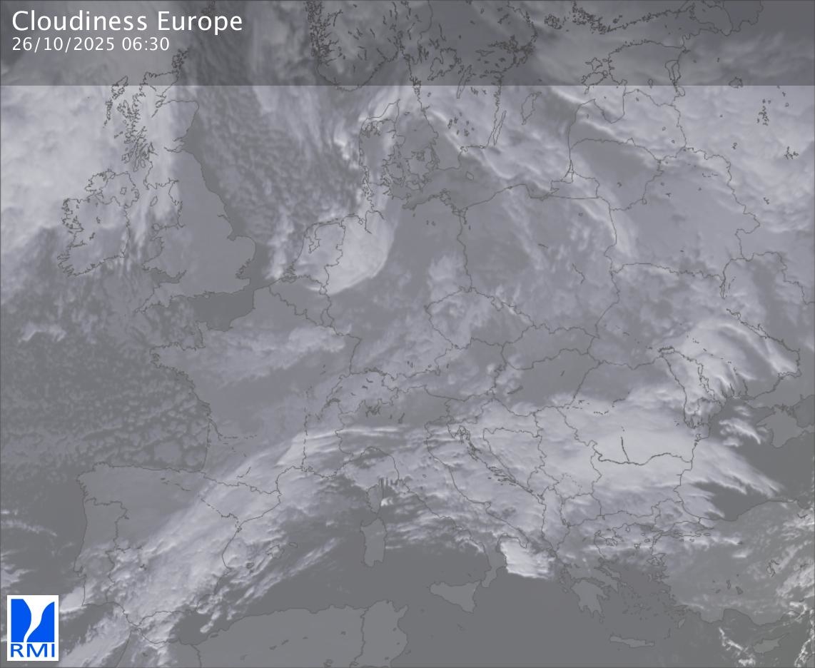 The satellite image of Europe is composed by using both the infrared and the visible light channel from the satellite. Because there are no usable visible light images during the night this composition of channels gives us an image that can be used to observe the clouds by day and by night. The pixelated artifacts are due to the lower resolution of the infrared channel.