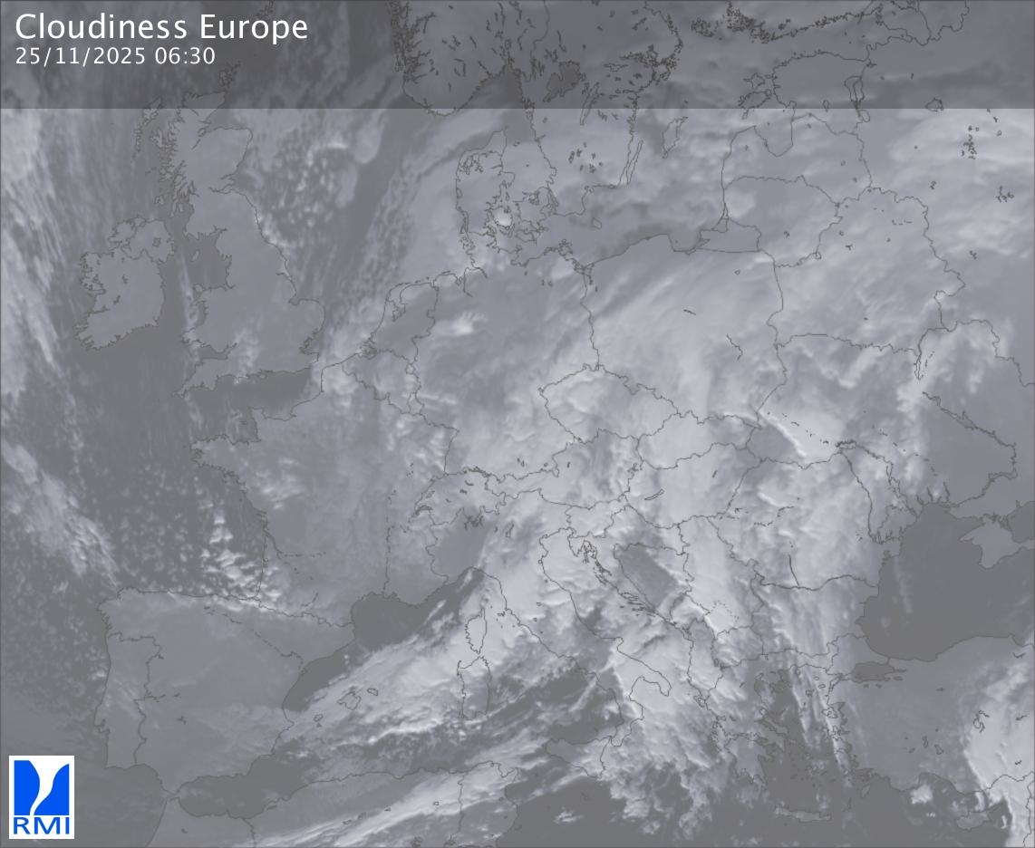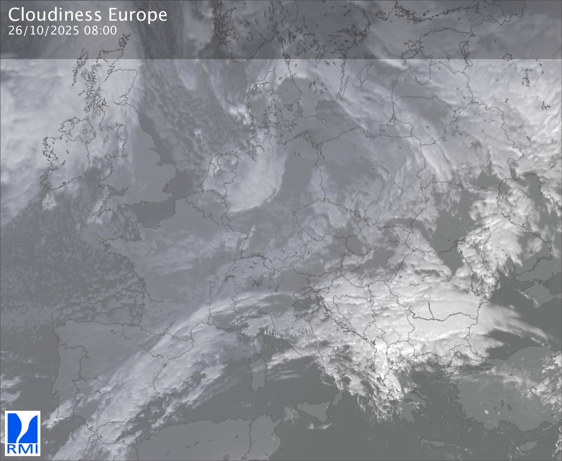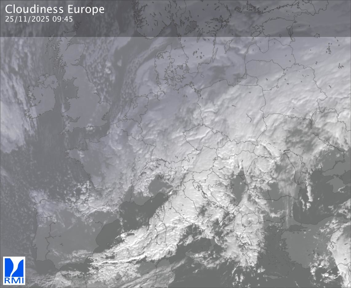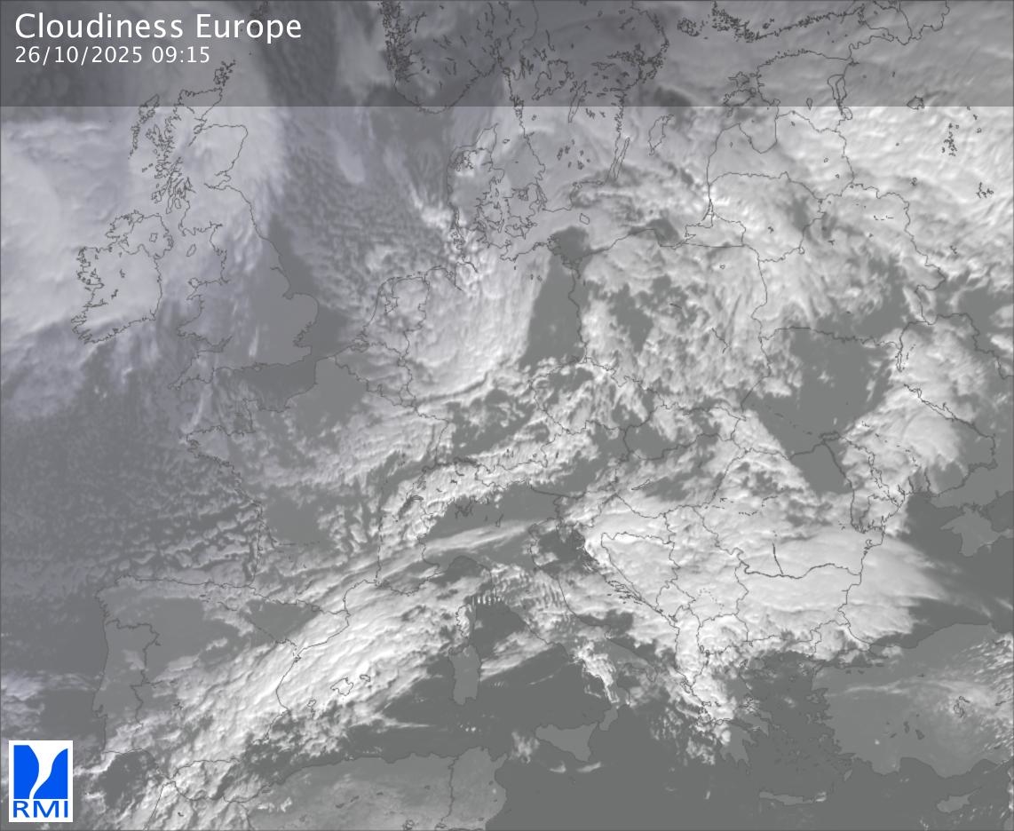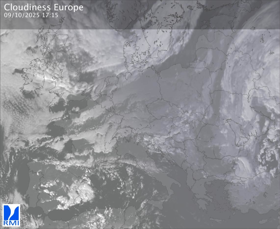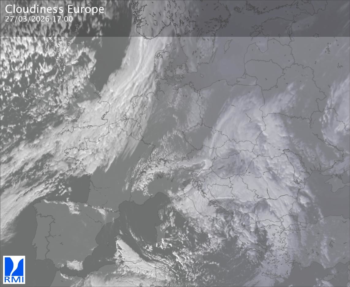 The satellite image of Europe is composed by using both the infrared and the visible light channel from the satellite. Because there are no usable visible light images during the night this composition of channels gives us an image that can be used to observe the clouds by day and by night. The pixelated artifacts are due to the lower resolution of the infrared channel.
