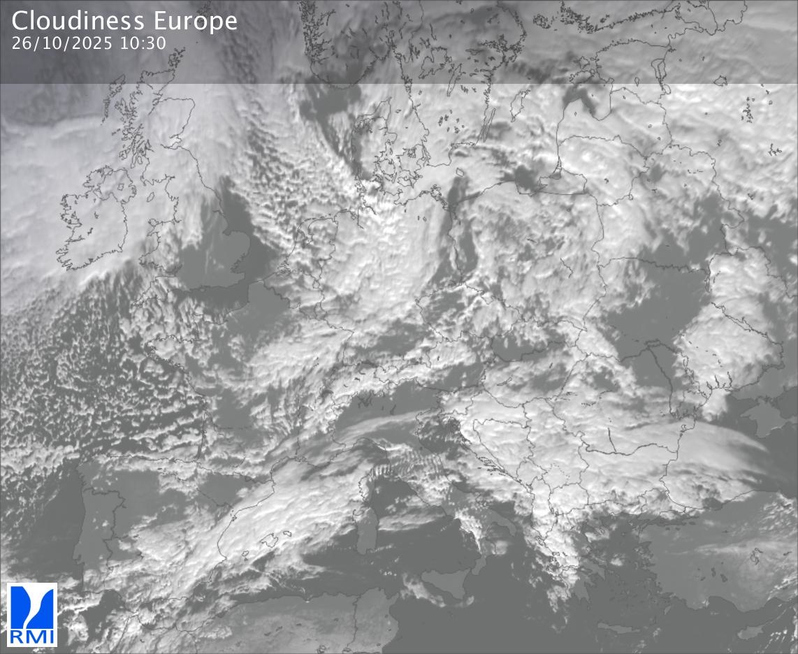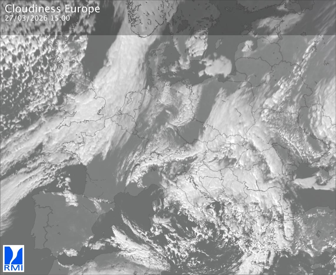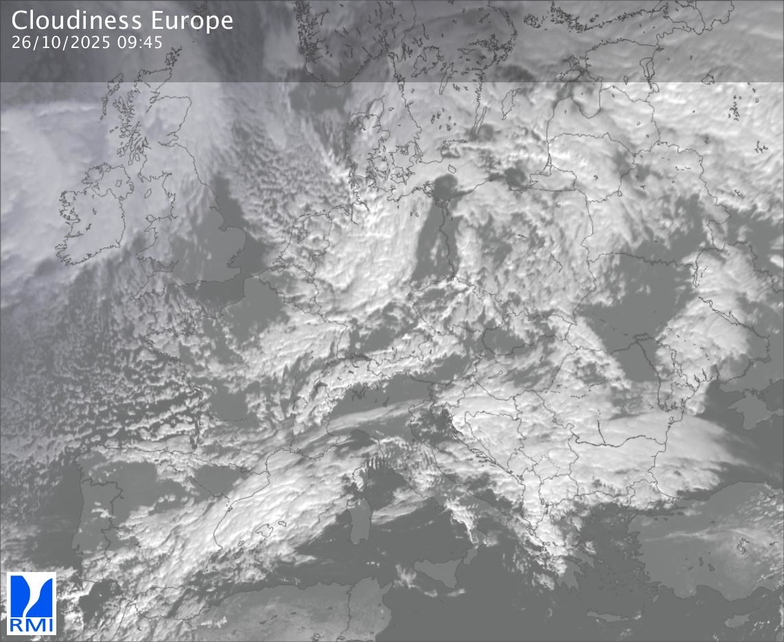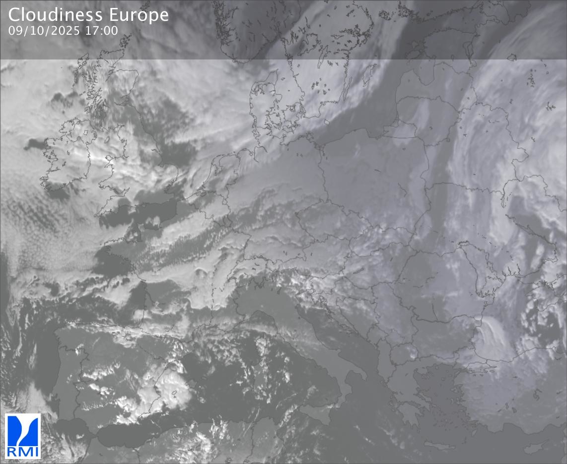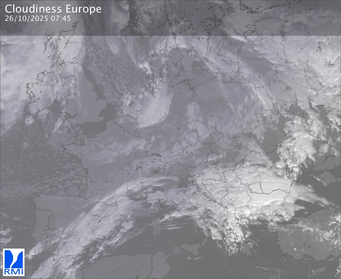 The satellite image of Europe is composed by using both the infrared and the visible light channel from the satellite. Because there are no usable visible light images during the night this composition of channels gives us an image that can be used to observe the clouds by day and by night. The pixelated artifacts are due to the lower resolution of the infrared channel.