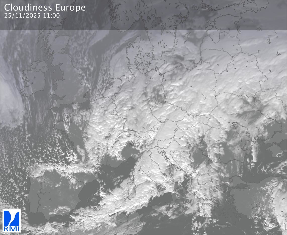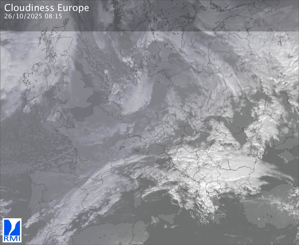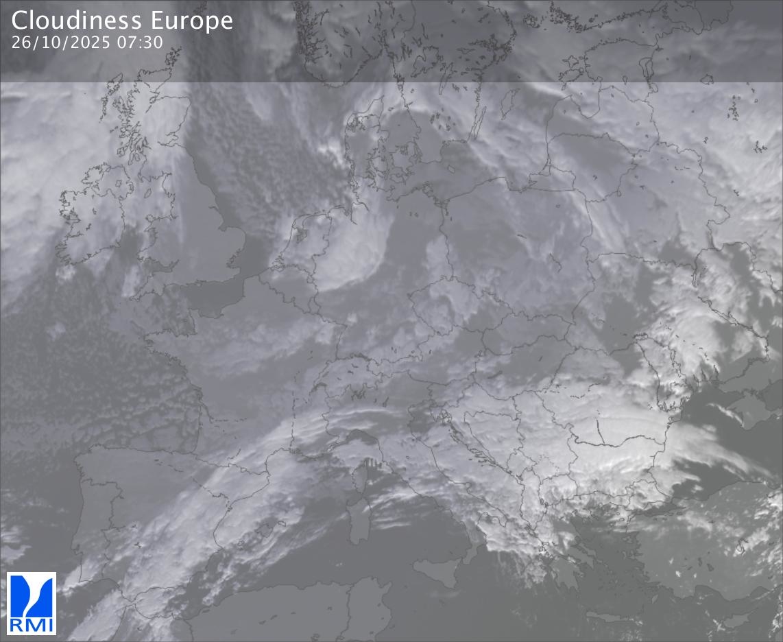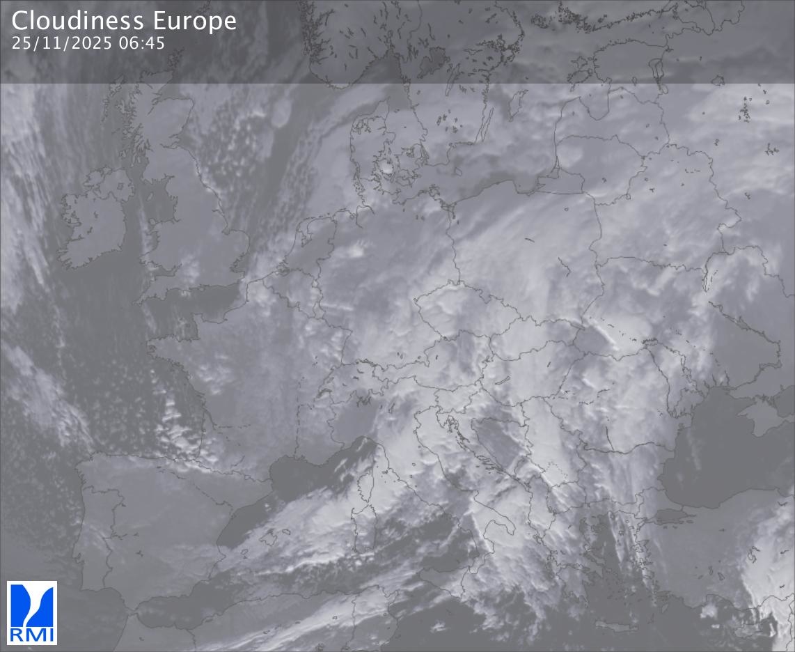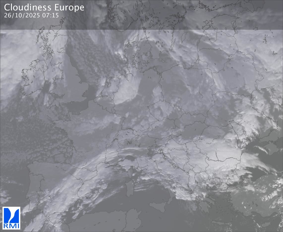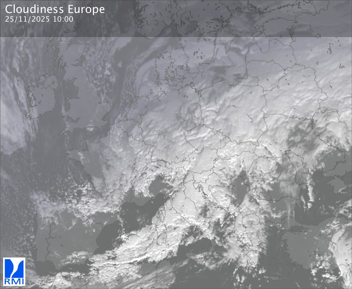 The satellite image of Europe is composed by using both the infrared and the visible light channel from the satellite. Because there are no usable visible light images during the night this composition of channels gives us an image that can be used to observe the clouds by day and by night. The pixelated artifacts are due to the lower resolution of the infrared channel.