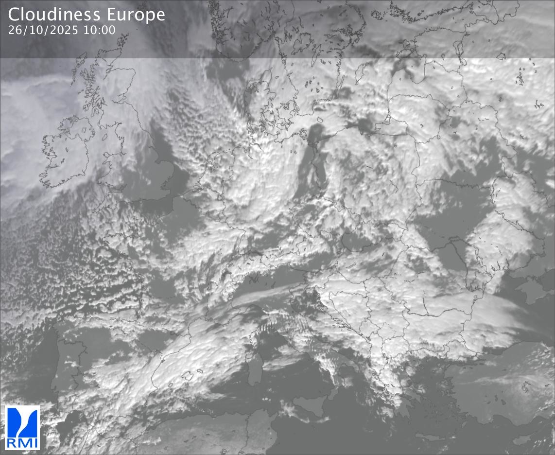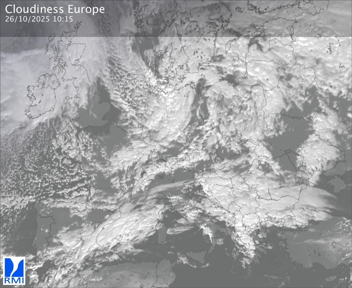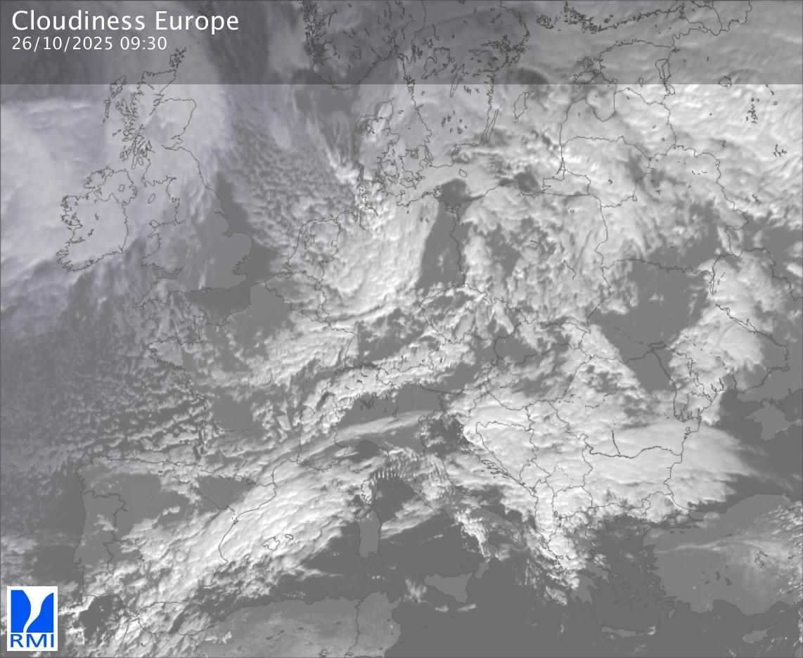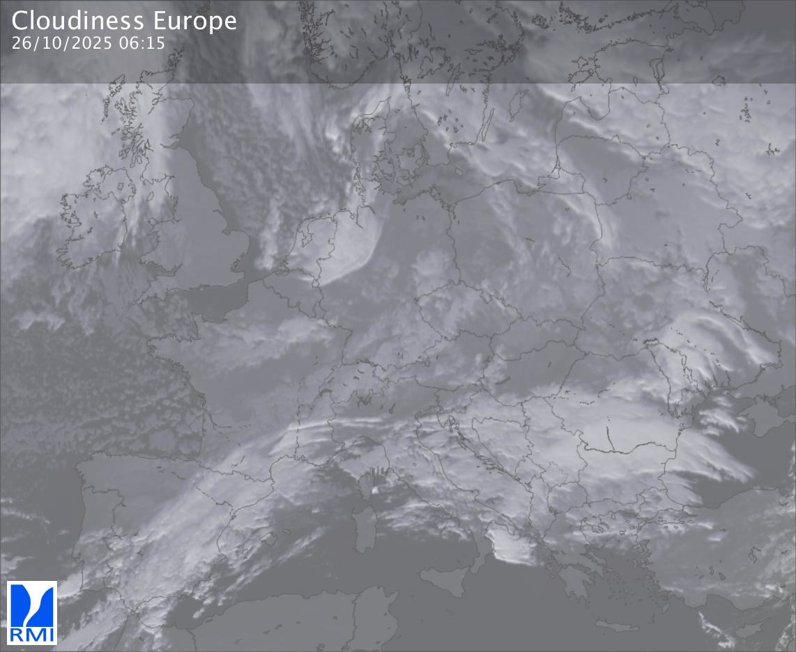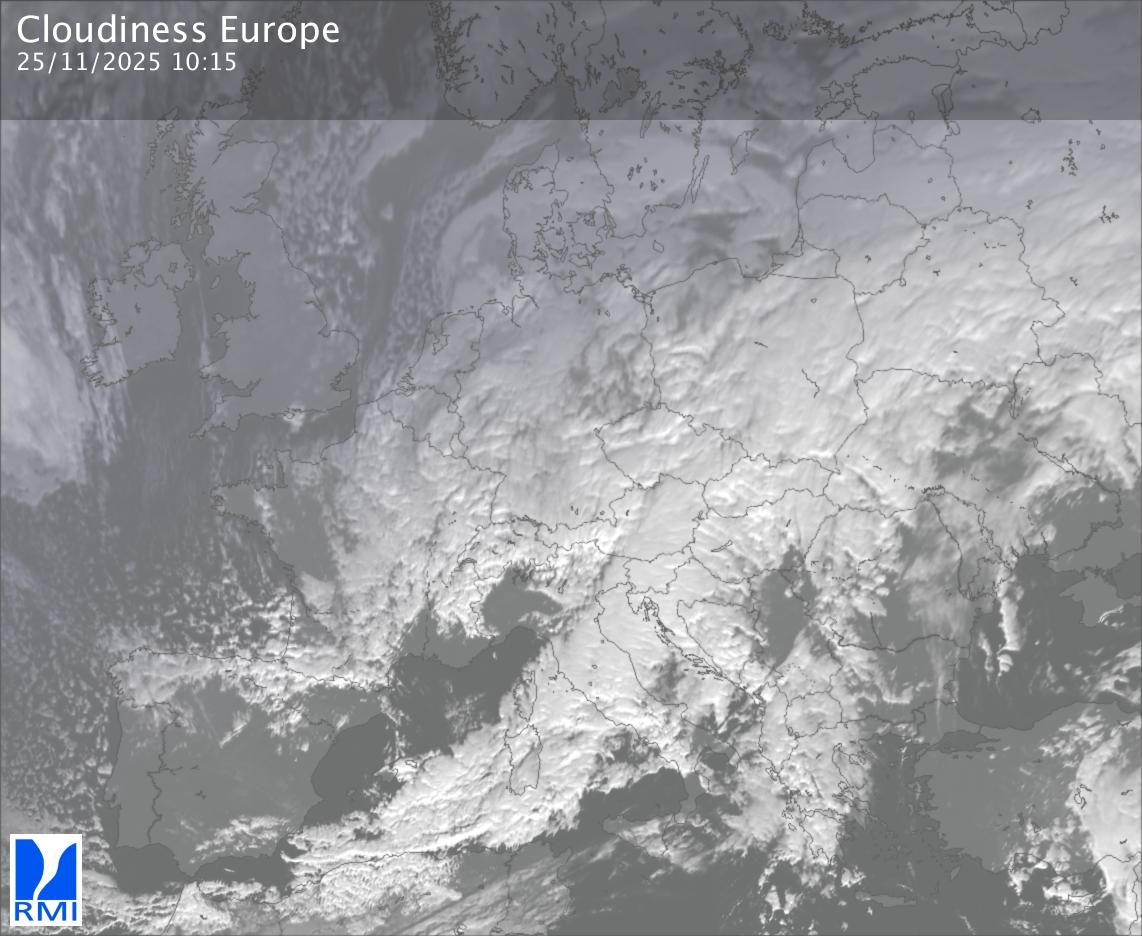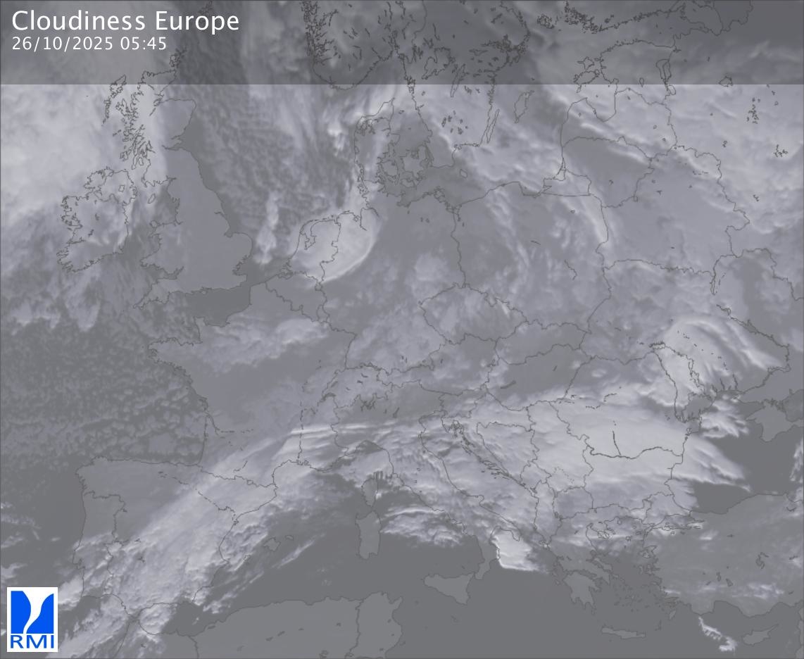 The satellite image of Europe is composed by using both the infrared and the visible light channel from the satellite. Because there are no usable visible light images during the night this composition of channels gives us an image that can be used to observe the clouds by day and by night. The pixelated artifacts are due to the lower resolution of the infrared channel.
