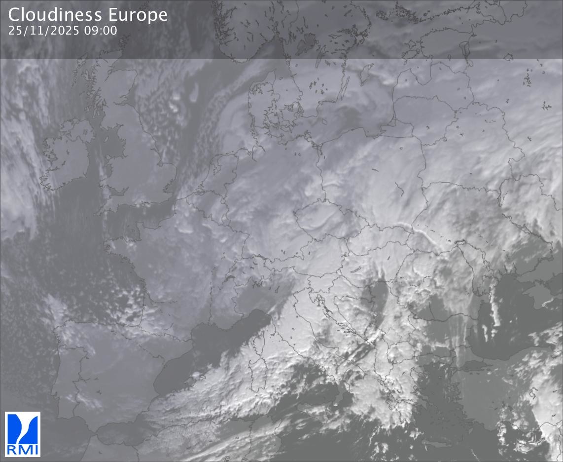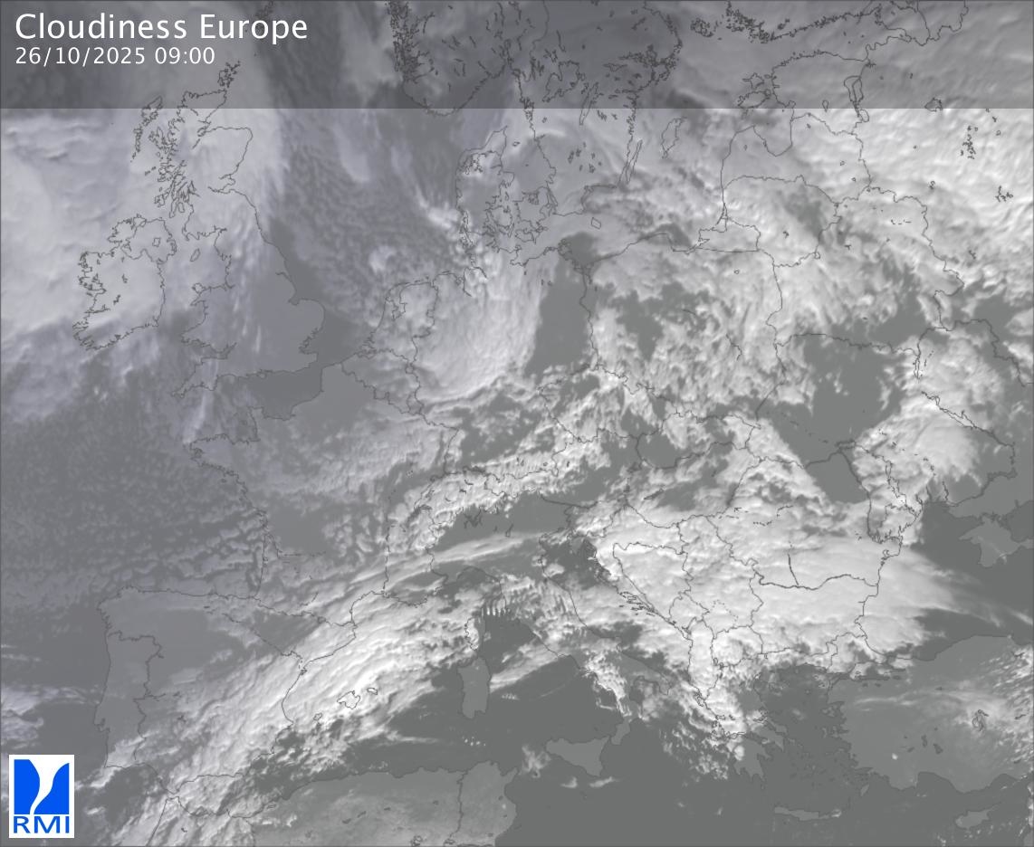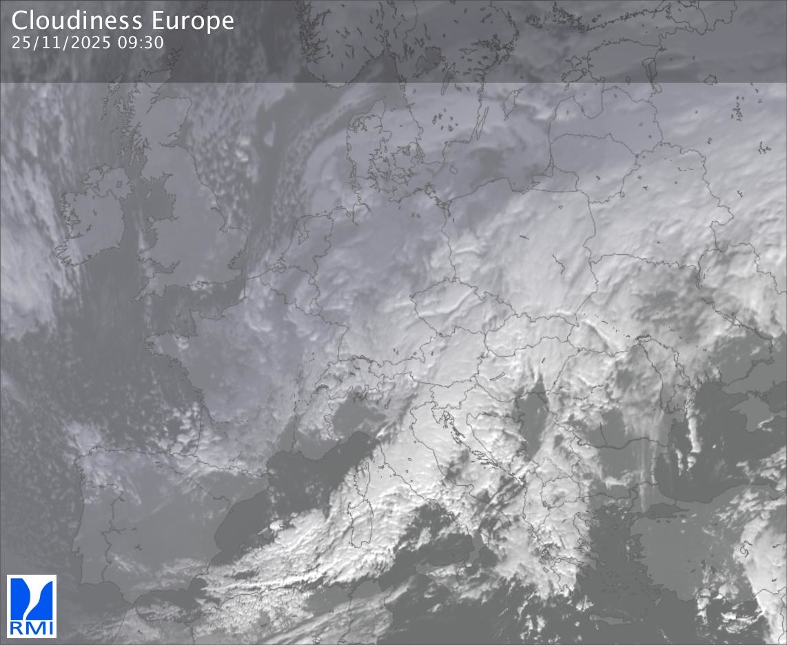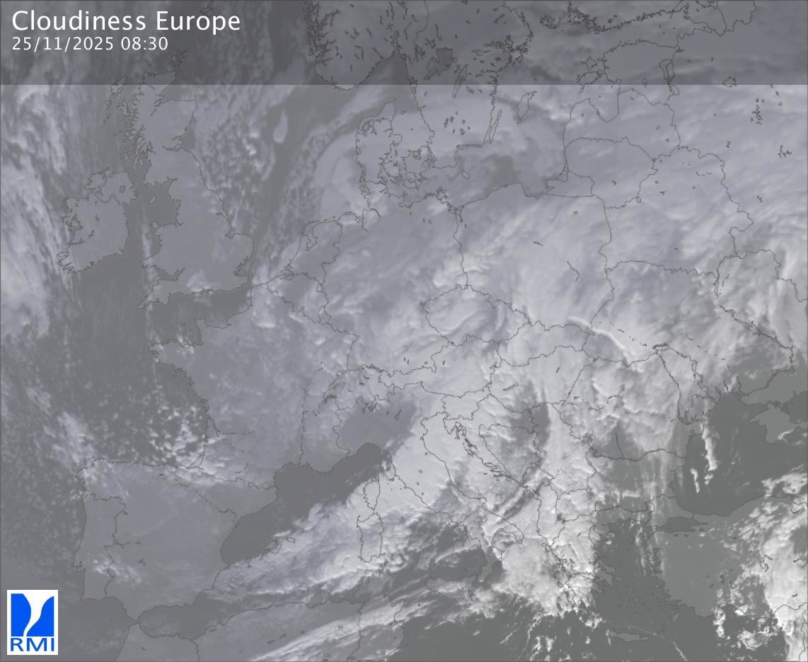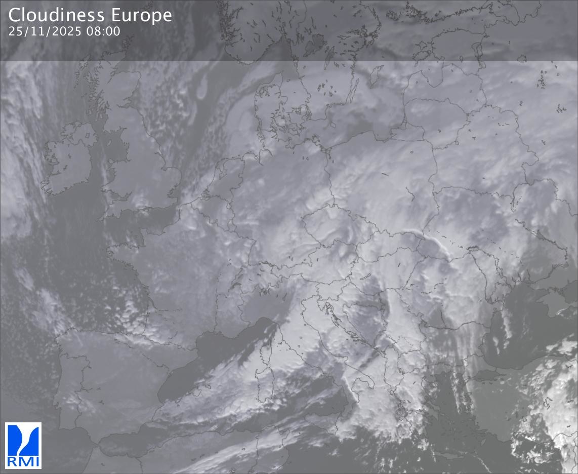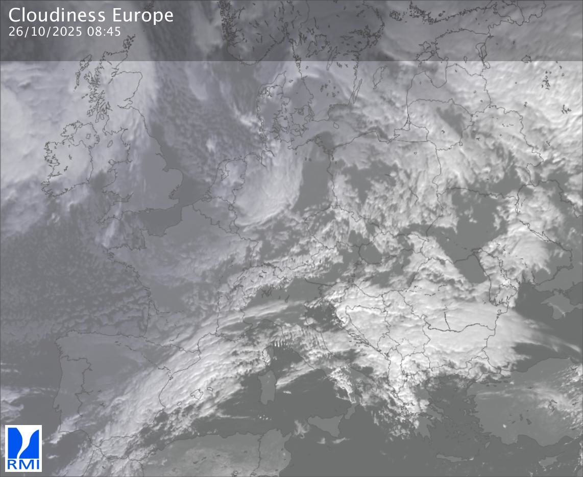 The satellite image of Europe is composed by using both the infrared and the visible light channel from the satellite. Because there are no usable visible light images during the night this composition of channels gives us an image that can be used to observe the clouds by day and by night. The pixelated artifacts are due to the lower resolution of the infrared channel.