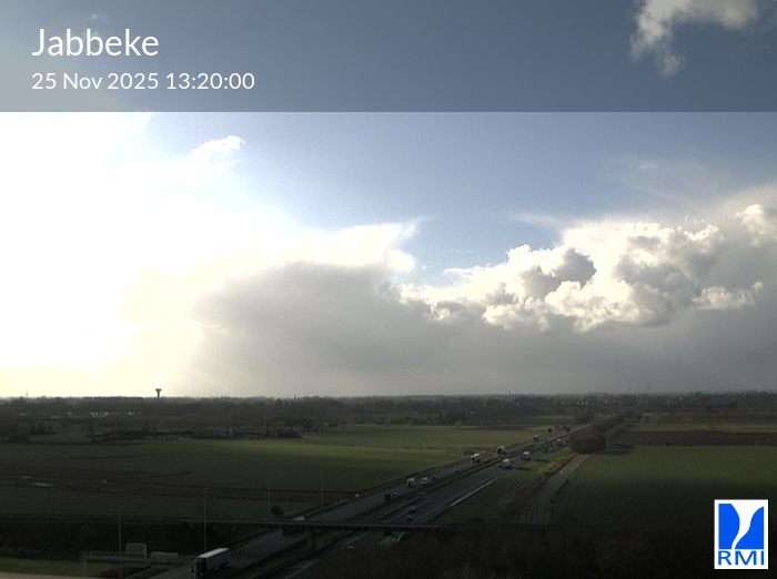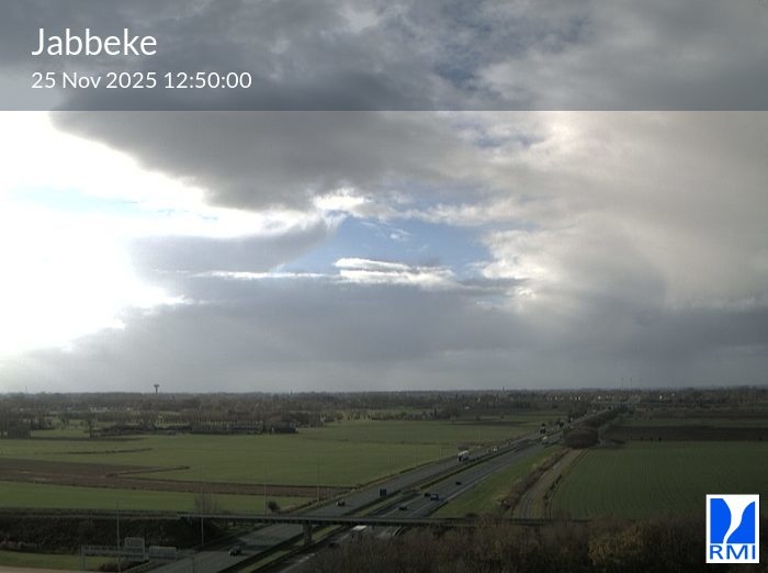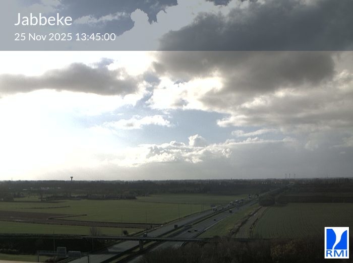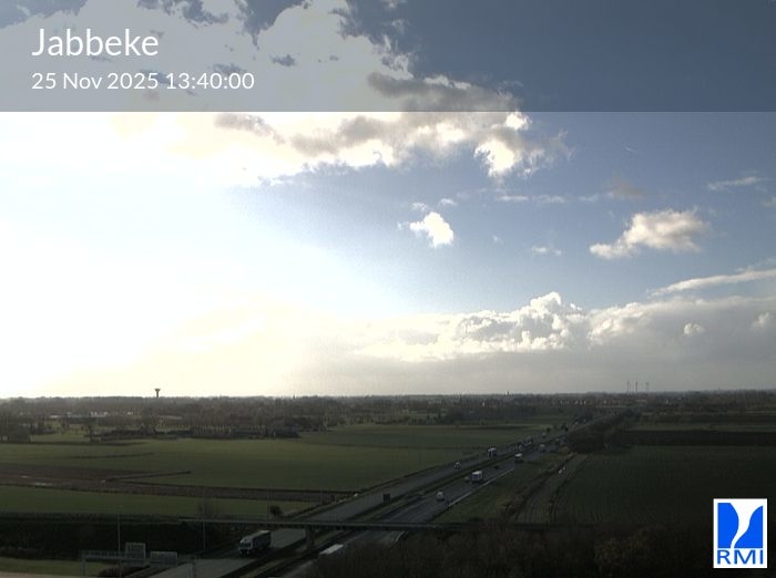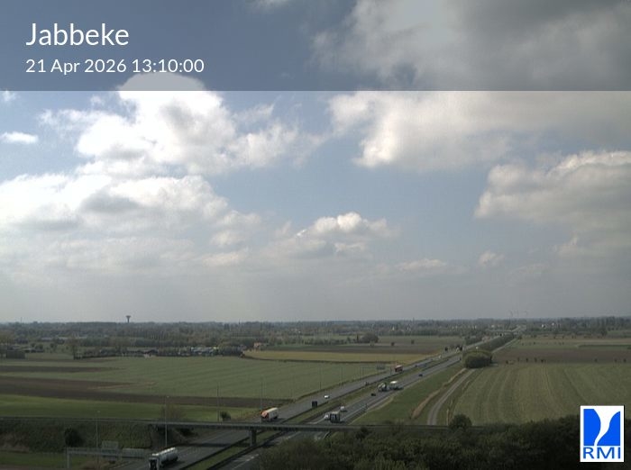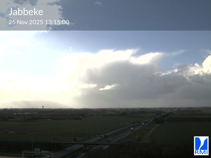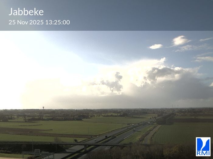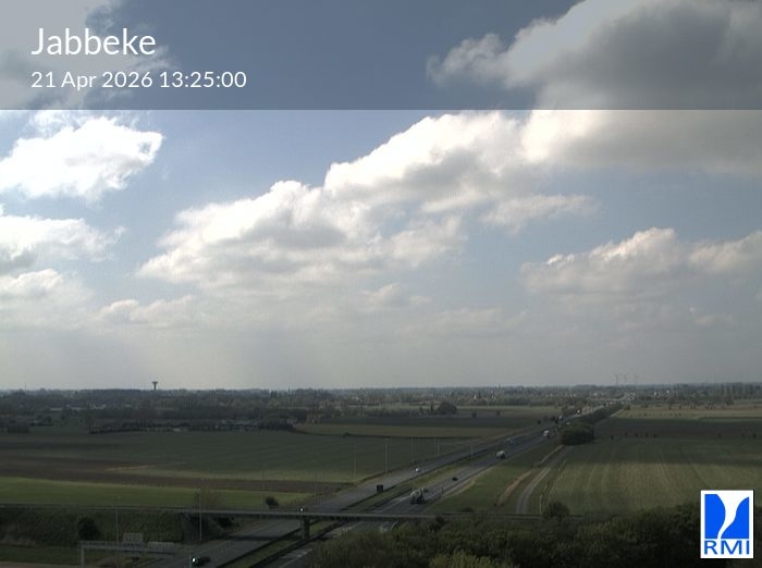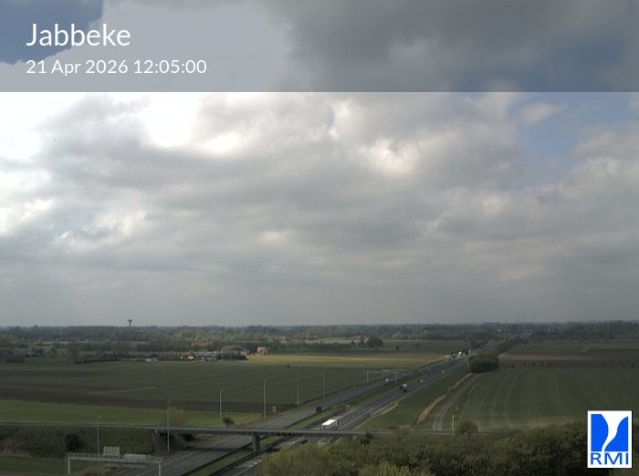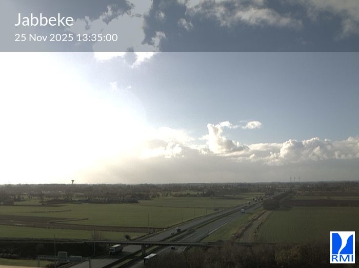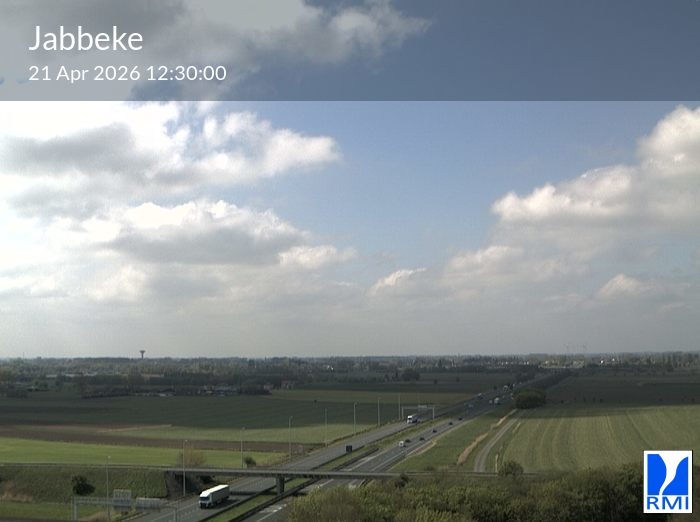 The webcam is located on the tower of the RMI weather radar in Jabbeke at the junction of the E40 highway towards France and the A10 to the coast (Ostend).