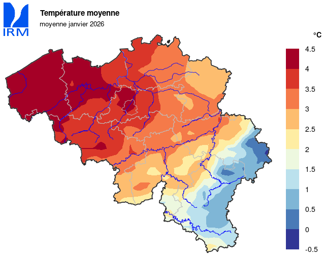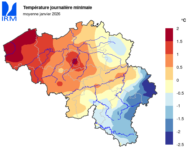 Sur l’ensemble de notre territoire, la température minimale la plus basse a été enregistrée le 5 janvier à Elsenborn (Bütgenbach) avec -12,2°C. La température maximale la plus élevée a été enregistrée le 17 à Korbeek-Lo (Bierbeek) et à Molenbeek-Saint-Jean avec 14,1°C.