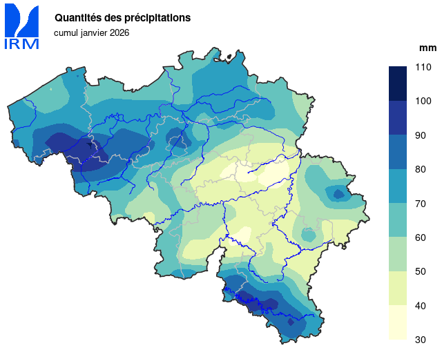 Au sein du réseau de mesure climatologique de l'IRM, le total journalier le plus élevé a également été enregistré le 9 janvier à Korbeek-Lo (Bierbeek) (39,4 mm).