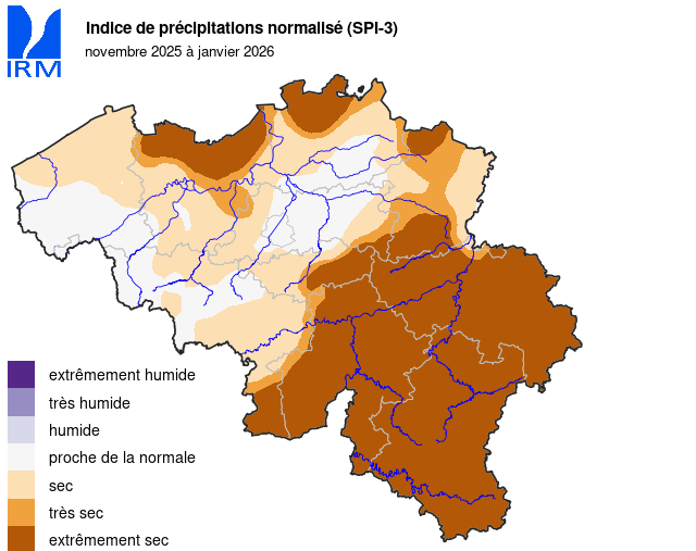 Sur l’ensemble de notre territoire, les précipitations mensuelles totales ont oscillé autour des normales. Les précipitations les plus faibles ont été enregistrées dans les Ardennes et dans la région de la Gileppe et de la Warche (environ 50 % de la quantité normale), tandis que les précipitations les plus importantes ont été enregistrées en Flandre (environ 115 % de la quantité normale).