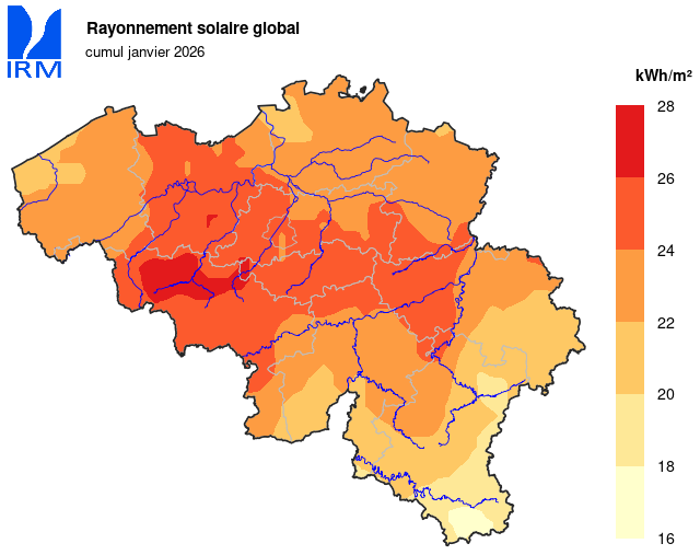 Pendant longtemps, tout semblait indiquer que janvier serait un mois plutôt ensoleillé à Uccle. La fin du mois très sombre – seulement 4 h 17 min de soleil pendant les 6 derniers jours (normalement : 12 h 47 min) – a fait que l'ensoleillement de ce mois a finalement été très proche de la valeur normale : 62 h 35 min (normalement : 59 h 04 min).