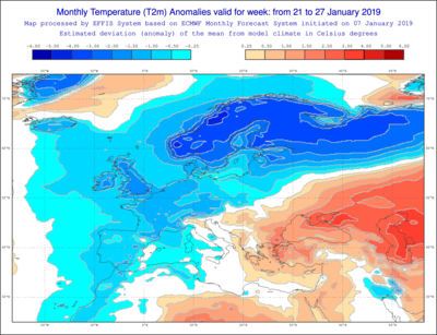 Figure 3. Cartes du modèle de prévision à long-terme ECMWF du 14 janvier concernant la prévision des anomalies de pression (par rapport à la normale) pour la période du 14 au 20 janvier ainsi que pour la période du 21 janvier au 27 janvier.
