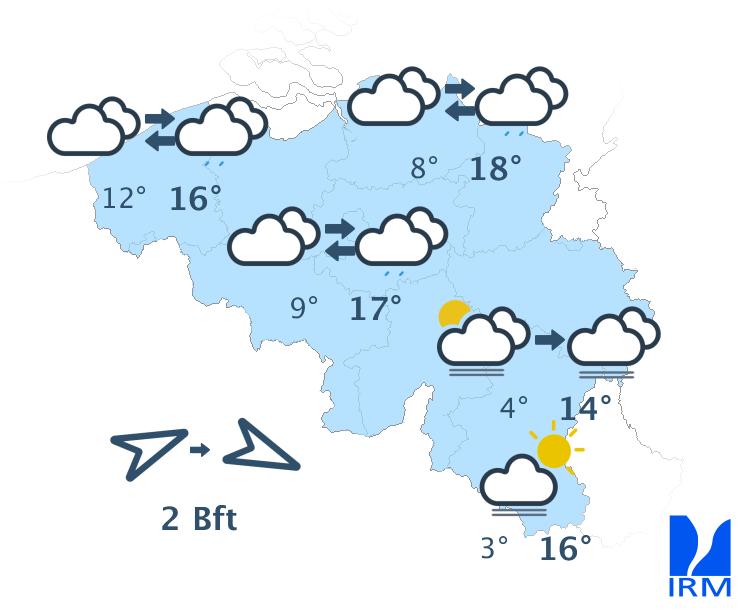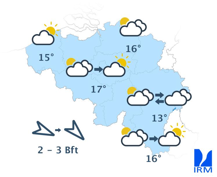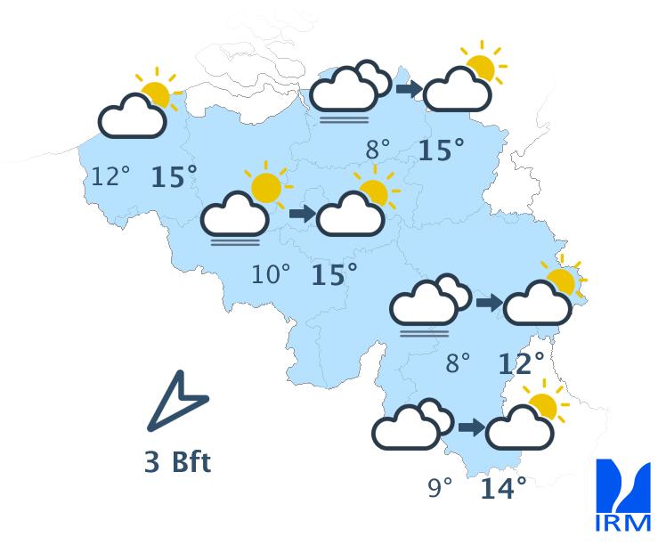 Ce matin, des éclaircies s'étendront du centre vers l'Ardenne. Sur l'ouest, il faudra par contre composer avec davantage de nuages bas. L'après-midi, l'ouest et le sud-est du territoire profiteront d'assez larges éclaircies alors qu'une large partie centrale devra composer avec des périodes très nuageuses pouvant mener à une petite ondée localisée. Les températures maximales seront comprises entre 11 degrés dans les Hautes-Fagnes et 16 degrés dans l'ouest. Le vent sera faible, parfois modéré l'après-midi, soufflant principalement du nord-ouest.