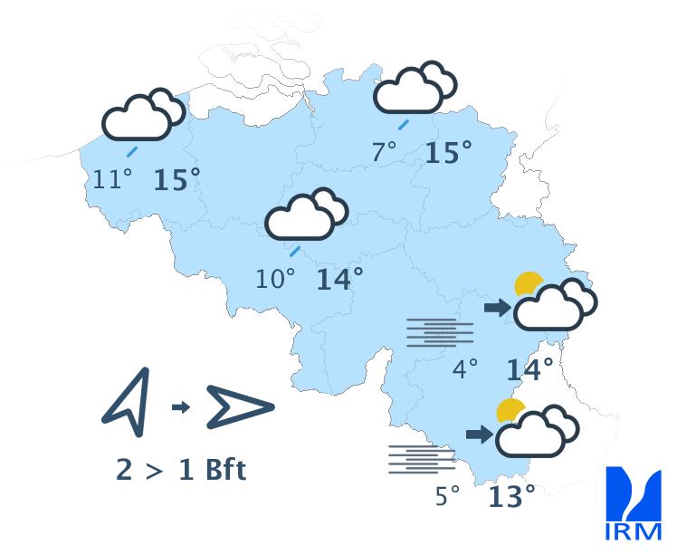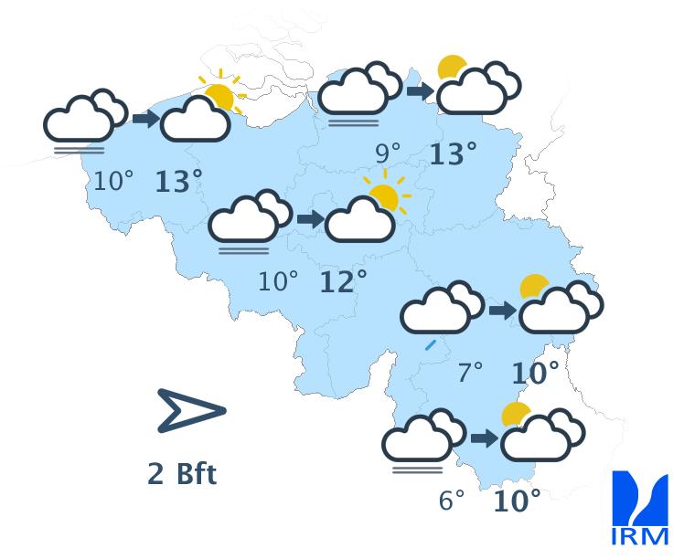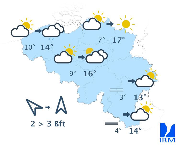 Demain, après la dissipation de l'éventuelle grisaille matinale présente par endroits, le temps sera ensoleillé sur l'est et le centre du pays (même si quelques bancs de nuages bas pourraient localement être plus tenaces sur le versant sud du relief de l'Ardenne). Des champs nuageux plus nombreux dériveront sur l'ouest du territoire et pourraient atteindre le centre en fin d'après-midi. Les maxima seront compris entre 12 ou 13 degrés en Hautes-Fagnes et 16 ou 17 degrés dans le nord-est du pays, sous un vent faible à modéré s'orientant au secteur sud.