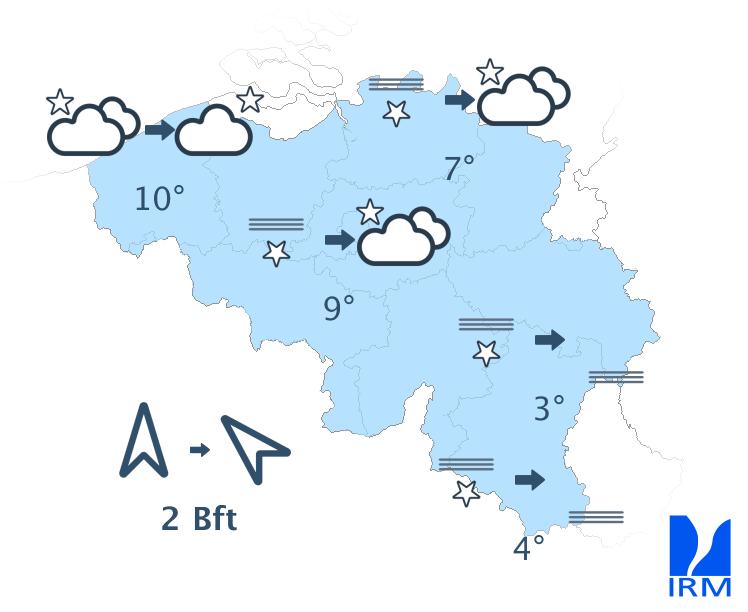 Ce soir, les champs nuageux deviendront temporairement plus nombreux sur la moitié ouest du territoire. Ensuite, le ciel sera peu à partiellement nuageux partout. En fin de nuit, quelques bancs de nuages bas se formeront par endroits et du brouillard sera localement possible en Ardenne. Les minima se situeront entre 1 ou 2 degrés dans certaines vallées froides de l'est du pays et 9 ou 10 degrés à la côte ainsi qu'au coeur de certaines grandes villes. Le vent sera faible à parfois modéré de secteur sud à sud-est.