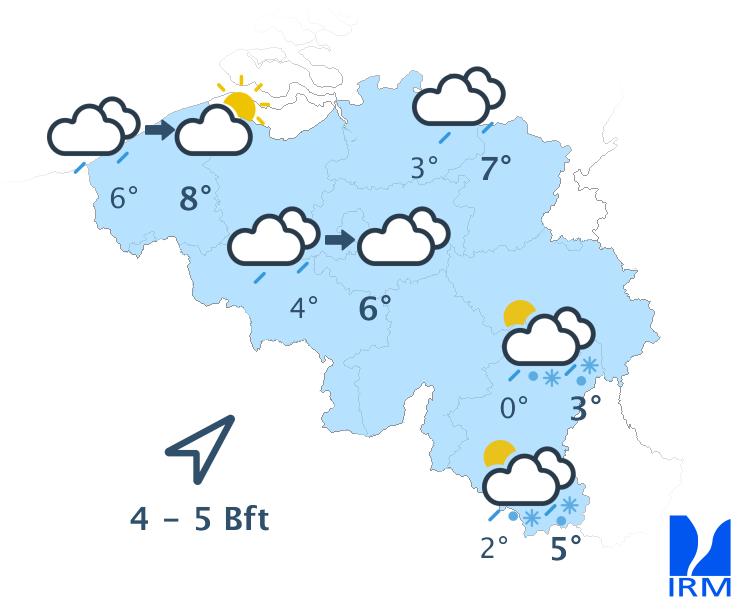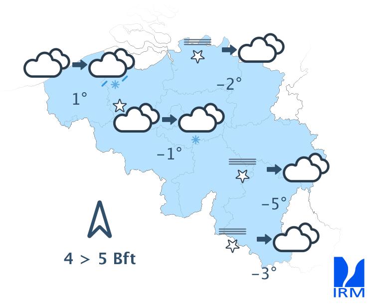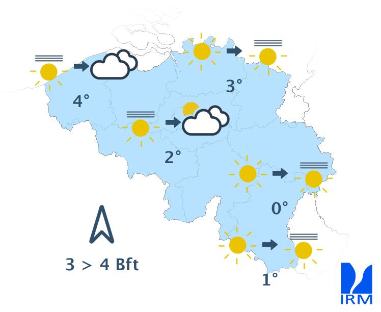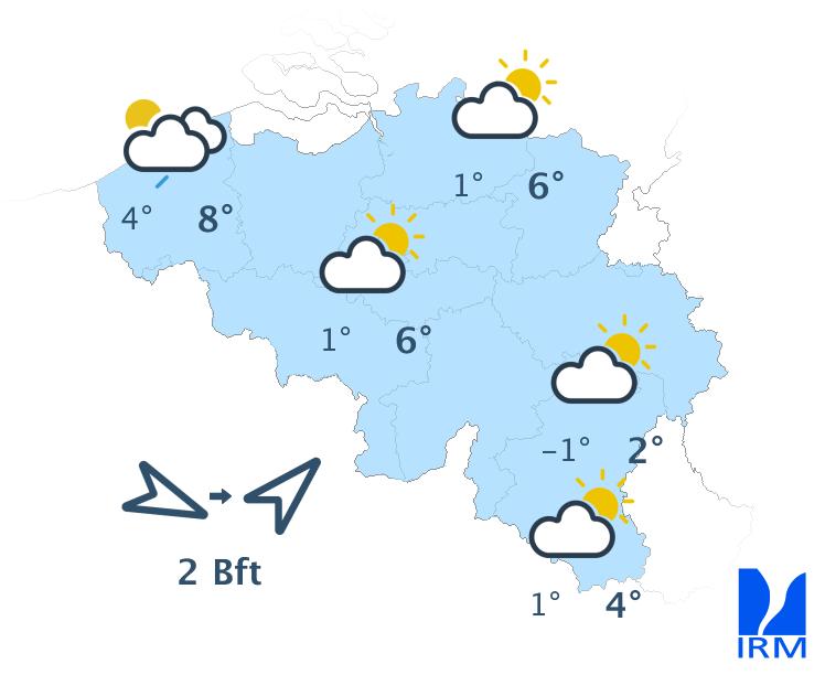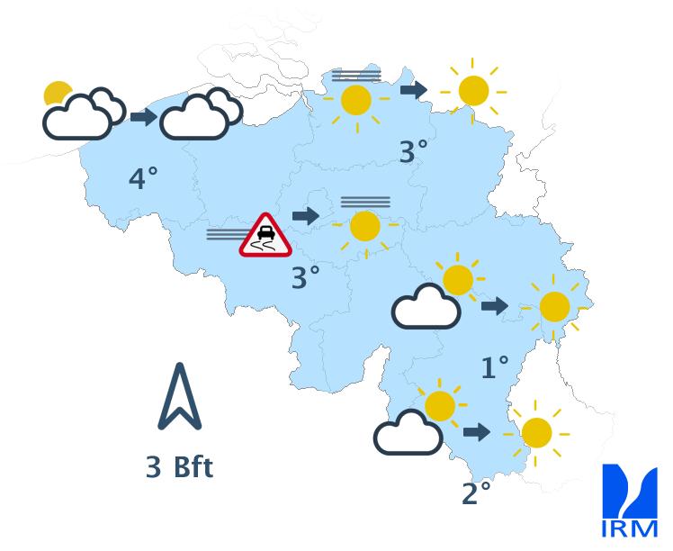 Ce matin, il gèlera partout avec des nuages bas locaux, du brouillard givrant et localement aussi un risque de conditions glissantes. Après dissipation de la grisaille, le temps sera sec et assez ensoleillé, même si des nuages élevés et moyens envahiront l'ouest et le centre du pays au cours de la journée. Les maxima oscilleront entre -1 degré en Ardenne et +4 degrés à la côte. Le vent sera généralement modéré de sud. Dans l'après-midi, il deviendra assez fort à la côte.