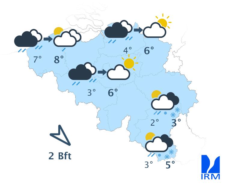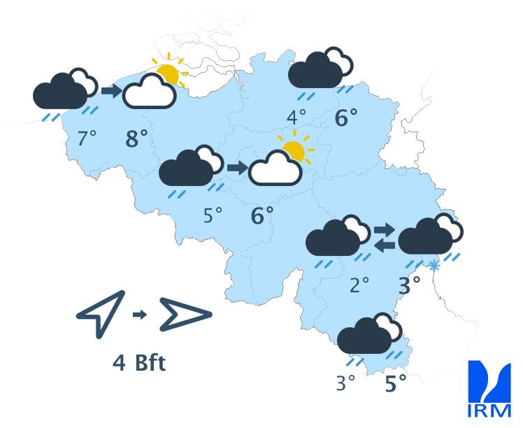 Demain matin, un peu de neige sera encore observée sur la moitié est du pays tandis qu'un temps temporairement plus sec gagnera l'ouest et le centre. Une nouvelle zone de pluie assez active gagnera ensuite rapidement nos régions depuis le littoral et s'étendra vers l'est durant l'après-midi. Sur le Massif ardennais, les premières précipitations liées à cette perturbation se feront encore sous forme de neige et très temporairement, un risque de verglas sera à craindre. A l'arrière de la perturbation, des éclaircies reviendront sur l'ouest. Les maxima, atteints en fin de journée, seront compris entre 0 degré sur les Cantons de l'Est, 5 degrés sur le centre et 7 degrés au littoral. Le vent sera modéré à parfois assez fort, assez fort au littoral, de secteur sud virant au sud-ouest, et jusqu'à l'ouest-sud-ouest à la mer, avec des rafales de 50 à 60 km/h.