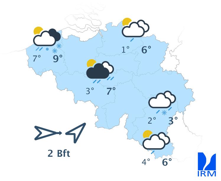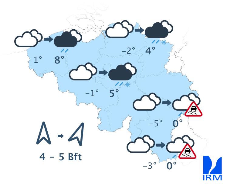Ce soir, la nébulosité augmentera et, en début de nuit, une perturbation accompagnée de précipitations hivernales atteindra la côte, puis traversera le pays d'ouest en est dans le courant de la nuit, apportant de la neige fondante ou de la neige. Les minima, atteints en début de nuit, seront compris entre -5 degrés en Ardenne et 0 ou 1 degré en Flandre. Le vent sera généralement modéré dans l'intérieur des terres. Le vent de sud sera assez fort, voire parfois fort à la côte avec des rafales jusque 55 km/h.