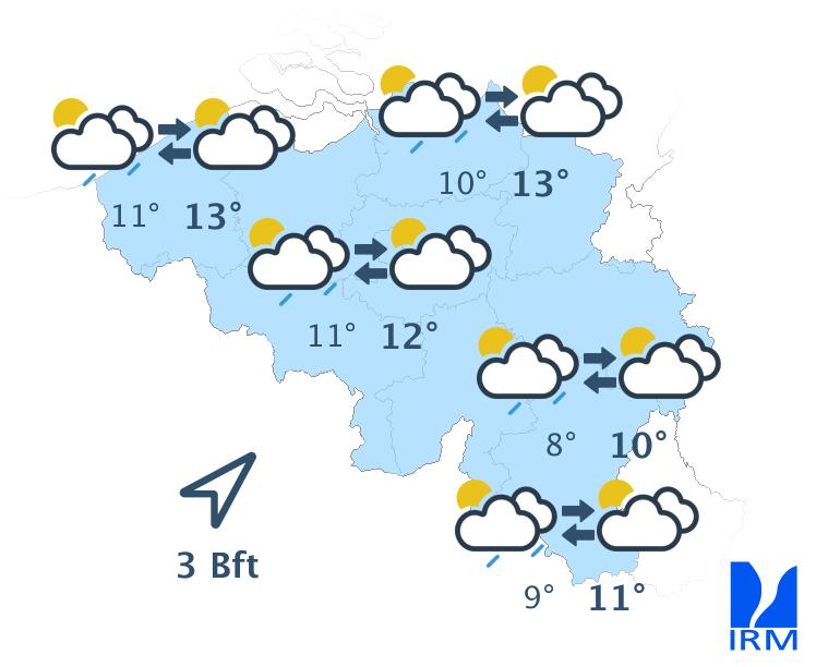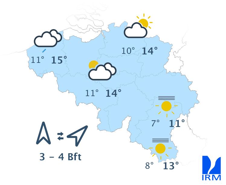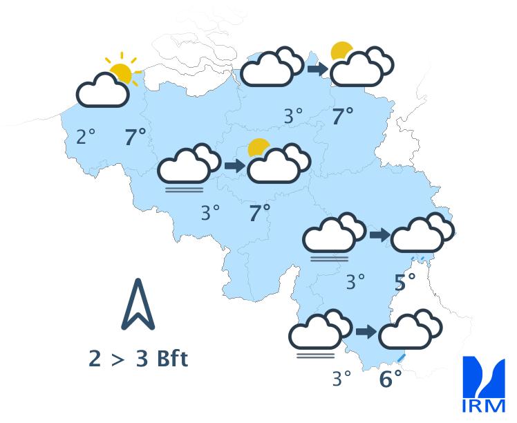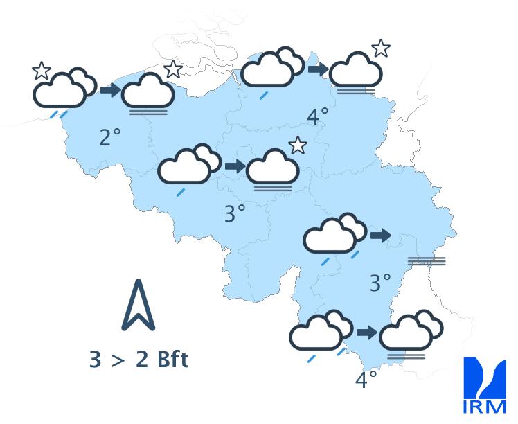 Ce matin, le temps sera sec dans la plupart des régions avec surtout sur le nord-est du pays, des éclaircies parfois larges qui pourront persister jusqu'en après-midi. Il y aura par contre de nombreux nuages bas en Ardenne, réduisant parfois la visibilité et accompagnés d’un peu de bruine. En cours de journée, une zone de pluie plutôt faible progressera d'ouest en est sur le pays. Le temps devrait tout de même rester sec sur l’est et le nord-est jusqu’en fin de journée. Les maxima se situeront entre 3 degrés dans les Cantons de l'Est et 8 ou 9 degrés sur le centre et le nord-est du pays. Le vent sera généralement modéré de sud à sud-est.