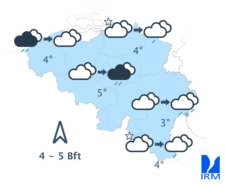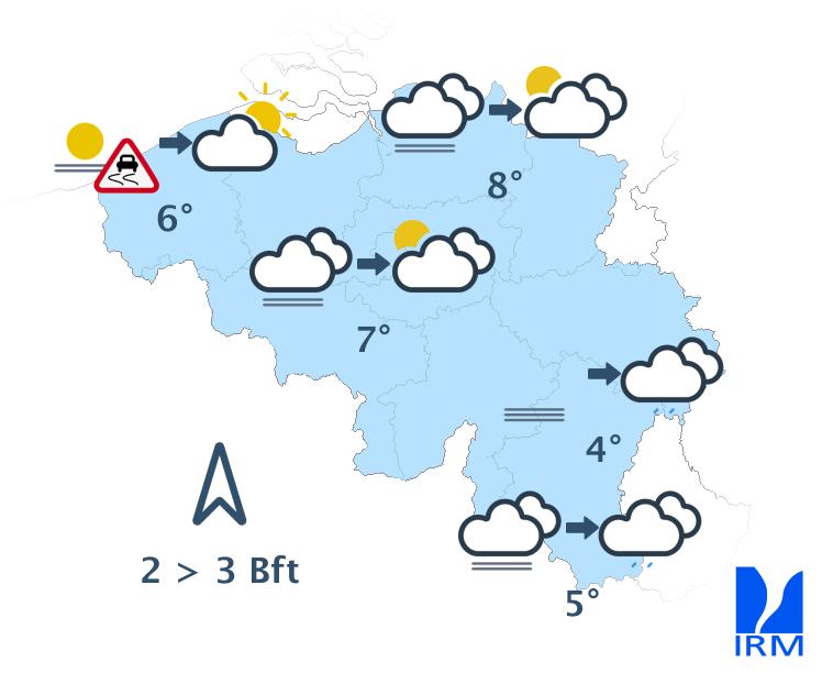 Cet après-midi, les nuages bas recouvriront une grande partie centrale et est du pays. Quelques rayons de soleil parviendront parfois à percer la couverture nuageuse. Sur l'ouest du pays, les éclaircies devraient être nettement plus généreuses. Les maxima varieront entre 4 degrés en haute Ardenne et 7 degrés en Flandre. Le vent sera faible à modéré de secteur sud.