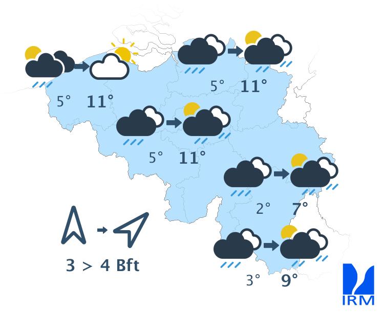 Mardi, la nébulosité sera abondante avec des périodes de faibles pluies. Dans l'extrême sud-est du pays, le temps sera plus sec et pourrait éventuellement aussi être plus lumineux. A la mer, les pluies pourraient par moments devenir un peu plus soutenues. Les maxima varieront de 9 degrés en Hautes-Fagnes à 13 degrés en beaucoup d'endroits en plaine. Le vent sera modéré à assez fort de sud-sud-ouest. Au littoral, il sera assez fort à fort.
