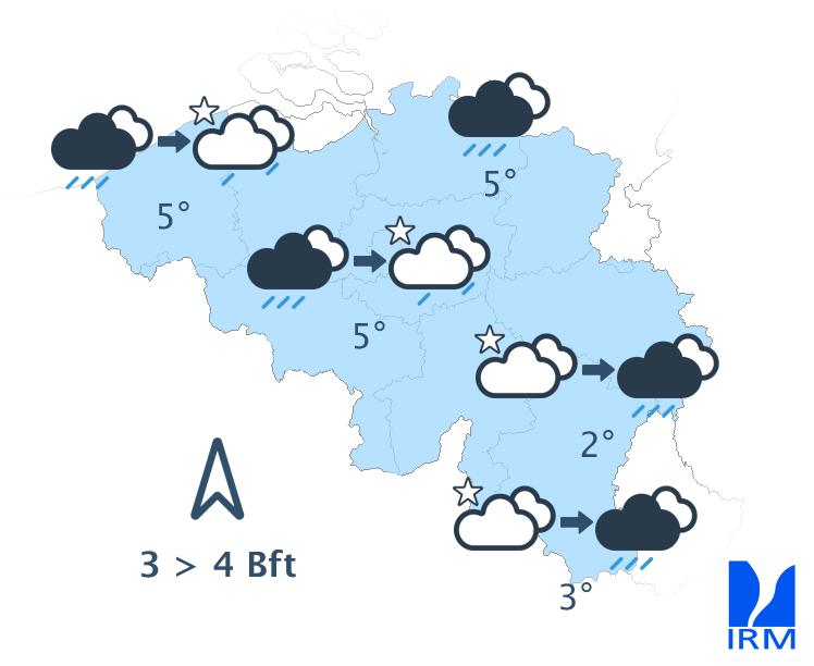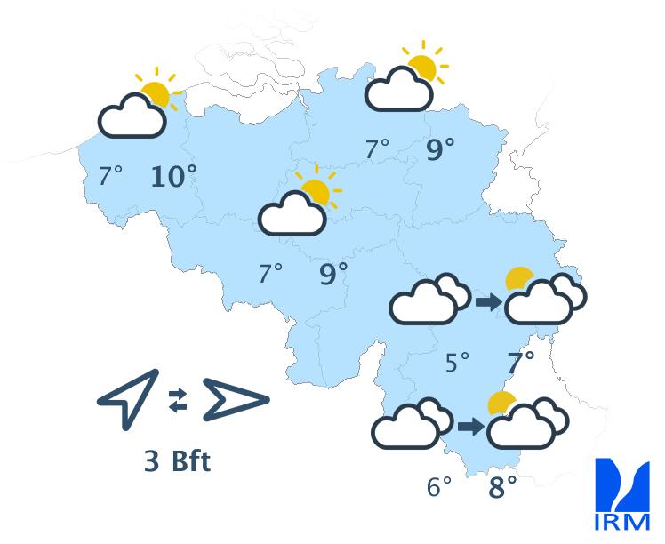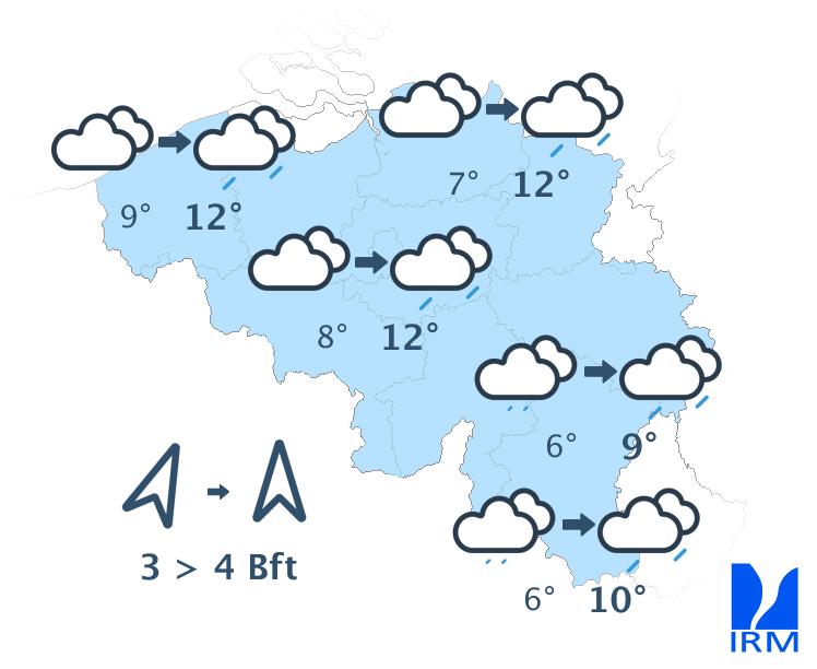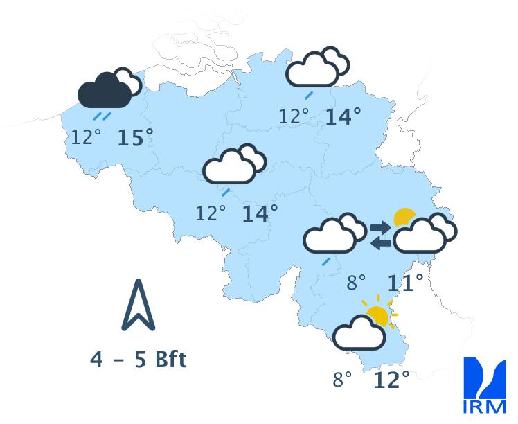 Mardi, la nébulosité sera abondante avec des périodes de faibles pluies. Dans l'extrême sud-est du pays, le temps sera plus sec et pourrait éventuellement aussi être plus lumineux. A la mer, les pluies pourraient par moments devenir un peu plus soutenues. Les maxima varieront de 9 degrés en Hautes-Fagnes à 13 degrés en beaucoup d'endroits en plaine. Le vent sera modéré de sud-sud-ouest. Au littoral, il sera assez fort.