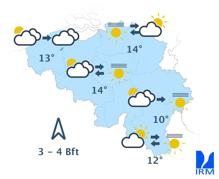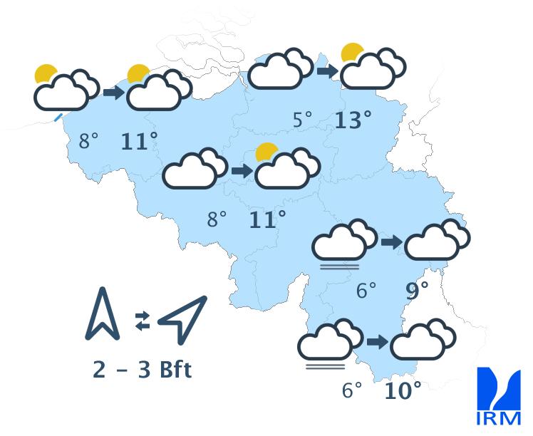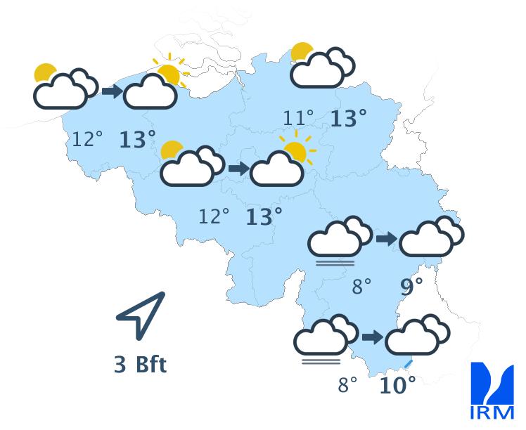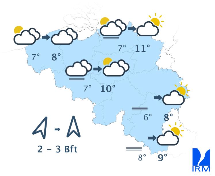 Demain, le temps restera généralement sec avec une alternance d'éclaircies et de passages nuageux dans l'ouest et le centre du pays. Dans l'est, le ciel sera généralement très nuageux, avec parfois de la brume ou du brouillard sur le relief des Ardennes. Dans l'extrême sud-est quelques pluies resteront possibles. Les températures maximales seront comprises entre 9 degrés sur les hauteurs ardennaises et 13 degrés en Flandre, avec un vent généralement modéré de secteur sud-ouest.