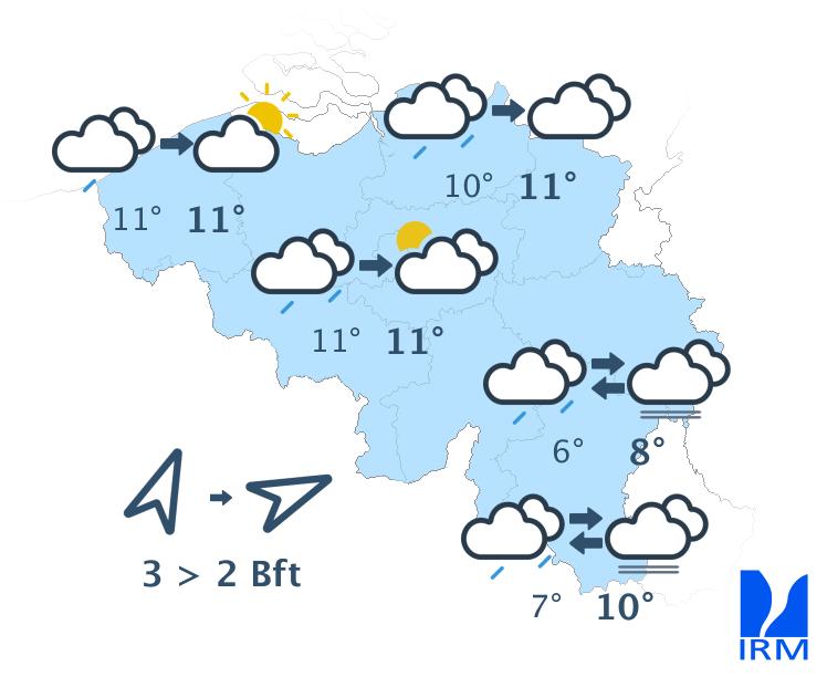 Demain, la nébulosité sera abondante avec des pluies faibles à modérées par intermittence. De larges éclaircies reviendront rapidement sur l'ouest du pays. Le temps sec se propagera sur le centre du pays en milieu de journée, mais l'est et le sud-est devront encore composer avec de faibles pluies l'après-midi. Les nuages bas réduiront parfois la visibilité sur les hauteurs de l'Ardenne. Les maxima varieront entre 8 degrés dans les Hautes Fagnes et 11 degrés en Basse Belgique. Le vent sera d'abord modéré de sud-sud-ouest avec des pointes de 50 km/h en haute Ardenne. Au passage de la zone de pluie, le vent s'orientera entre l'ouest et le sud-ouest, puis il redeviendra faible à modéré.