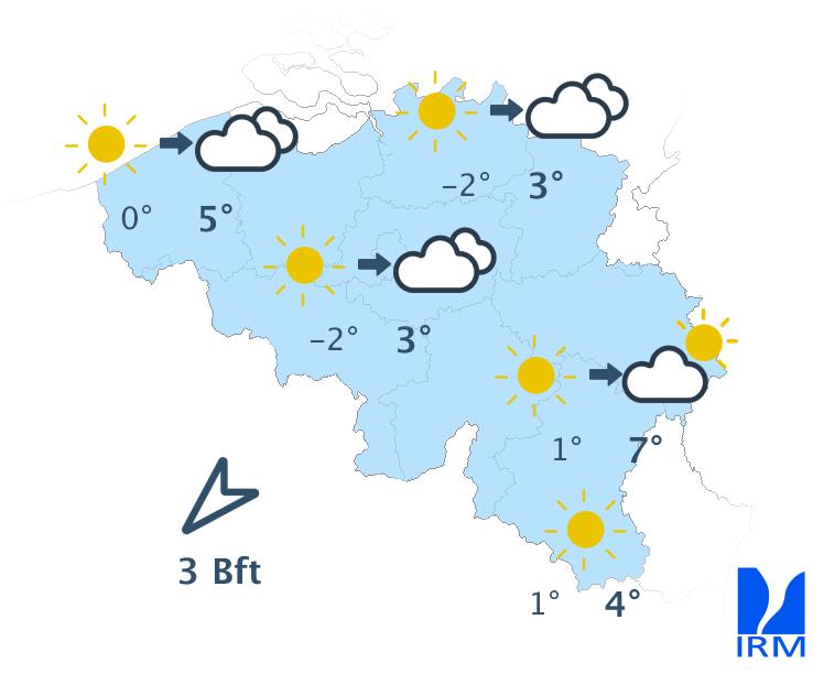 Aujourd'hui, un temps souvent ensoleillé malgré quelques champs de nuages bas temporaires depuis l'est/nord-est en cours de journée. Il fera froid avec des maxima de -1 à -2 degrés sur les hauteurs de l'Ardenne, de +1 degré dans le centre et +2 ou +3 degrés à la mer. Le vent glacial de nord-est sera modéré à parfois assez fort, et à la mer même fort par moments. Les rafales pourront atteindre des valeurs de 50 à 60 km/h, voire parfois 65 km/h.