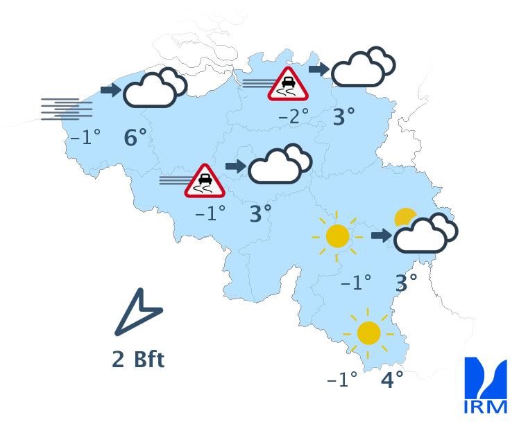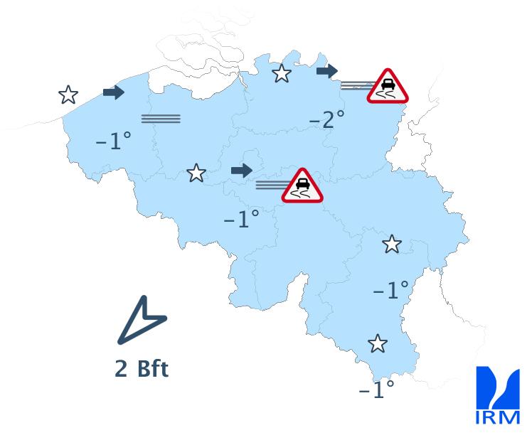 Ce soir, le ciel sera dégagé sur la plupart des régions et les températures chuteront rapidement sous la barre du 0 degré. De la brume et du brouillard, pouvant être givrant, se formeront essentiellement sur la Flandre. En fin de nuit, le brouillard pourra également s'étendre vers le nord de la Wallonie. Des plaques de givres seront également possibles par endroits. Les minima seront compris entre -6 ou -7 degrés dans certaines vallées de l'Ardenne et -1 ou -2 degrés au littoral, sous un vent de nord-est faible, à parfois modéré à la côte et sur les hauteurs de l'est.