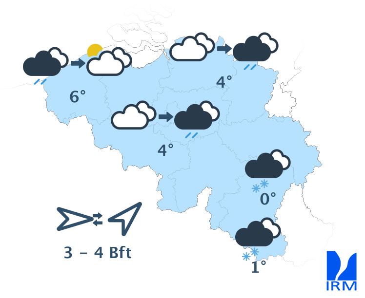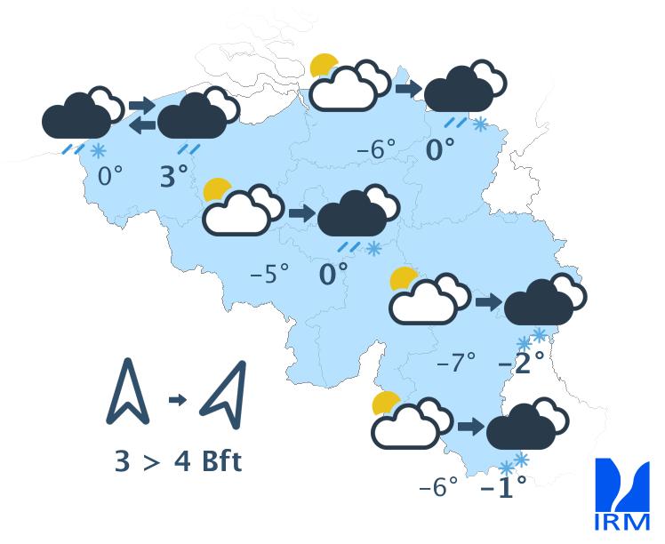 En ce premier jour de l'An, le ciel sera assez nuageux avec un temps d'abord sec dans la plupart des régions. En Ardenne et en Gaume, les nuages bas et de faibles chutes de neige pourront parfois réduire la visibilité. L'après-midi, une zone de précipitations traversera le pays du littoral vers l'Ardenne avec de la pluie sur la partie ouest du pays, probablement de la neige fondante dans le centre et des chutes de neige un peu plus marquées en Ardenne. Le vent sera modéré de sud-ouest avec des rafales de 50 à 60 km/h, voire 70 km/h sur les hauteurs de l'Ardenne. En bord de mer, le vent sera assez fort à fort d’ouest à nord-ouest avec des rafales de 60 à 70 km/h. Les maxima varieront entre -1 degré sur les hauteurs de l'Ardenne et 6 degrés le long du littoral.
