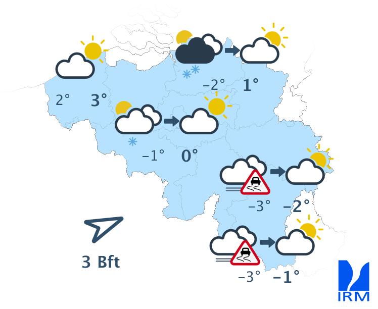 Lundi, le soleil sera présent le matin, mais les nuages bas et le brouillard givrant pourront parfois réduire la visibilité sur le sud-est du pays. Les nuages redeviendront plus nombreux en cours de journée avec possibilité de quelques averses de neige, surtout sur le nord du pays. Les maxima varieront entre -3 degrés dans les Hautes Fagnes, 0 degré dans le centre du pays et +3 degrés en nord de mer. Le vent sera généralement faible d'ouest à sud-ouest.