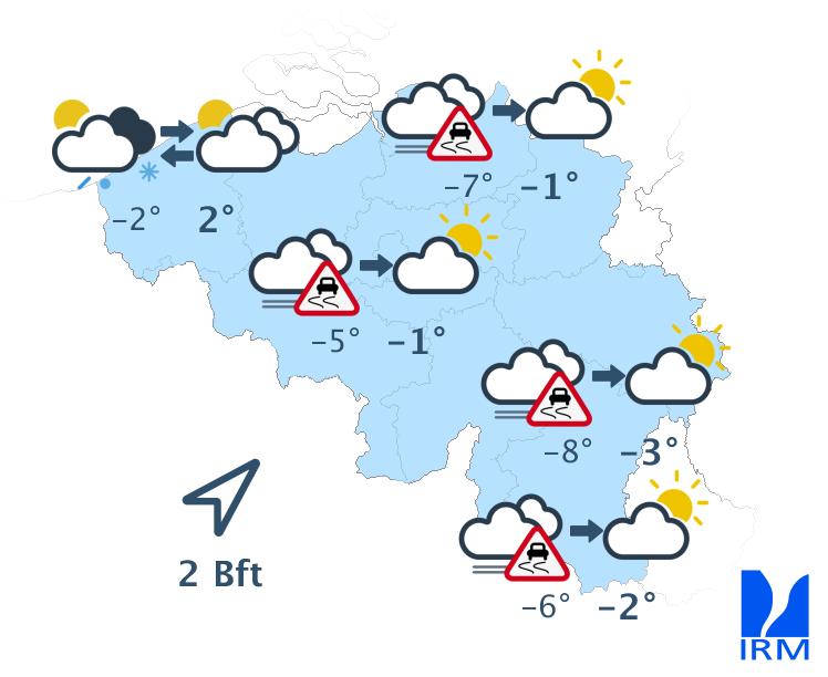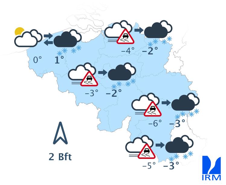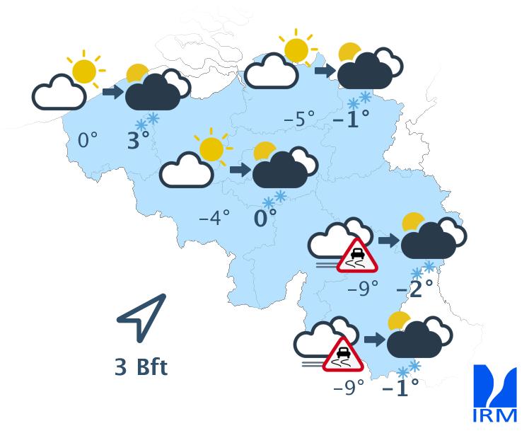 La journée de lundi commencera avec du brouillard givrant par endroits et dans le sud avec des nuages bas. Les éclaircies seront assez répandues en journée. Toutefois, quelques averses de neige seront encore possibles. Le froid restera d'actualité avec des maxima de -4 degrés en Hautes-Fagnes à +3 degrés au littoral et autour de 0 degré dans le centre du territoire, sous un vent modéré à assez fort de nord à nord-ouest à la côte, et faible à modéré d'ouest à sud-ouest dans les terres. Dans l'intérieur du pays, les gelées nocturnes seront généralisées et parfois prononcées, surtout dans les régions où la neige recouvrira le sol.