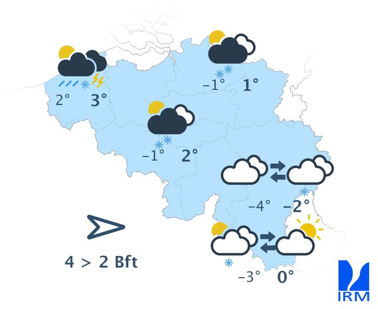 Ce matin, il sera à nouveau nuageux dans l'ouest avec graduellement quelques averses (principalement sur la moitié sud du pays et le long de la frontière française) qui pourront adopter un caractère hivernal et tomber sous forme de neige en Ardenne. Au fil des heures, davantage d'éclaircies se développeront temporairement, surtout sur la moitié nord du pays. En cours d'après-midi, les nuages reprendront le dessus depuis les Pays-Bas et de nouvelles averses à caractère hivernal se produiront. En fin d'après-midi (et principalement en soirée et durant la nuit) et durant les averses les plus intenses, une petite accumulation de neige sera possible même dans les régions de plus basse altitude par endroits. Les maxima varieront de -1 degré sur les hauteurs de l'Ardenne à + 4 degrés à la mer, avec des valeurs de +2 ou +3 degrés dans le centre. Le vent sera modéré de secteur ouest et les pointes atteindront 55 km/h ou même un peu plus dans le nord du pays. A la mer, le vent sera assez fort de nord-ouest avec des rafales de 60 à 65 km/h.
