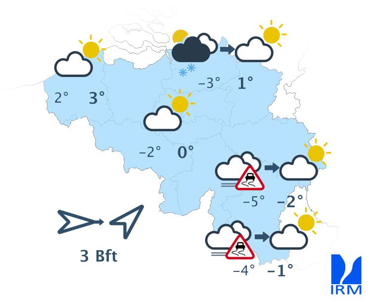 Mardi matin, il y aura dans certaines régions un risque de brouillard givrant. Les plus belles éclaircies sont attendues sur l’ouest et le centre du pays. Sur le nord, une averse de neige reste possible. Les maxima oscilleront entre -3 ou -4 degrés sur les Hautes Fagnes et +3 ou +4 degrés à la côte.