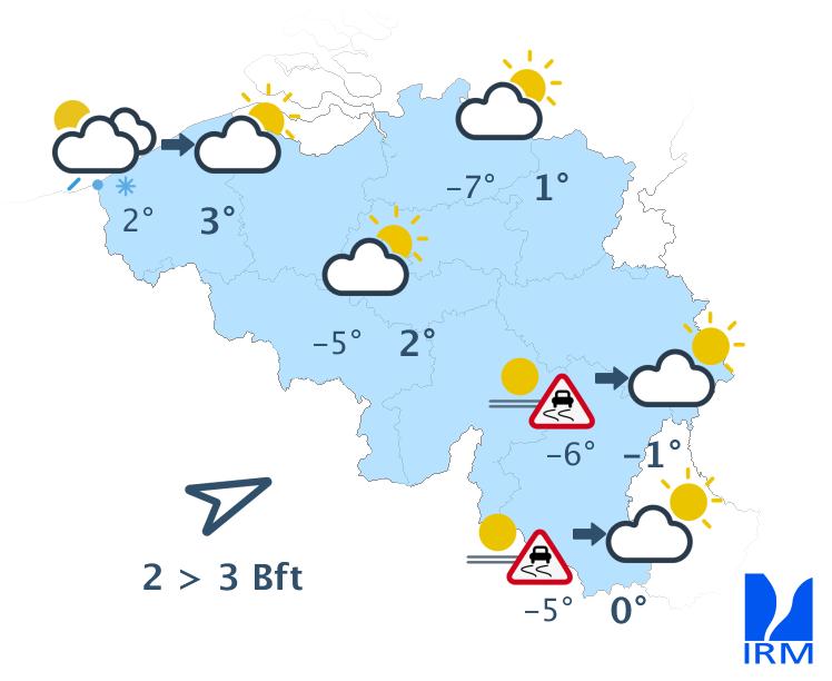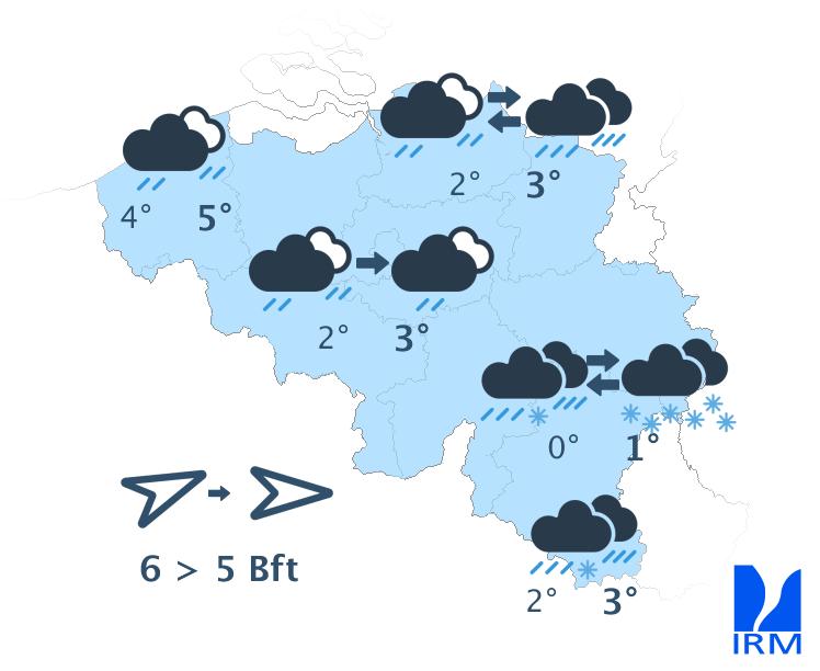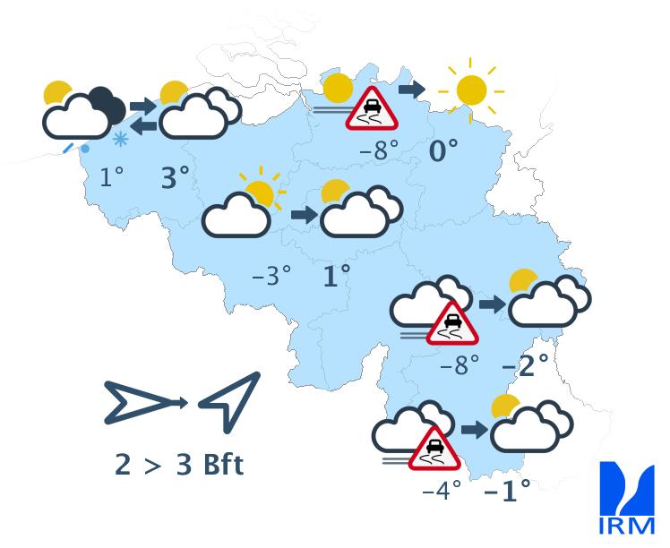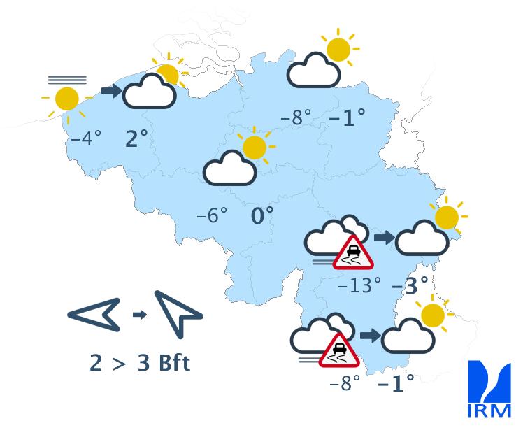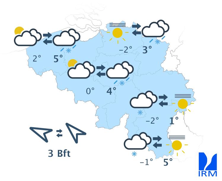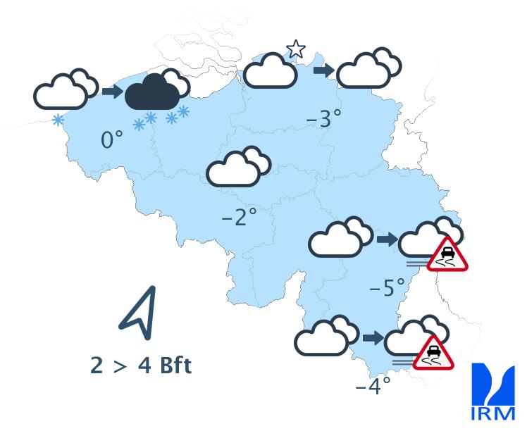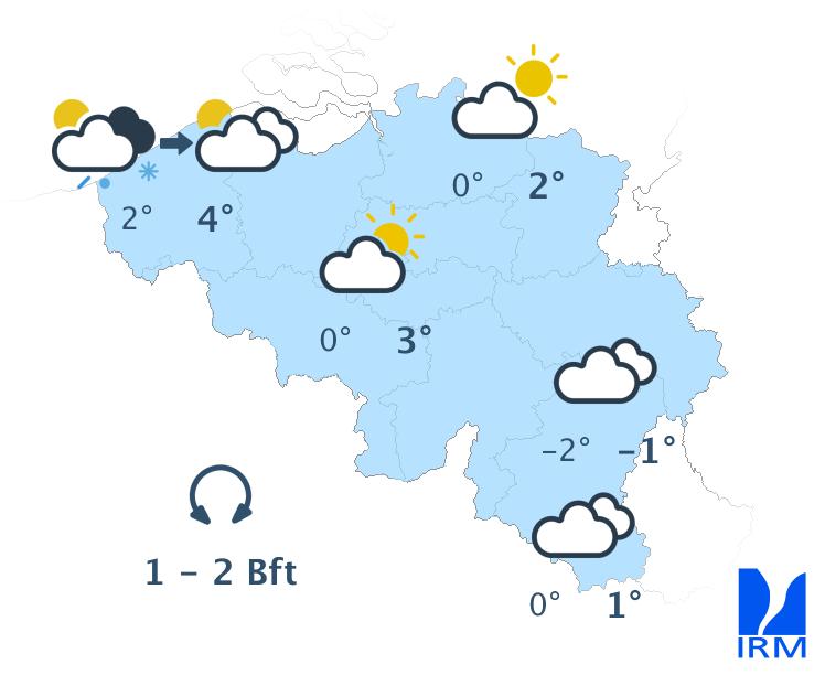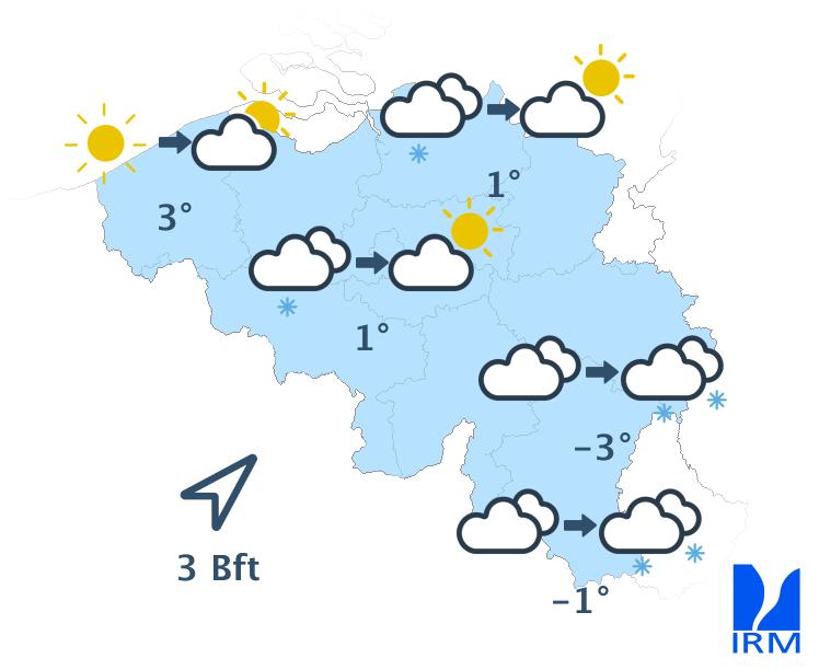 Ce matin, la nébulosité deviendra abondante sur l'ensemble des régions avec des averses de neige sur l'ouest qui progresseront ensuite vers le centre et l'Est. Des bancs de brouillard givrant pourront être également présents surtout dans le sud du pays. L'après-midi, de larges éclaircies reviendront temporairement par le littoral. Les maxima varieront de -3 degrés en Hautes-Fagnes à +3 degrés à la mer, avec des valeurs autour de 0 degré dans le centre. Le vent sera faible à modéré d'ouest à sud-ouest dans l'intérieur du pays. A la mer, le vent modéré d'ouest-nord-ouest deviendra assez fort et virera au nord-ouest.